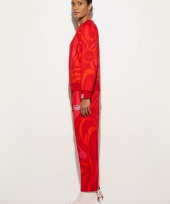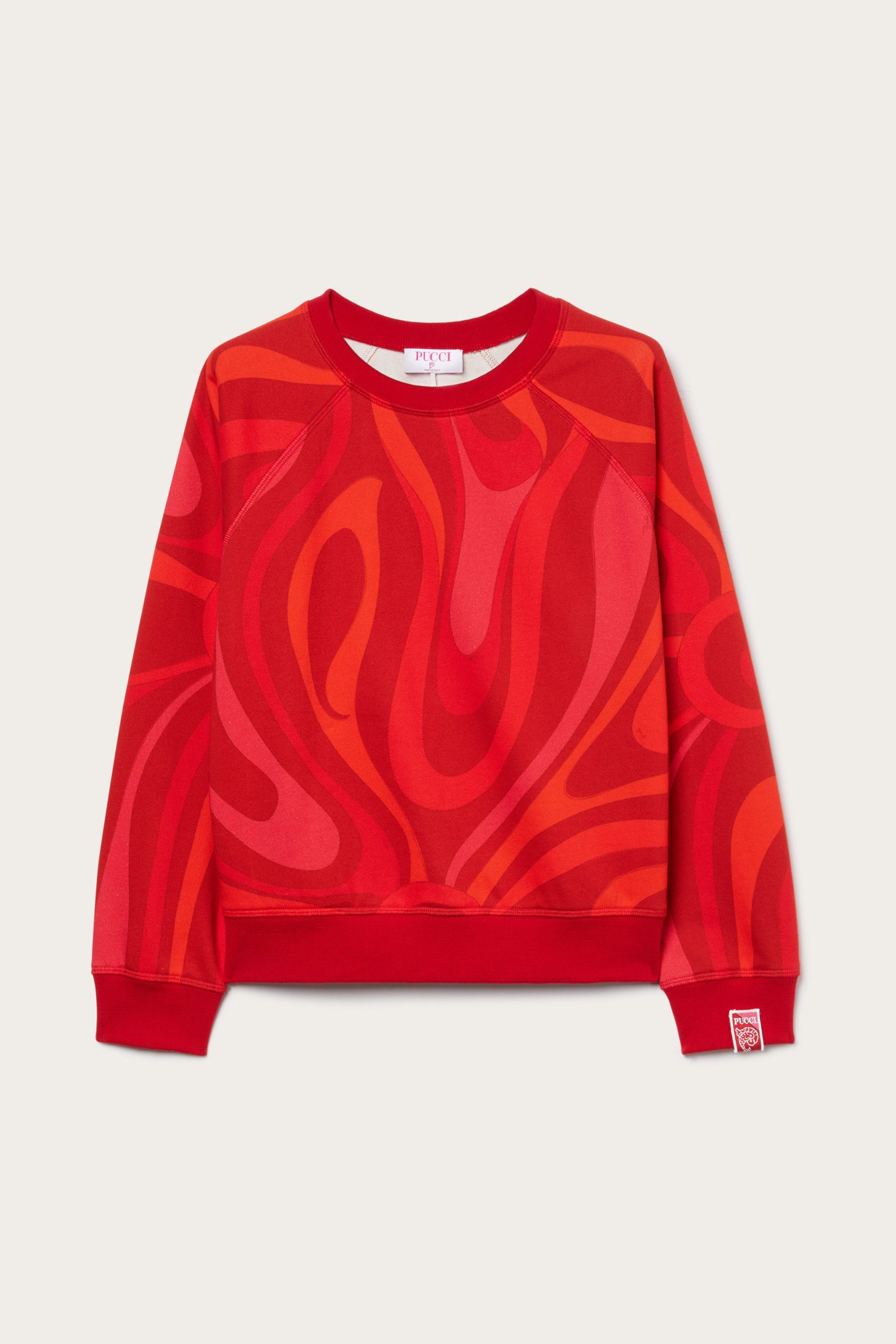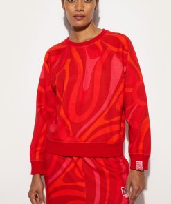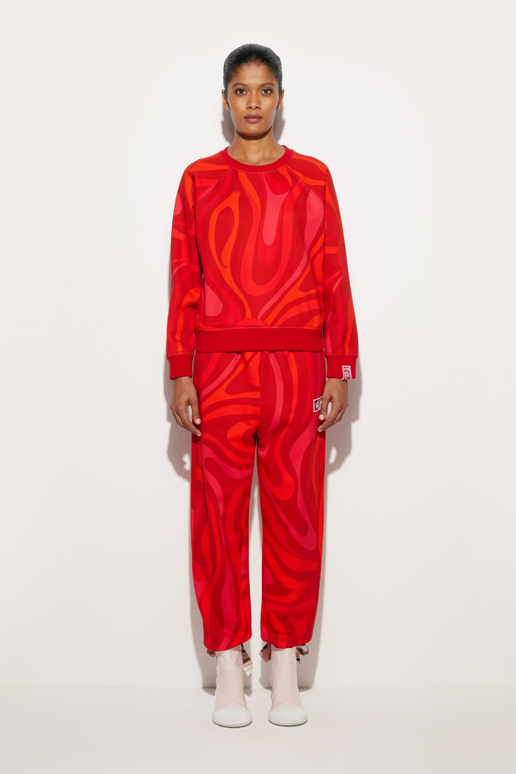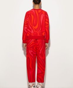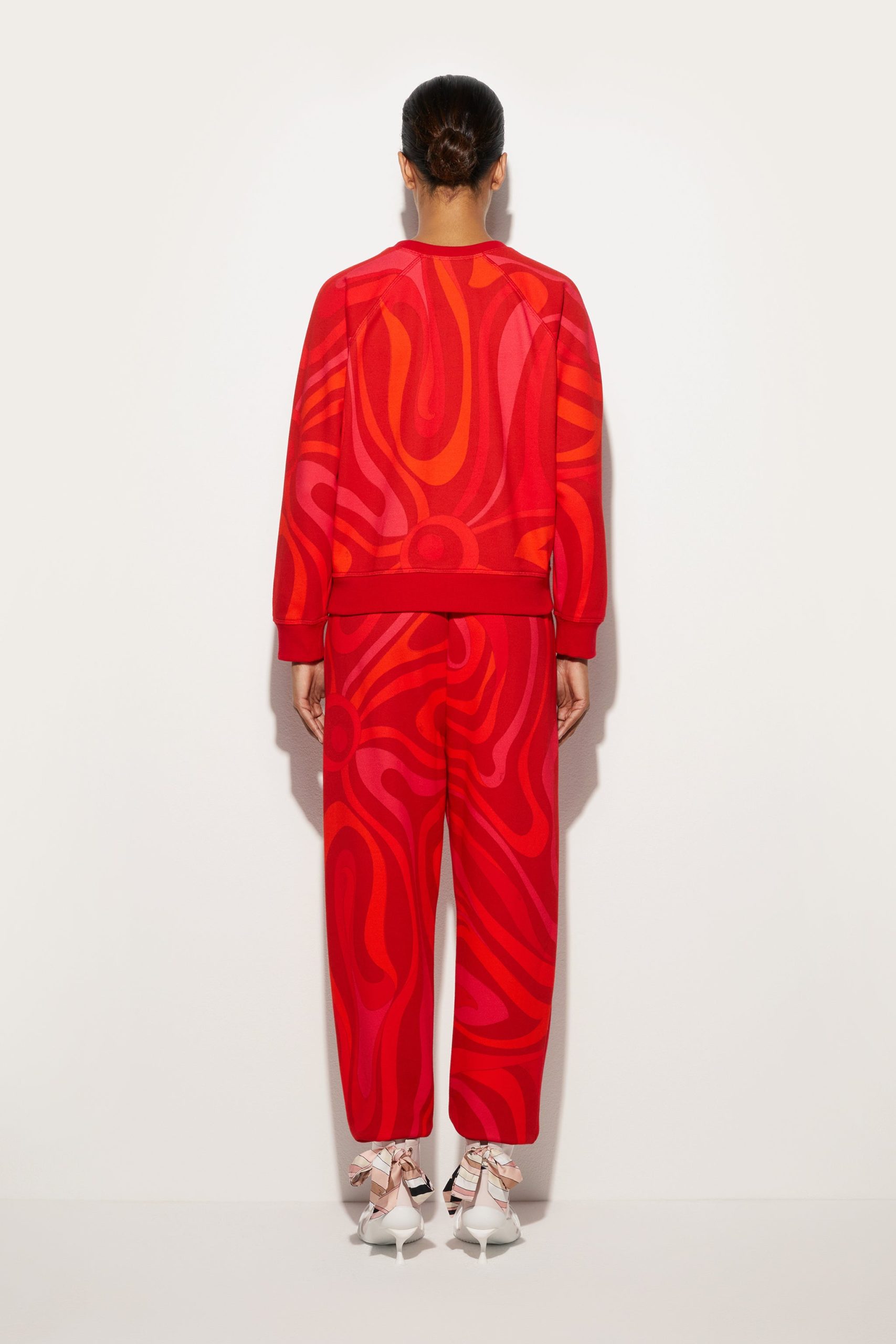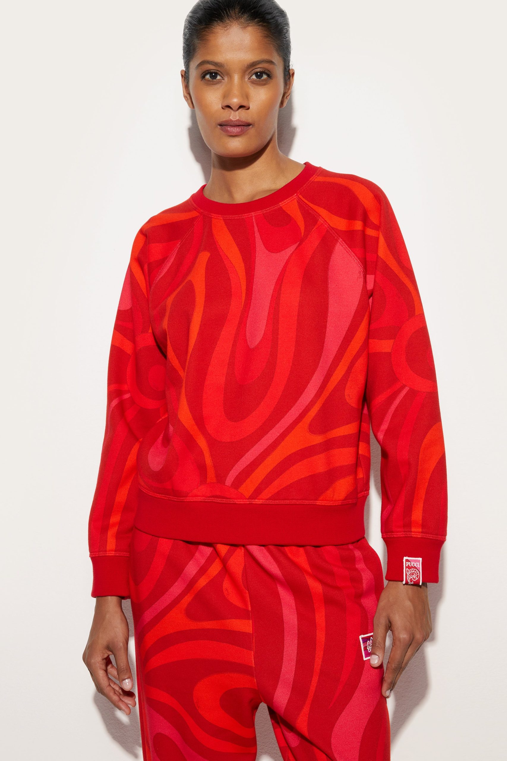Style and comfort embrace in this warm fleece sweatshirt with Red-colored Marmo print that combines the softness of materials with the dynamism of PUCCI’s iconic graphics. Ribbed trims on the waist, cuffs and neckline create a fitted silhouette, perfect for a casual yet refined look, in the city as well as in moments of relaxation. It is easily paired with tailored-cut pants, denim or its matching pants, for a style that ranges between elegance and versatility capturing the metropolitan spirit with a hint of contemporary sophistication.