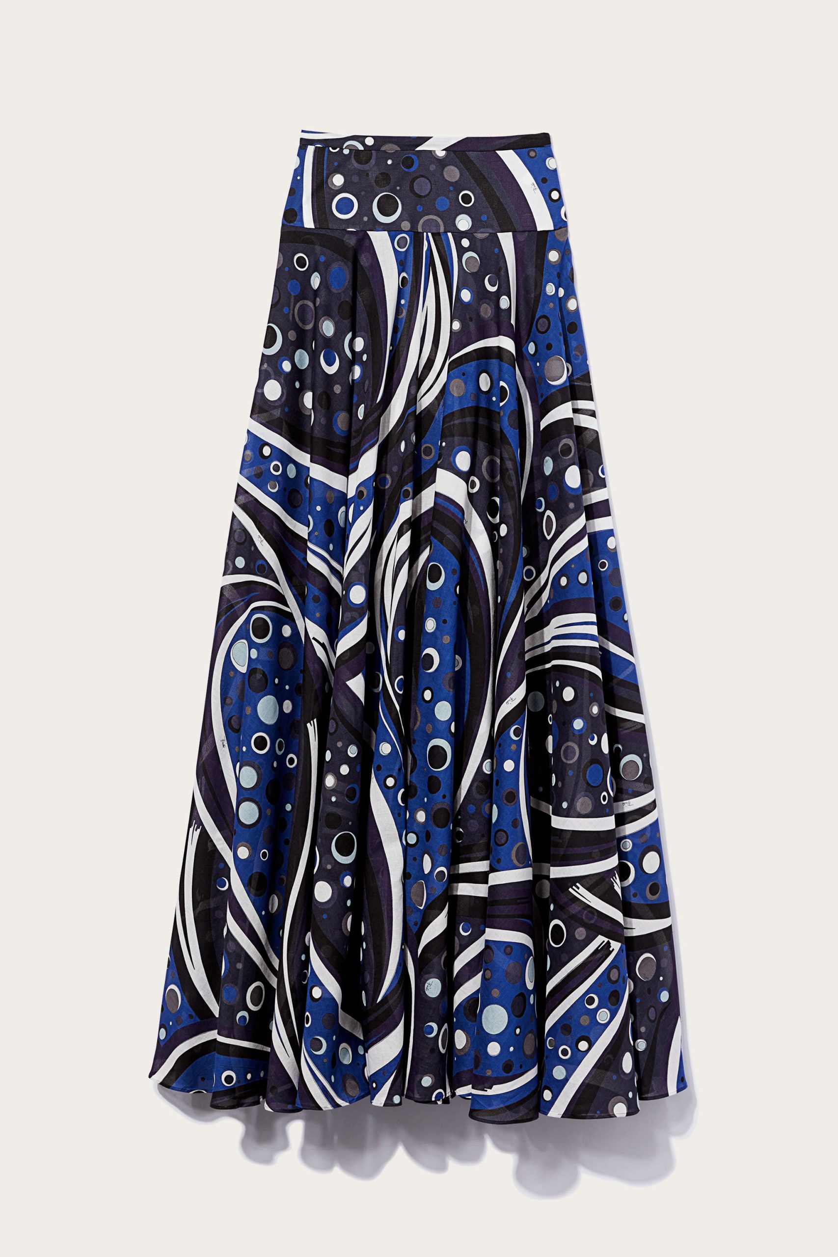 A celebration of Pucci’s storied pattern play, this skirt features the Fontane print in a nautical blue colour palette. It’s cut from swathes of cotton muslin to a pleated silhouette that flares out at the hip.