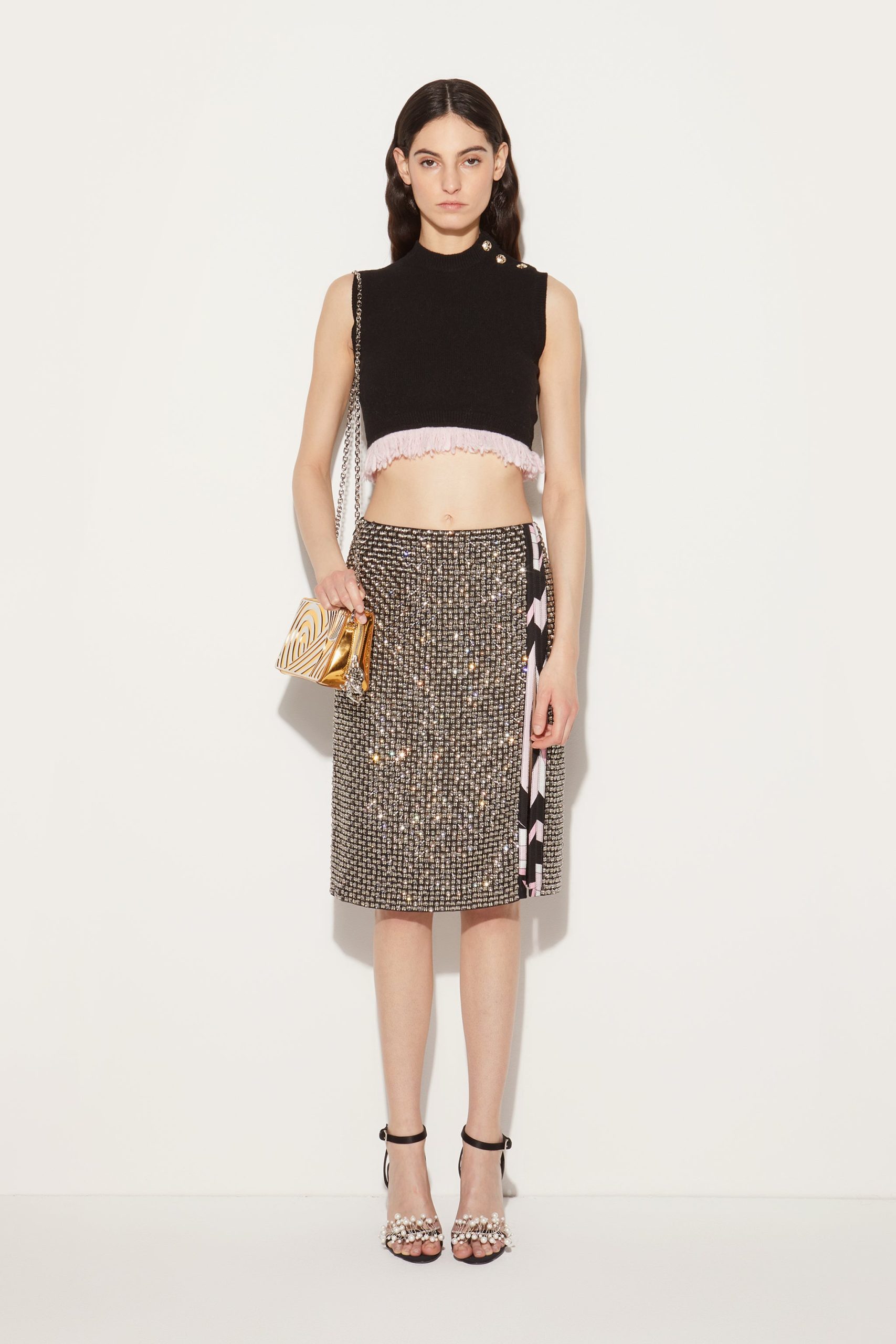 A testament to Pucci’s playful vision, this crop top is framed by pale pink fringing along the hem. It’s cut from virgin wool and cashmere to a slim silhouette and finished with gold-tone metal buttons at the shoulder.