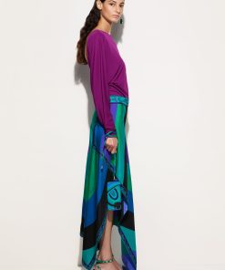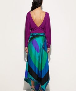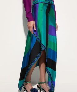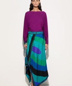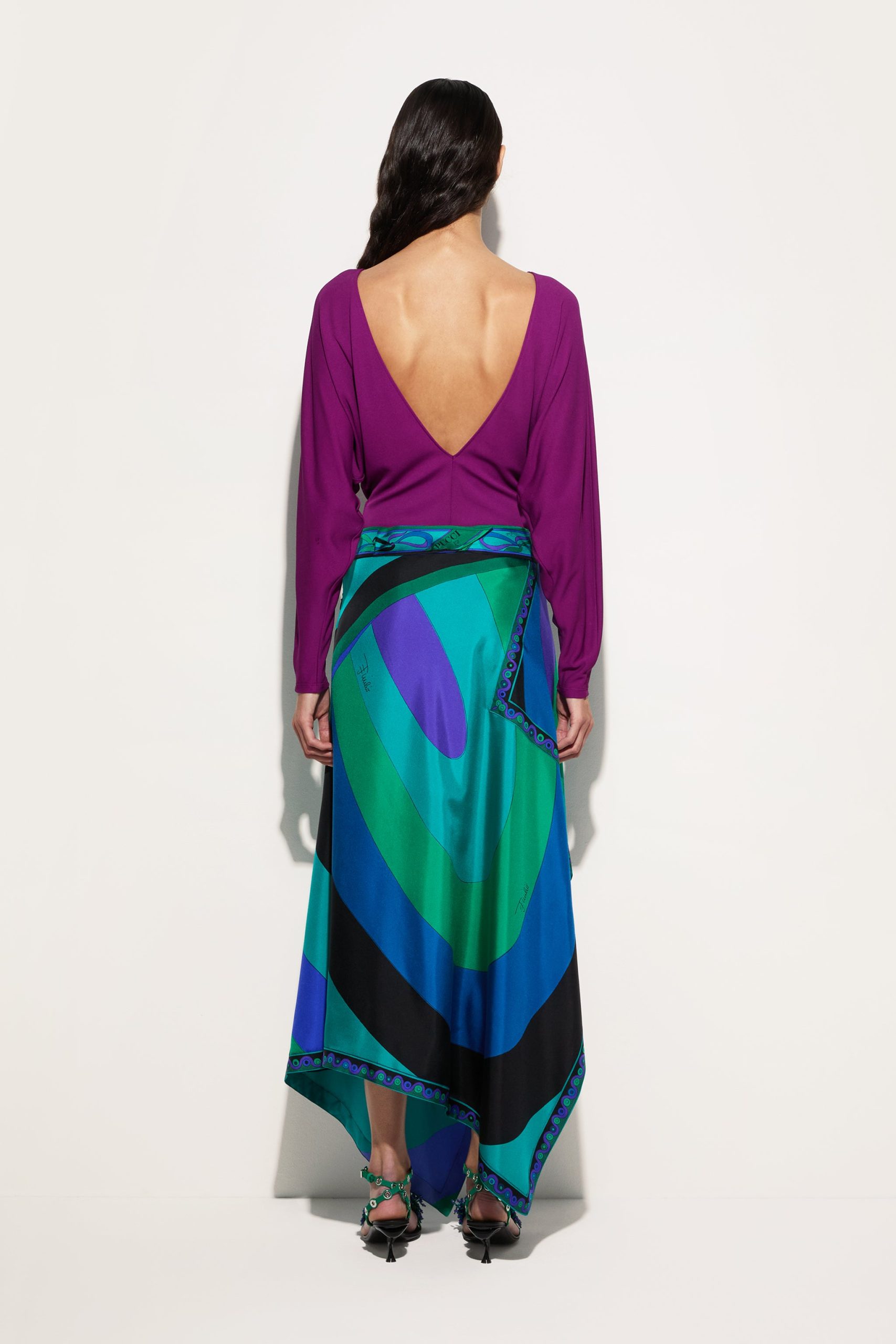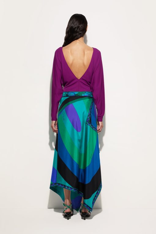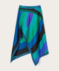 This asymmetrical skirt, with its sinuous hemline from knee to ankle, embodies elegance and movement, designed to enhance the silhouette with a sophisticated and dynamic touch. Generous draping creates a fluid and refined effect, while the defined band adds structure to the design.The Iride print in emerald, with its iconic and bold design, lends distinctive character to a garment that lends itself to any special occasion.