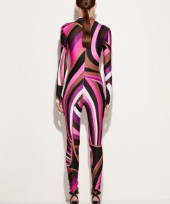 Camille Miceli takes Pucci’s maximalism to new heights with this catsuit. It’s cut from stretch Lycra to a bodycon silhouette and drenched in the Iride print’s rays in pink and purple hues.