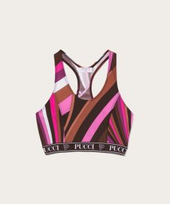 This athletic crop top is enlivened by the dynamic stripes of the heritage Iride print. It’s cut to a scoop-neck, racerback silhouette and fitted with a logo-jacquard underband.
