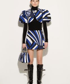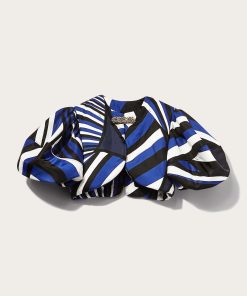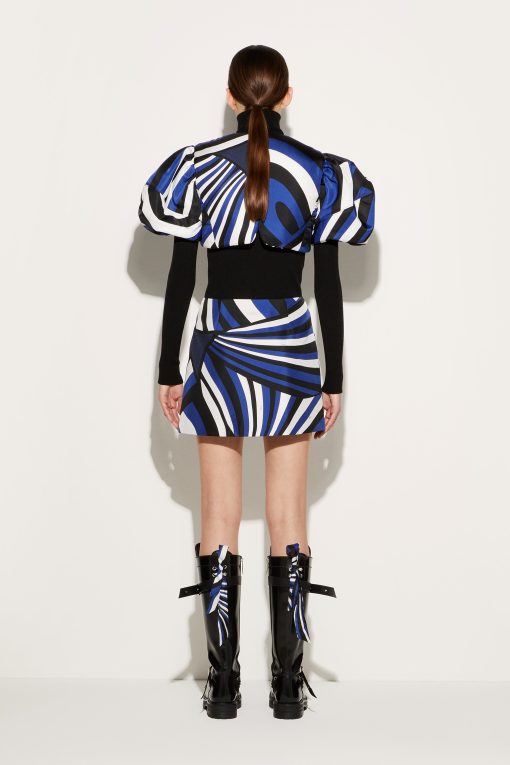 This jacket encapsulates Pucci’s high-octane impact, thanks to its cropped puff-sleeve silhouette and hypnotic Iride print. It’s cut from silk and is finished with a crystal-encrusted metal plaque at the neck.
