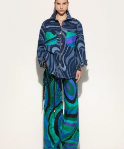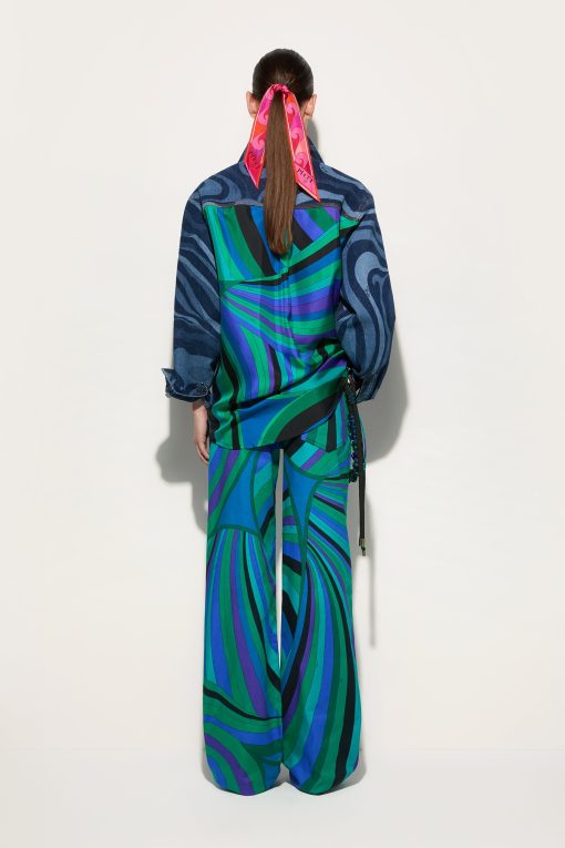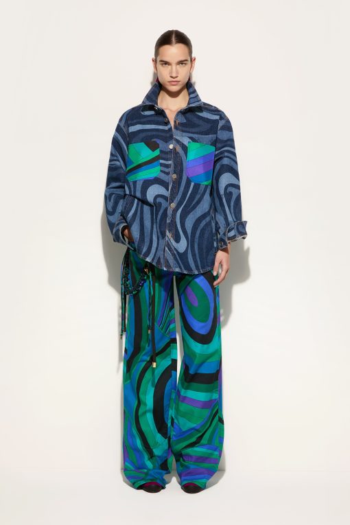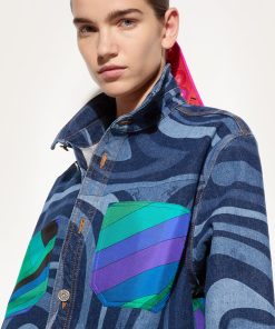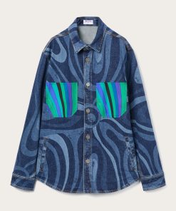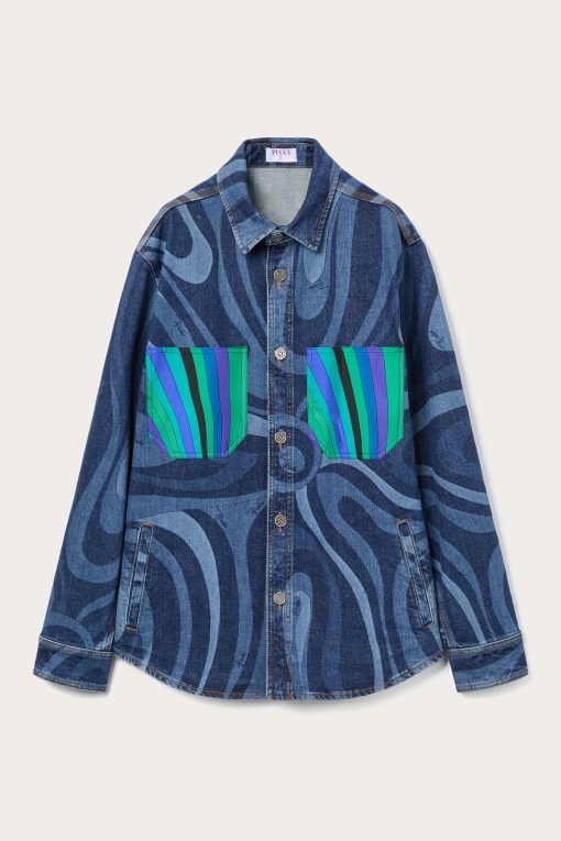 A garment that combines the timeless appeal of denim with the vibrant energy of the iconic Iride print. This straight-cut jacket is the perfect balance of casual and sophisticated, ideal for those who like to stand out with unique details. With its classic collar, buttons along the opening, and practical chest pockets, it easily adapts to everyday or bolder looks.The real surprise? The printed silk back that gives a touch of originality and luxury. Wear it with a pair of jeans for a total denim look.