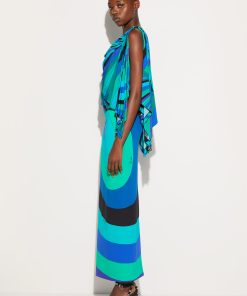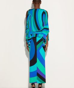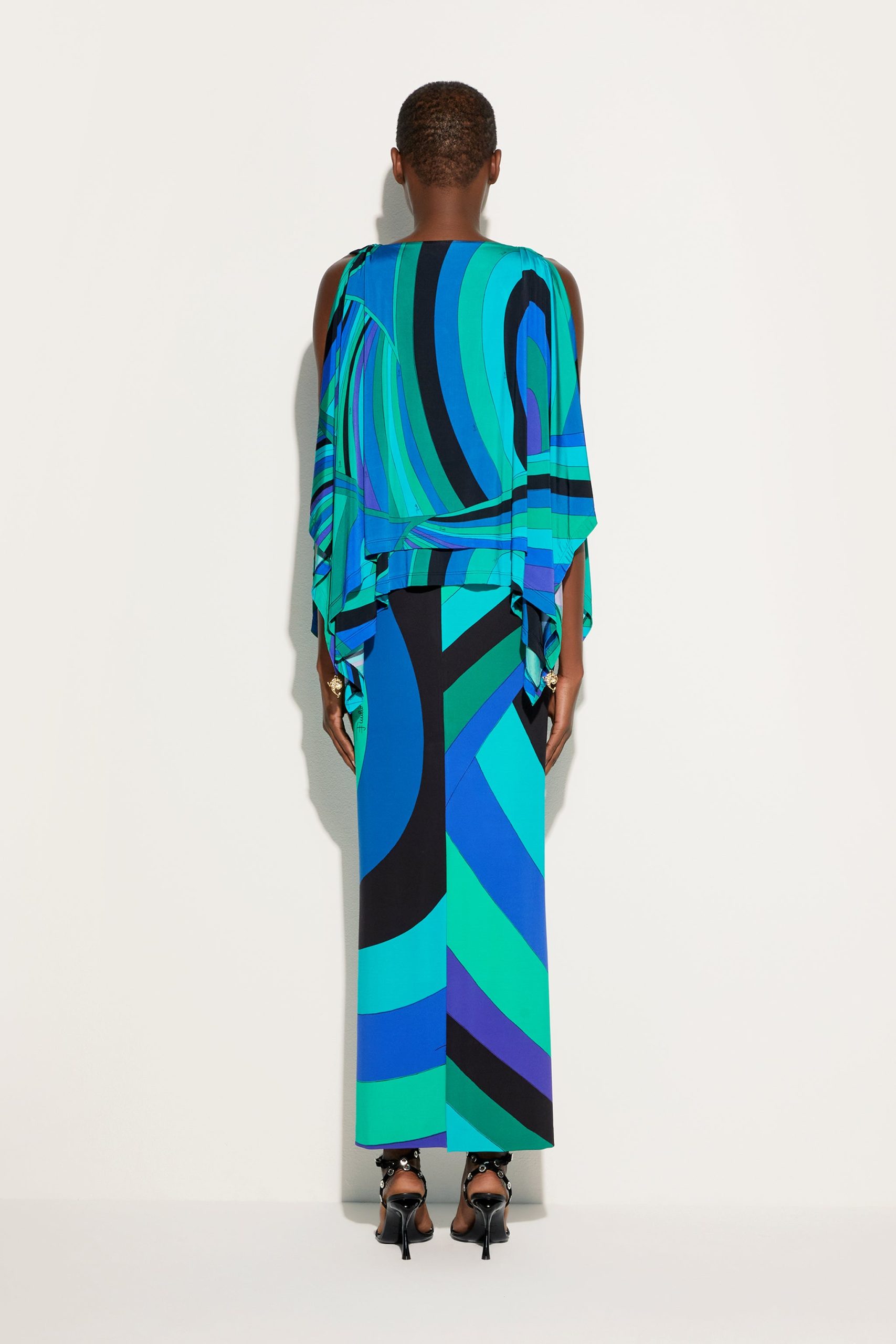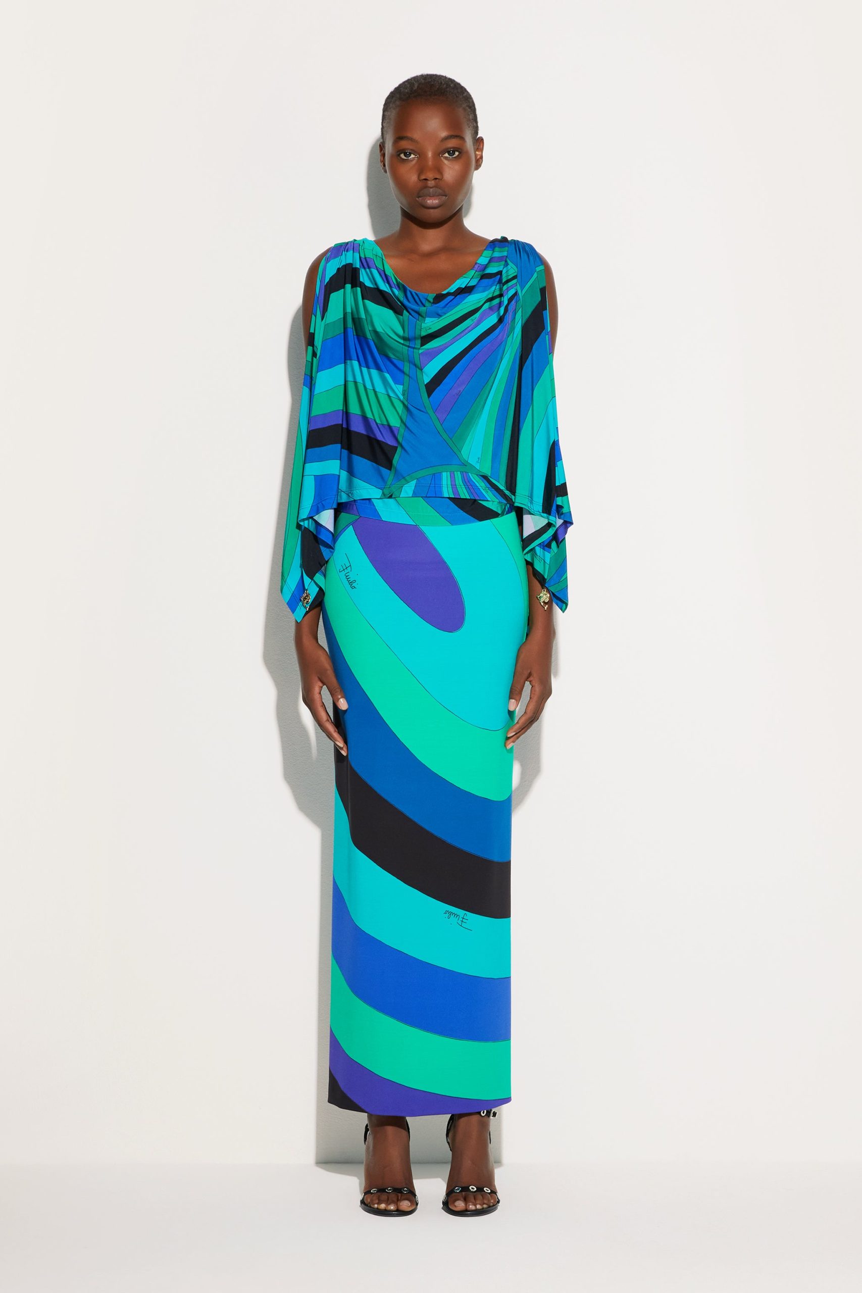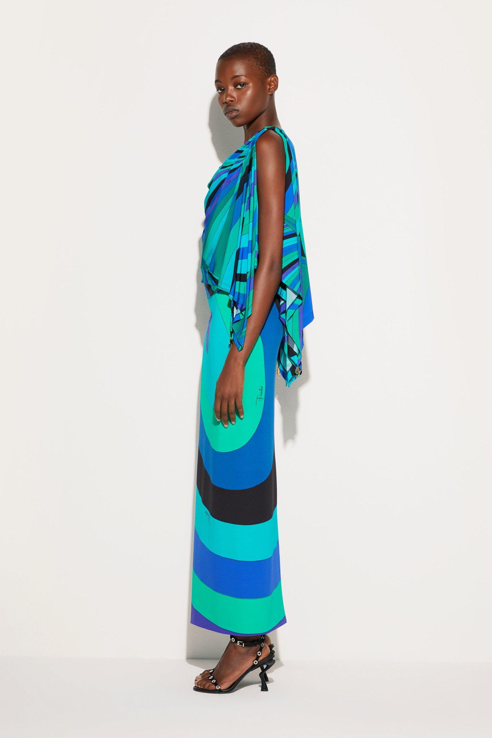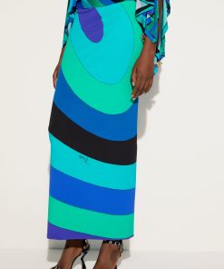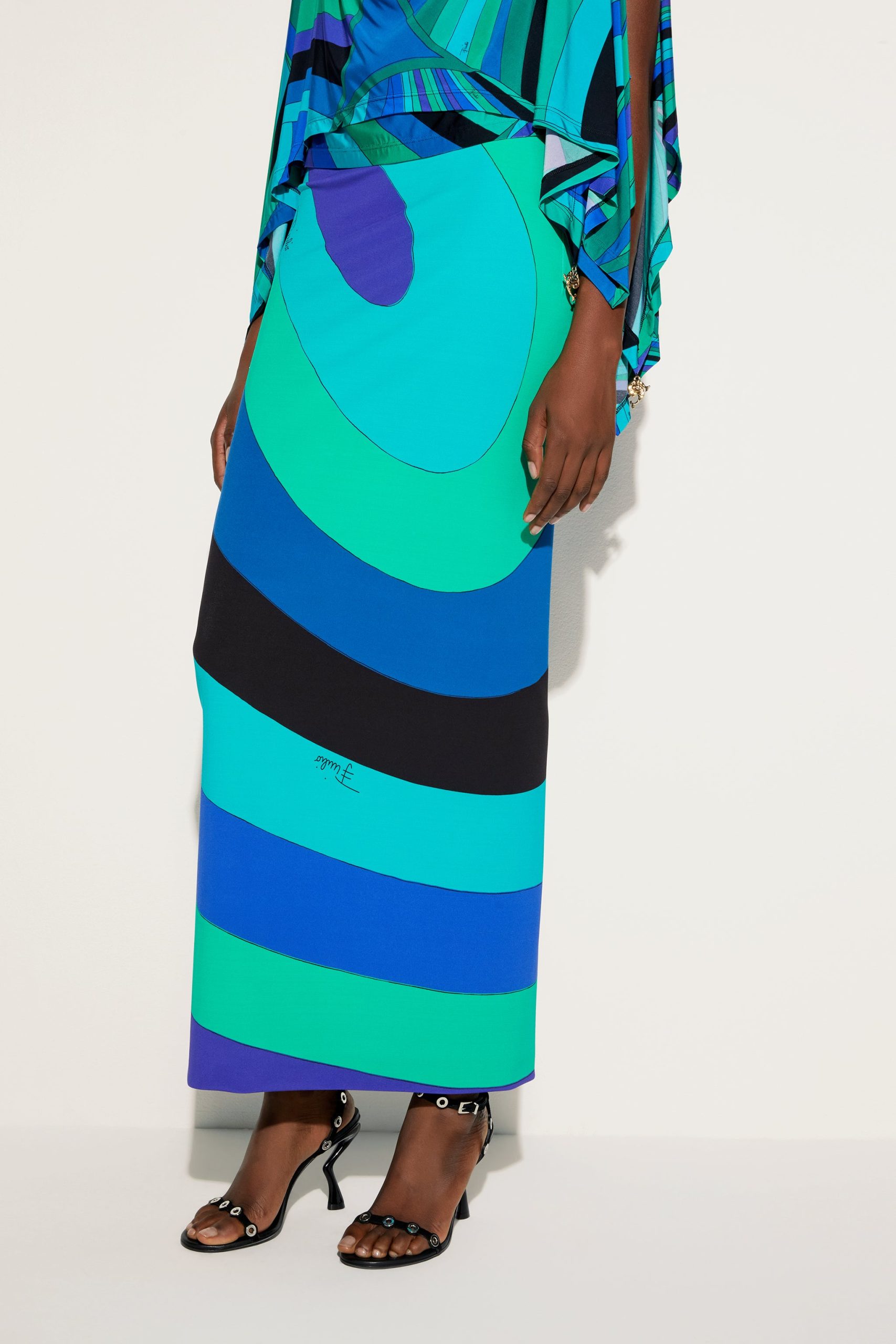 An icon of femininity that sculpts the silhouette with elegance. This high-waisted skirt is form-fitting thanks to the super-stretchy compact viscose jersey, which offers a slightly compressive effect to flatter the figure. The calf length and fitted fit create a refined and modern look, while the Iride print in vibrant emerald adds a distinctive graphic touch, an expression of Pucci’s unmistakable style.