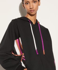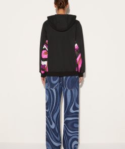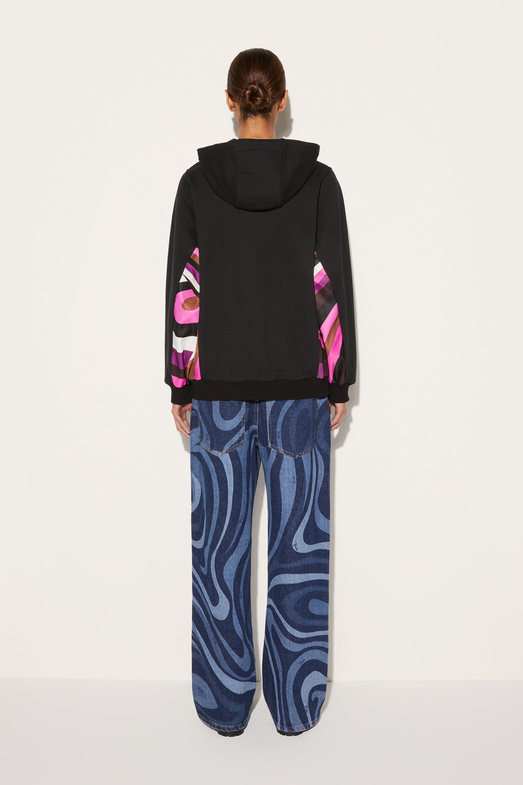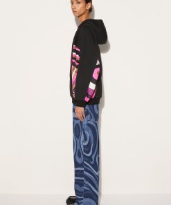 Camille Miceli imbues this hoodie with flashes of Pucci’s lively pattern play. The prismatic lines of the Iride print pop against the black backdrop in vibrant shades of pink, purple and brown.