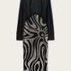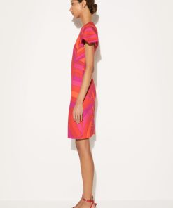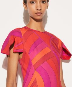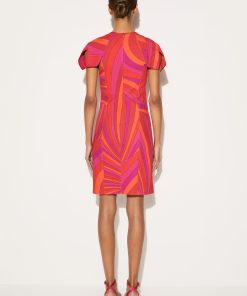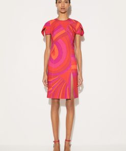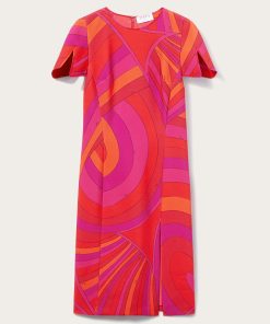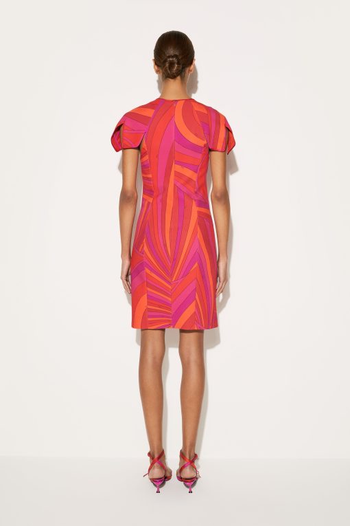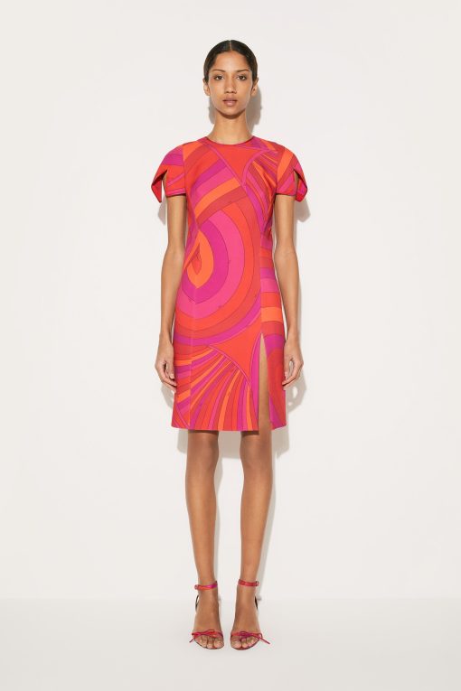Camille Miceli showcases Pucci’s tailoring expertise with this dress. It’s cut from cady to a sleek silhouette with fluttering split sleeves, and is adorned with the hypnotic lines of the Iride print.