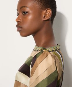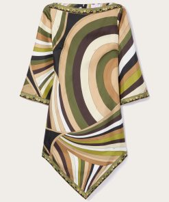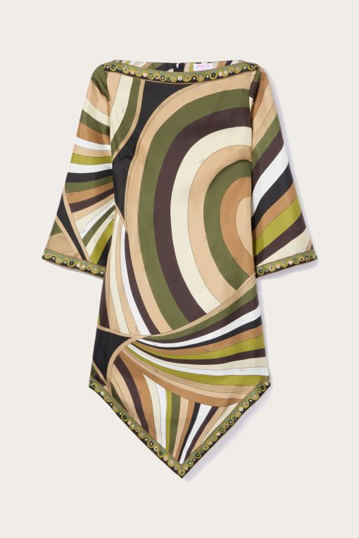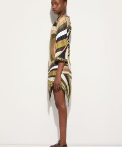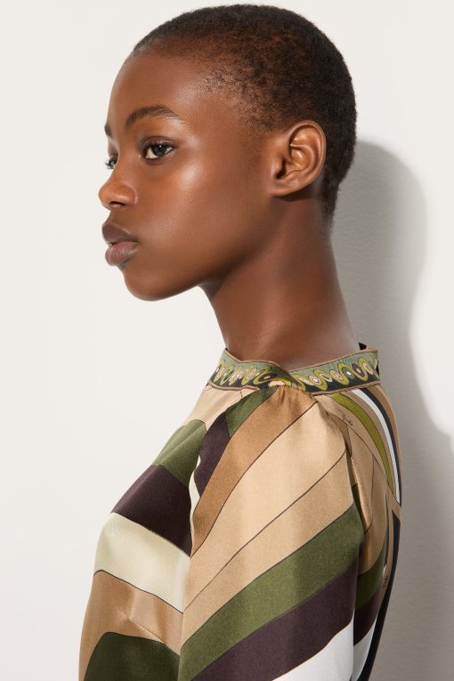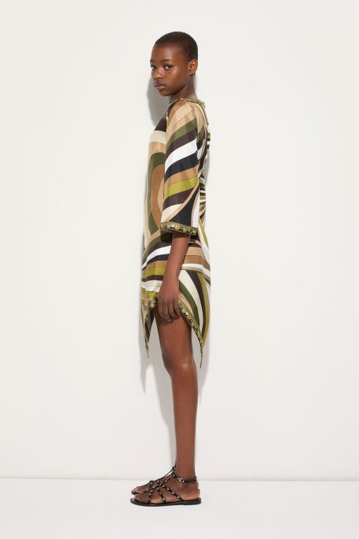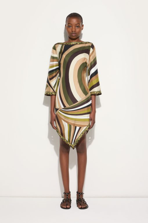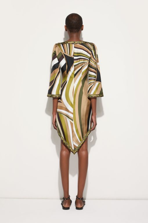 Lightweight, sophisticated and with unmistakable graphic appeal. This high-neck mini dress combines essential lines and fluid details, with a straight silhouette enhanced by wide elbow-length sleeves and an asymmetric hemline that lends movement and dynamism. Made of 100% silk, it hugs the body with extreme lightness, while the khaki-hued Iride print adds depth and character. Perfect for those who love versatile and impactful garments that combine elegance and modernity.