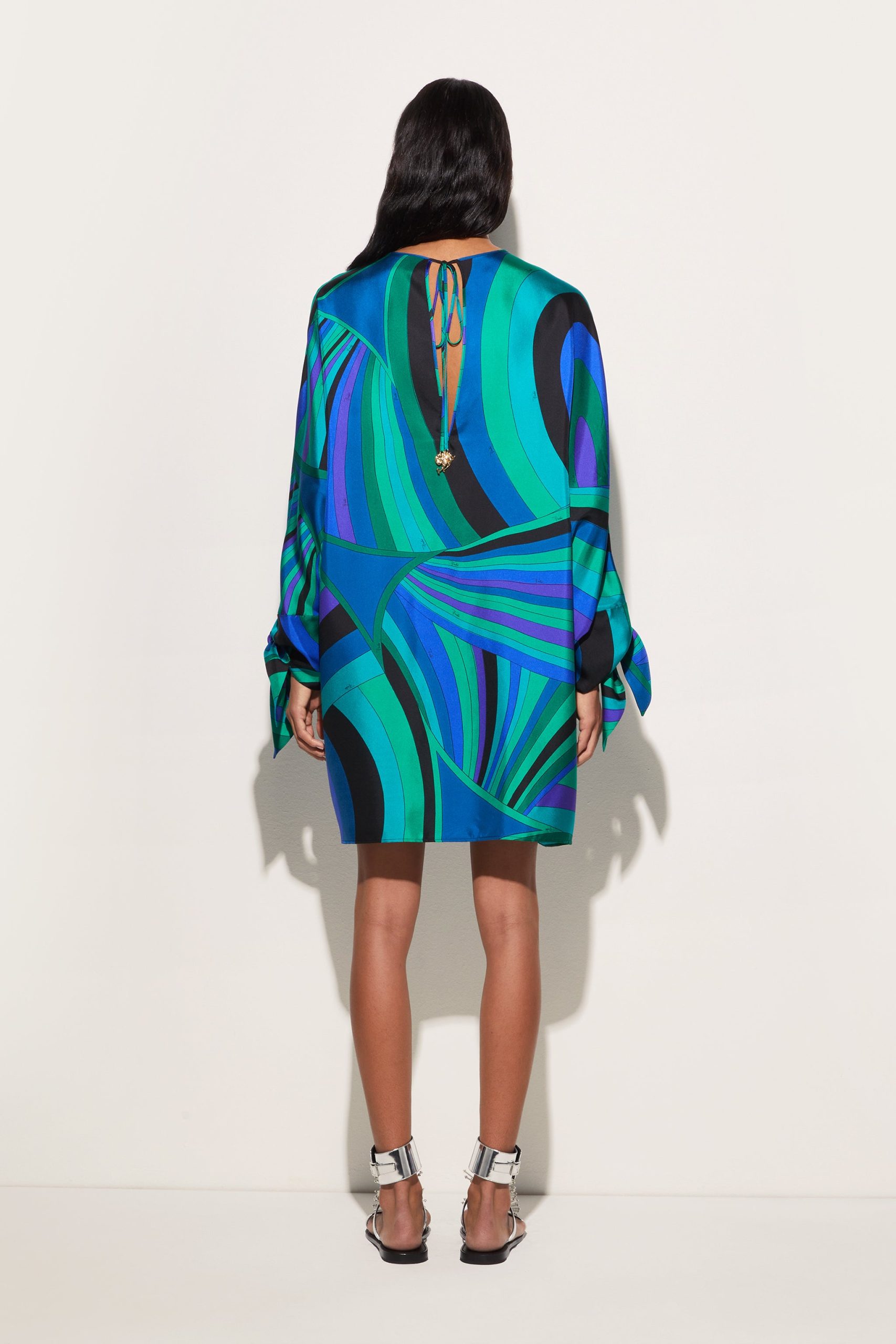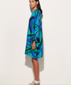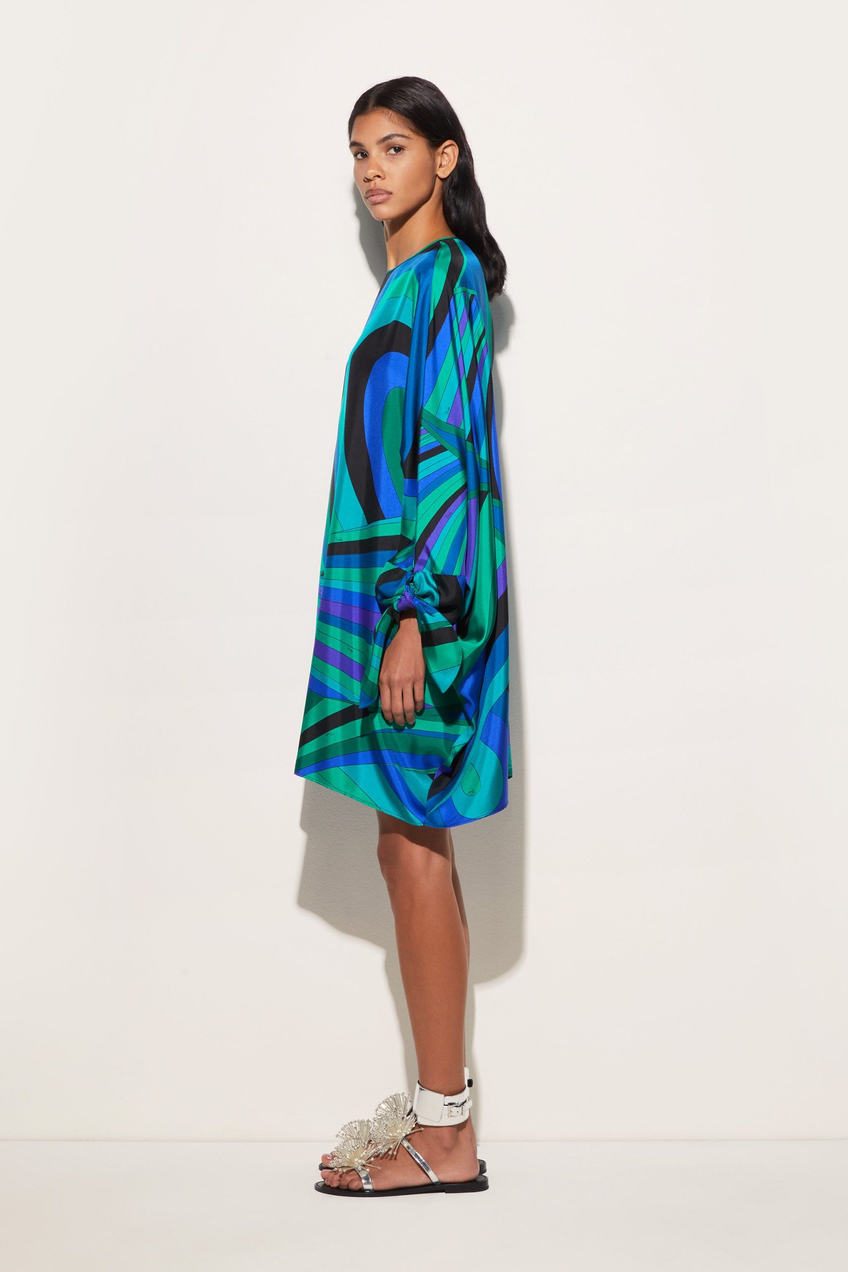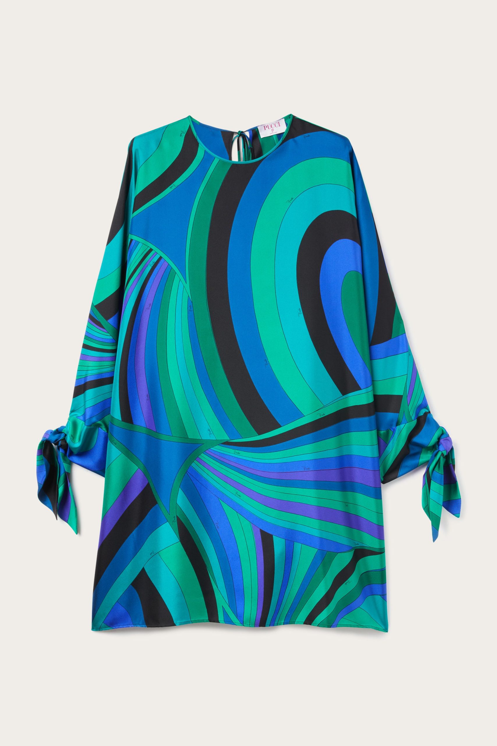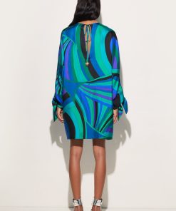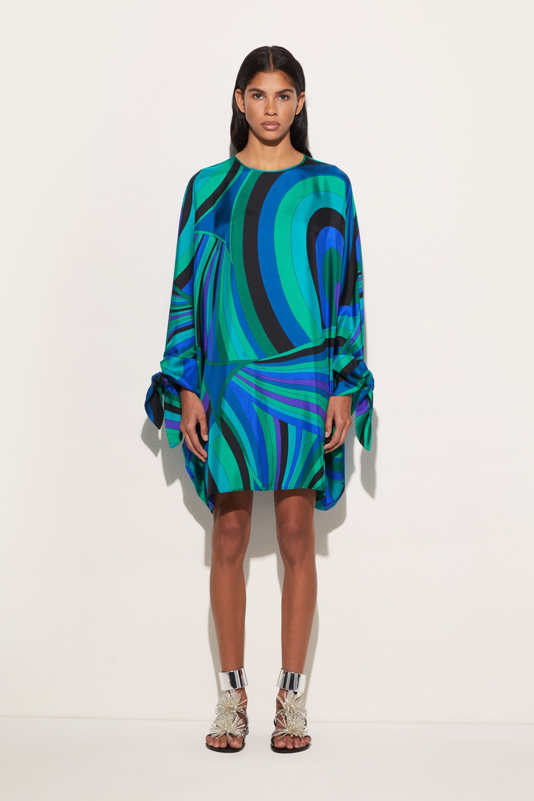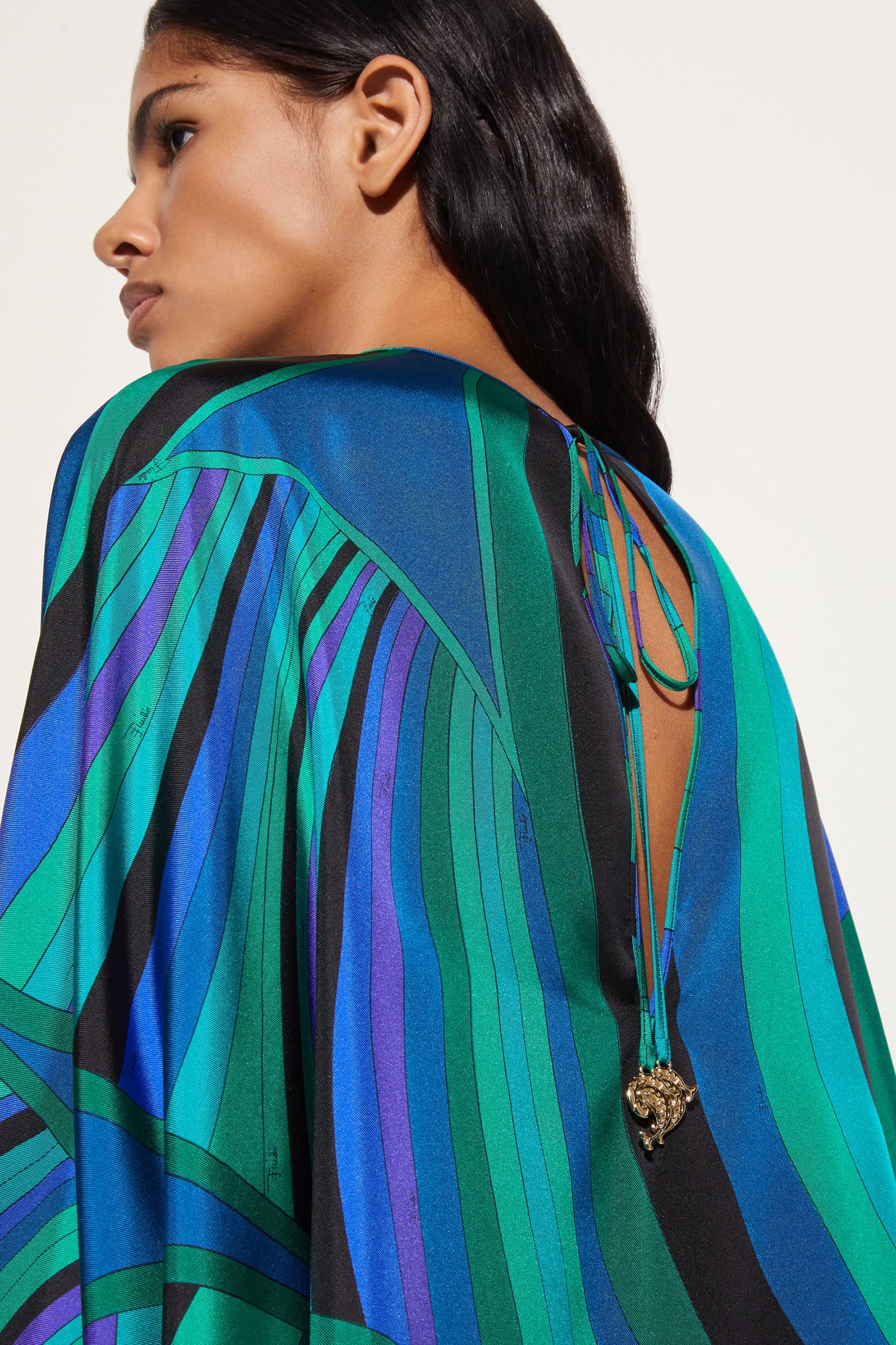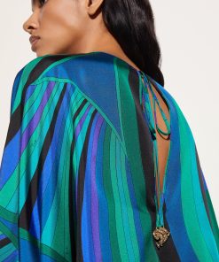 A garment with an ethereal silhouette that embodies the relaxed elegance typical of the Pucci style. This fluid caftan features a round neckline and long cape sleeves, creating a delicate play of volume and movement. Ties at the cuffs add a refined touch, allowing the fit to be adjusted gracefully and lightly.The emerald-colored Iride print gives the fabric a dynamic and sophisticated effect, making this kaftan perfect for relaxed moments and special occasions in comfort and style.