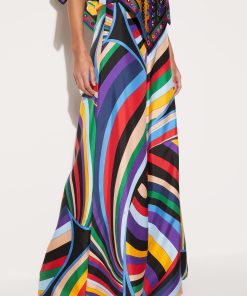 These trousers celebrate Pucci’s maximalist mood: they’re stamped with the Iride print in an array of bold colours. An impactful silhouette, they’re cut from silk twill to an exaggerated wide leg that falls to a sweeping floor length.