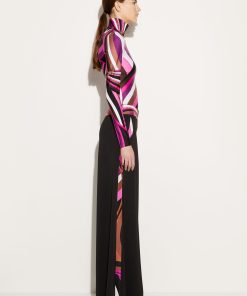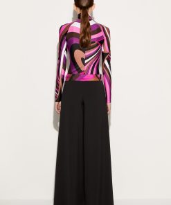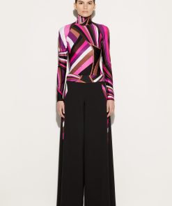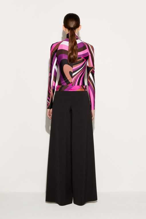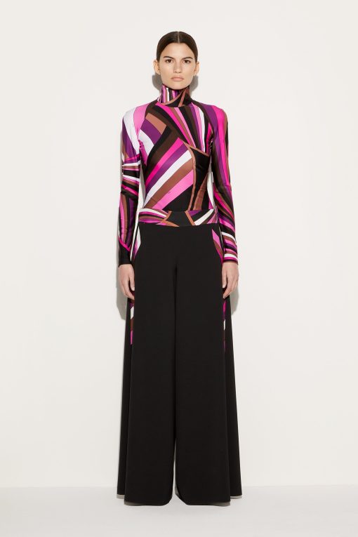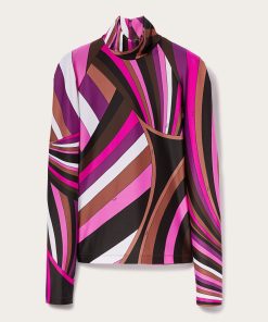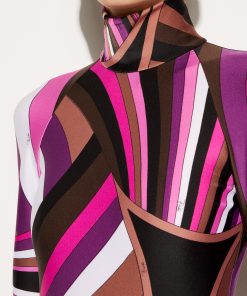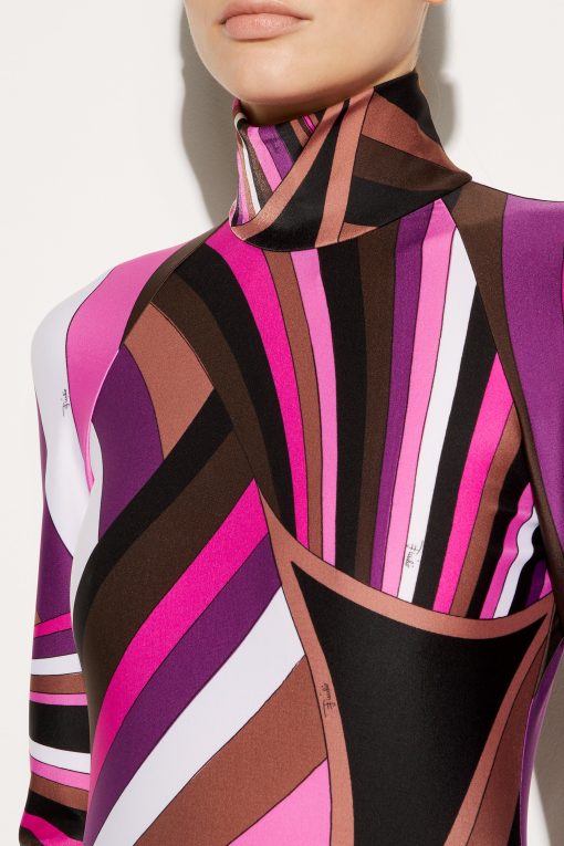 Illustrating Pucci’s love for ever-enchanting patterns, this top is splashed with the Iride print in vibrant pink and brown hues. It’s cut from Lycra to a slim silhouette framed by a mock neck and long sleeves.