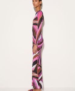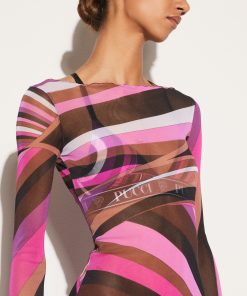 This semi-sheer tulle dress is decorated with the Iride print’s energetic rays in a medley of vibrant pinks. The boat neckline is an enduring Pucci signature.