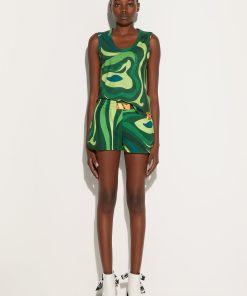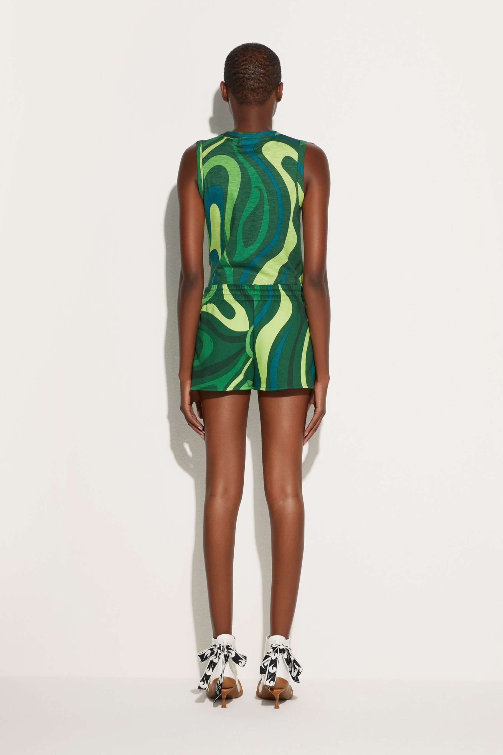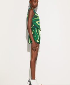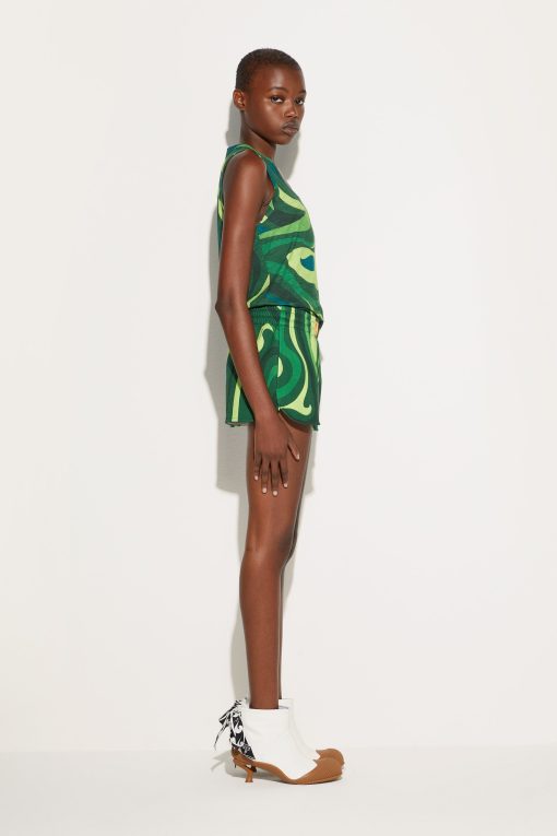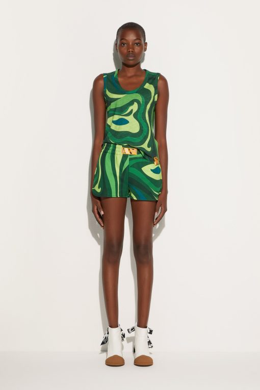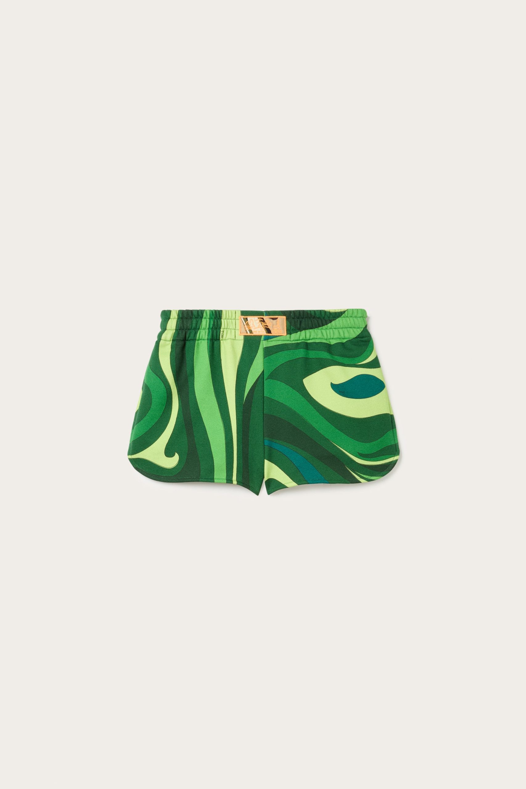 Green-colored Marmo print jogger shorts feature a “poofy” fit that adds volume and practicality to one of the brand’s most iconic graphics. Elasticized waist and hems provide the ideal comfort and fit for a cool, versatile look.Pair with the matching T-shirt or sweatshirt for a complete look that knows how to mix cheerful Pucci elegance with a sporty spirit.