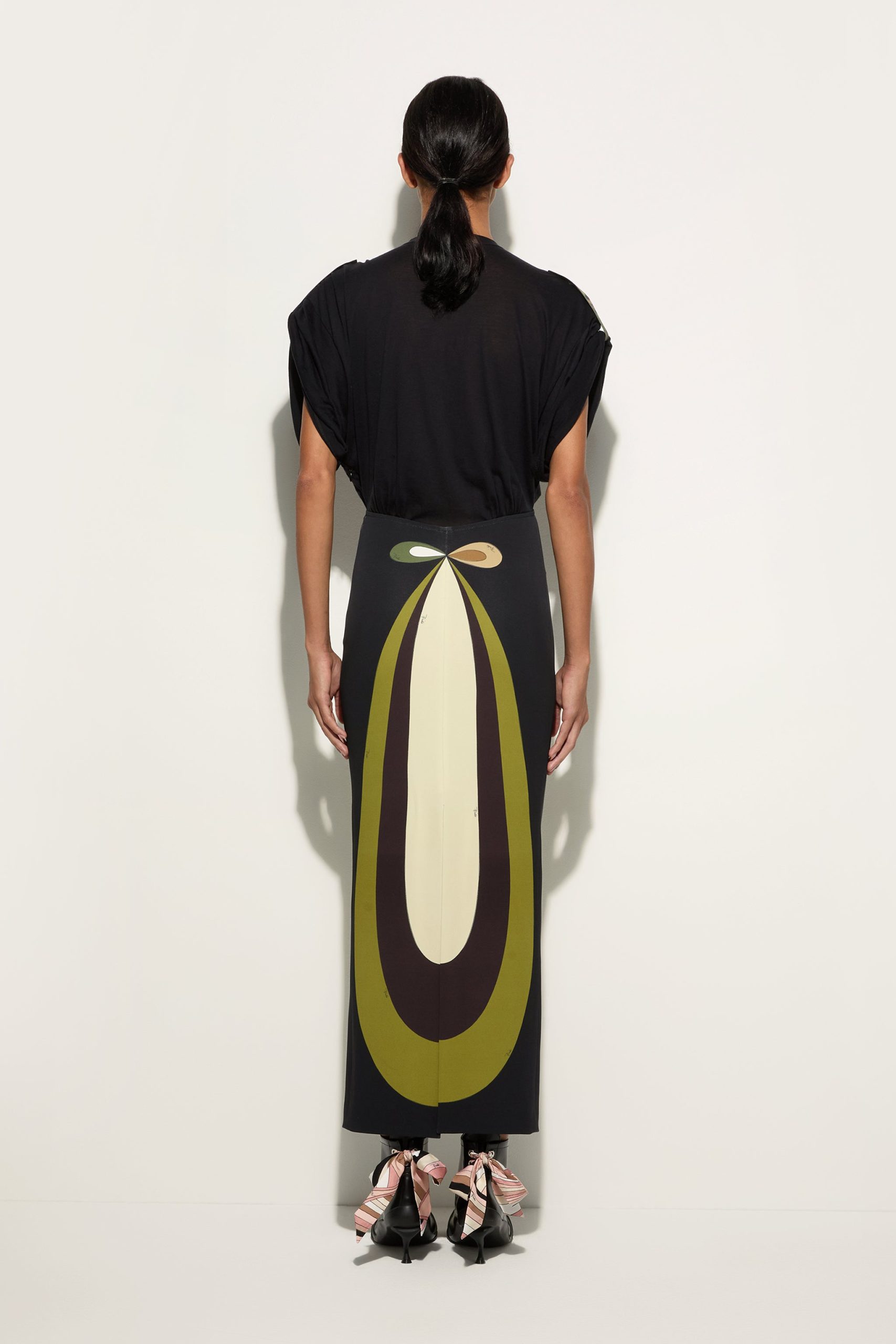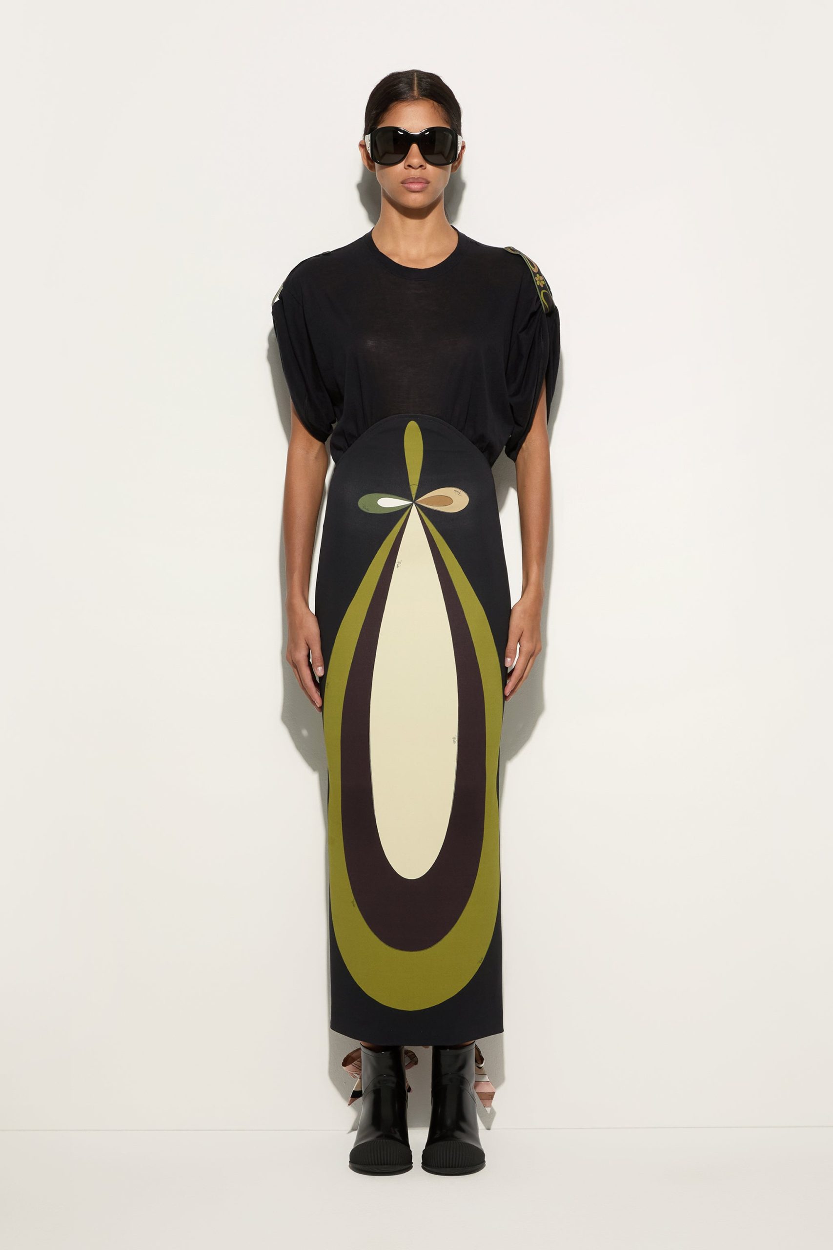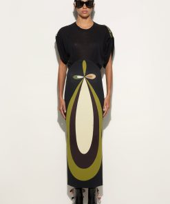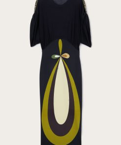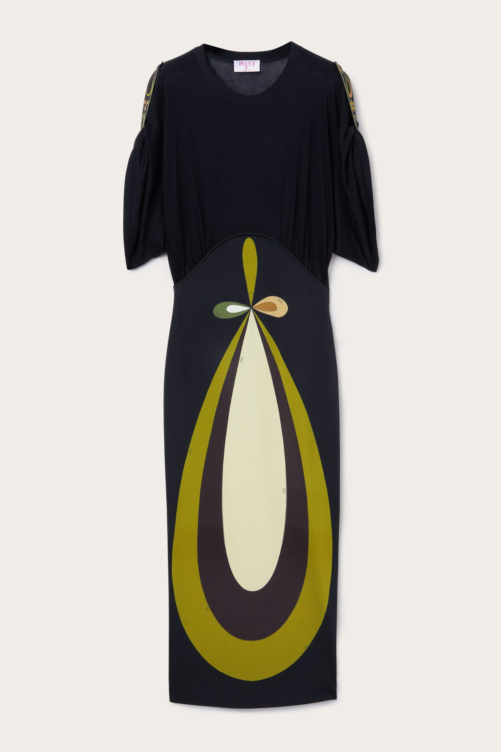 A refined balance between tradition and modernity defines this long dress, featuring short flowing sleeves, a round neckline and a high-waisted skirt. The absolute protagonist is the Maddalena print, a precious archival pattern from 1967 that features a vertical drop enriched with concentrated color fields and a decorative bow at the apex, with a dynamic and fluid visual effect. Made of cotton-silk jersey, this dress is perfect for special occasions where elegance and originality meet.