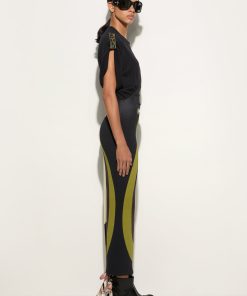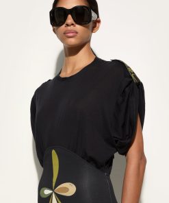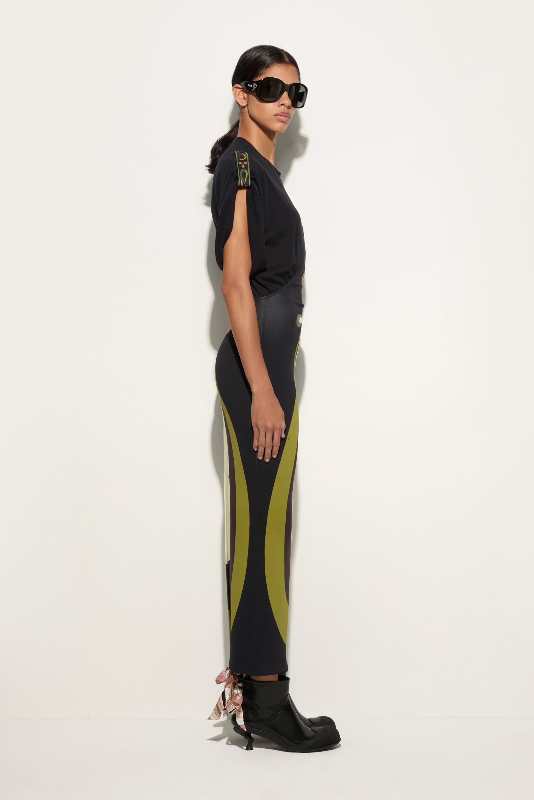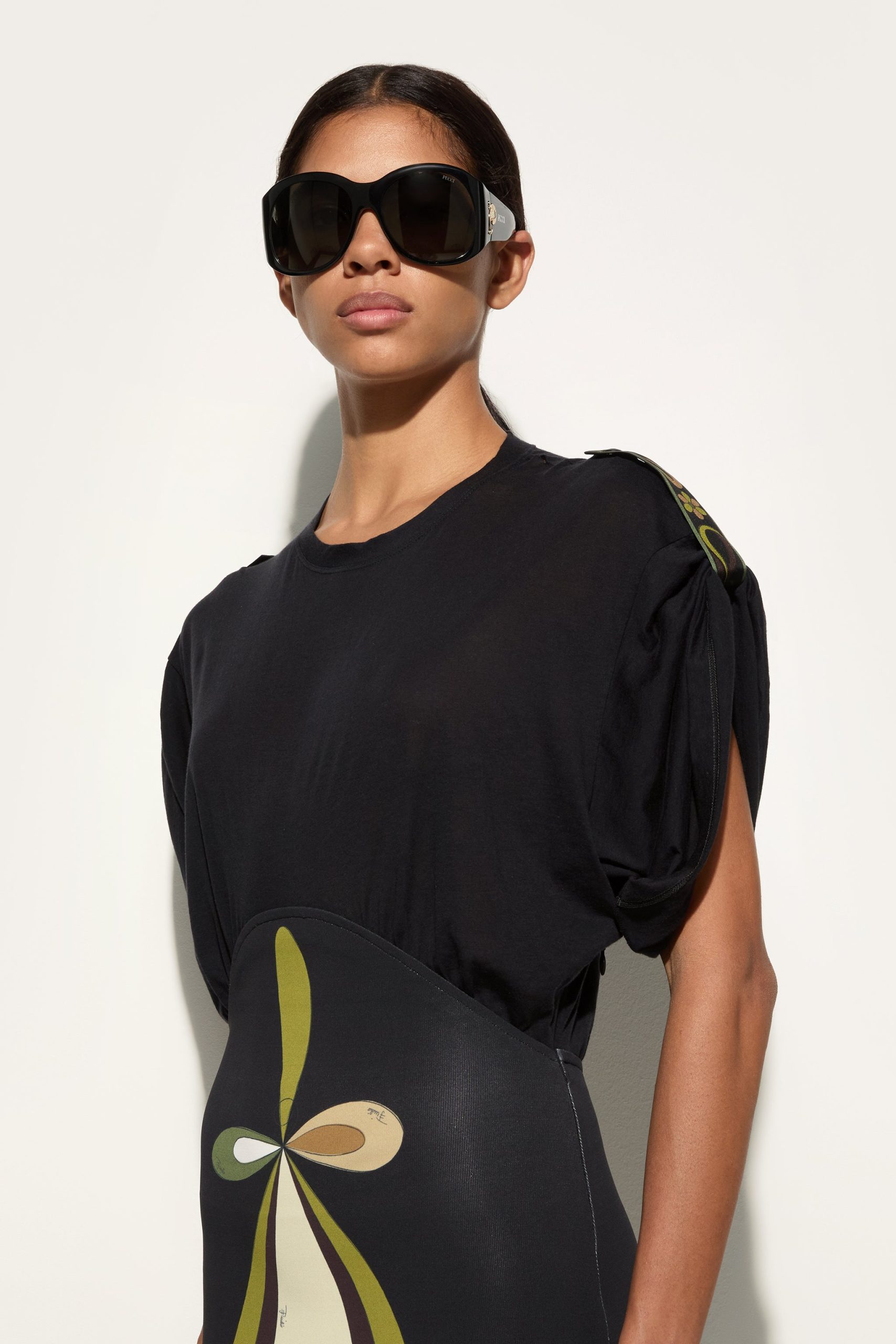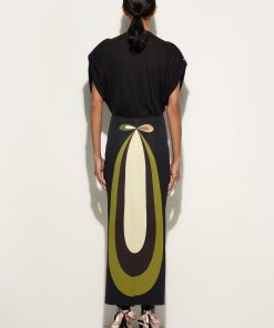 A refined balance between tradition and modernity defines this long dress, featuring short flowing sleeves, a round neckline and a high-waisted skirt. The absolute protagonist is the Maddalena print, a precious archival pattern from 1967 that features a vertical drop enriched with concentrated color fields and a decorative bow at the apex, with a dynamic and fluid visual effect. Made of cotton-silk jersey, this dress is perfect for special occasions where elegance and originality meet.