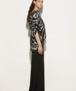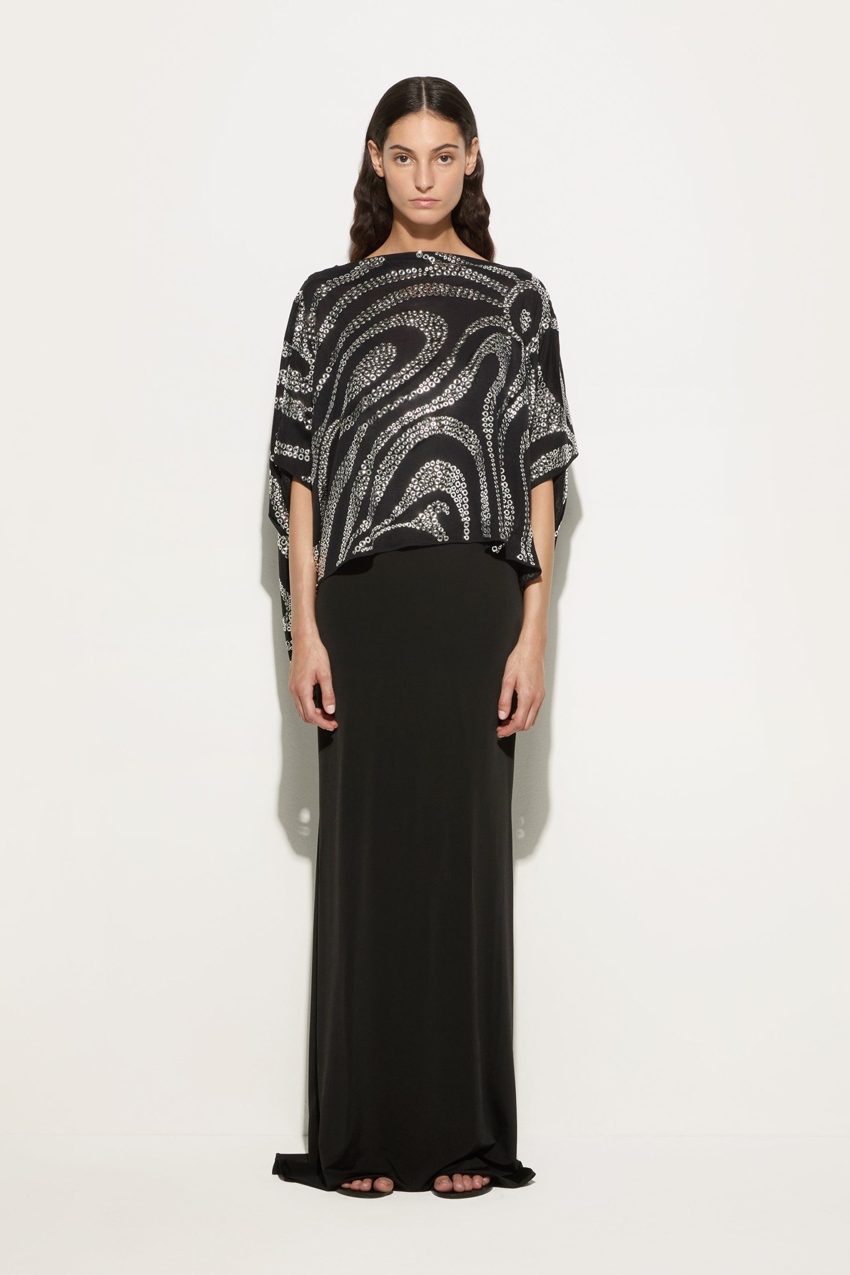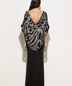 A decisive and contemporary elegance characterizes this straight-cut long dress, embellished with a sleeveless cape top decorated with a sophisticated play of metal studs. A garment with a sculptural and dynamic look, perfect for those who love to stand out in style. Made of extremely stretch viscose, it combines comfort and sensuality, accompanying every movement with fluidity. Ideal for evening events or to add a touch of glamour to a special evening.