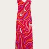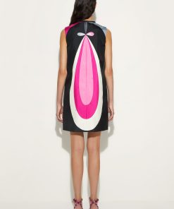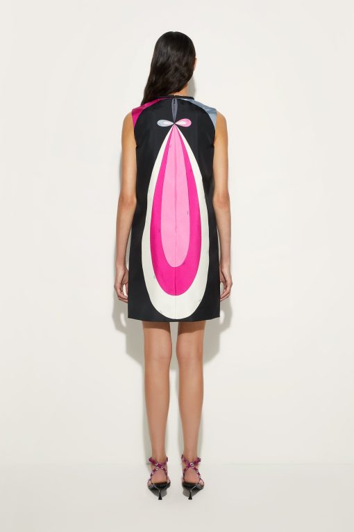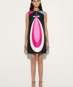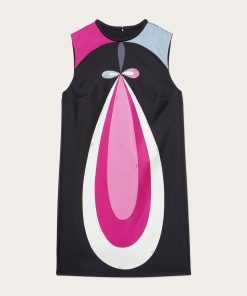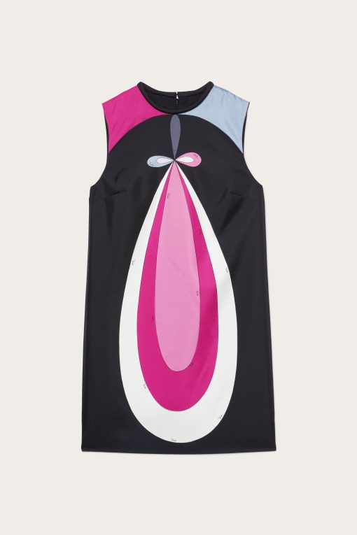 A mini-dress that plays with the perfect balance between elegance and character. The straight cut and high neck lend a sophisticated and timeless air, while the length that skims mid-thigh makes it fresh and dynamic, perfect for those who like to express their style with ease.The silk twill, with its slightly stiff structure, enhances the natural sheen and lightness of the fabric, offering a flawless fit. The finishing touch? The Maddalena print in black and fuchsia tones, a bold and vibrant pattern that adds personality to the look.