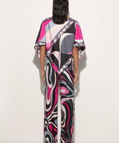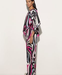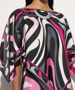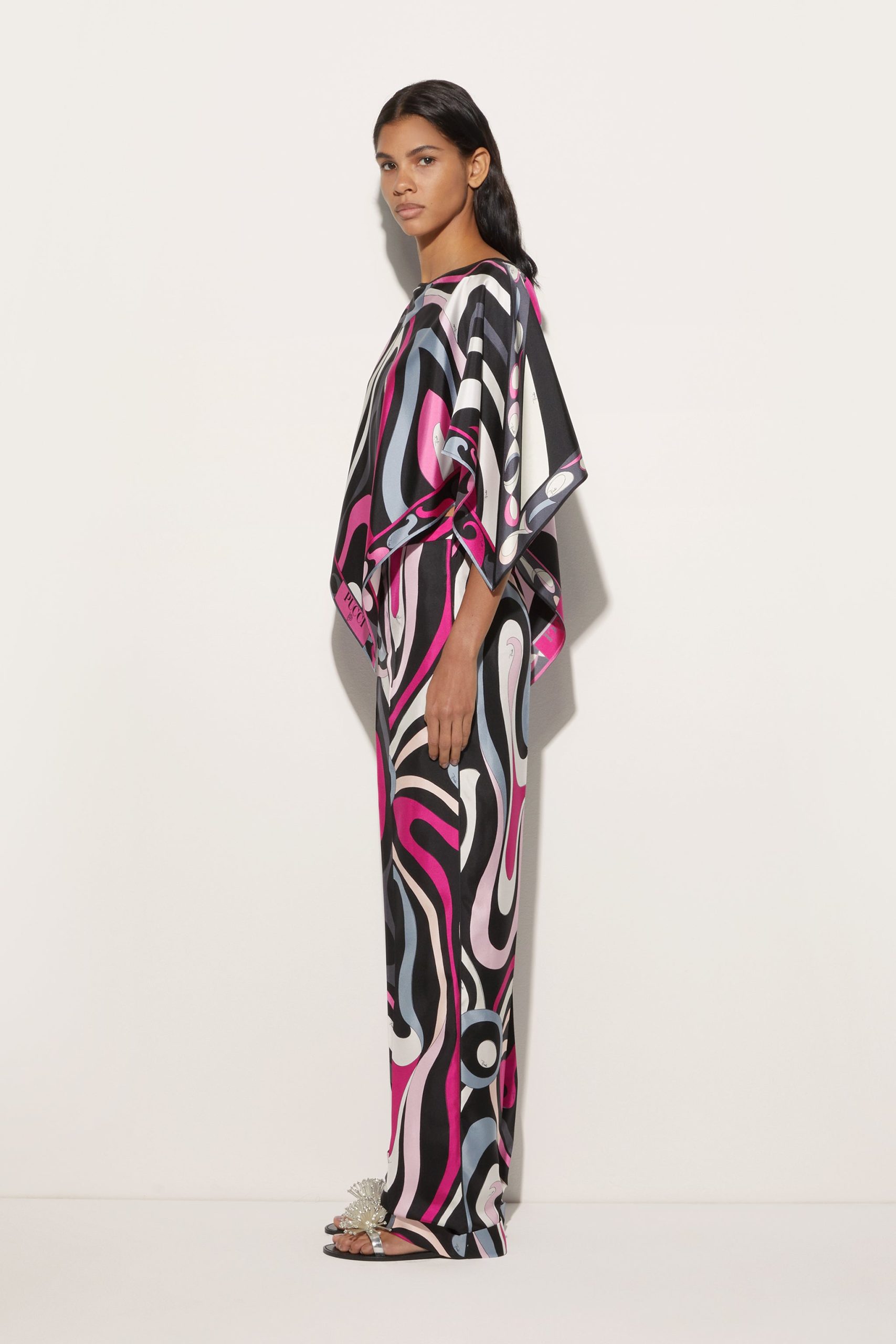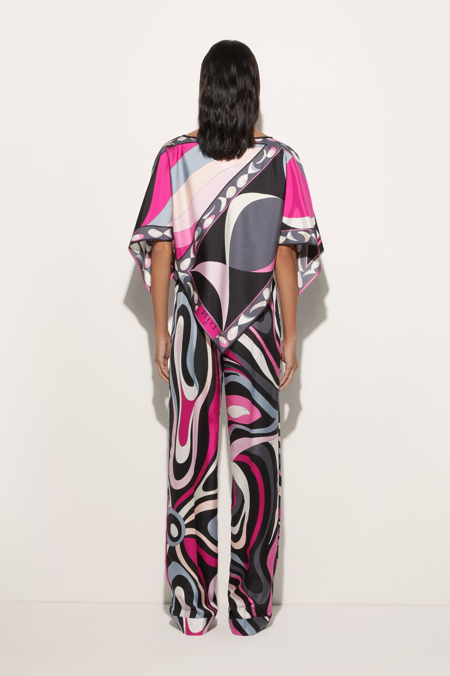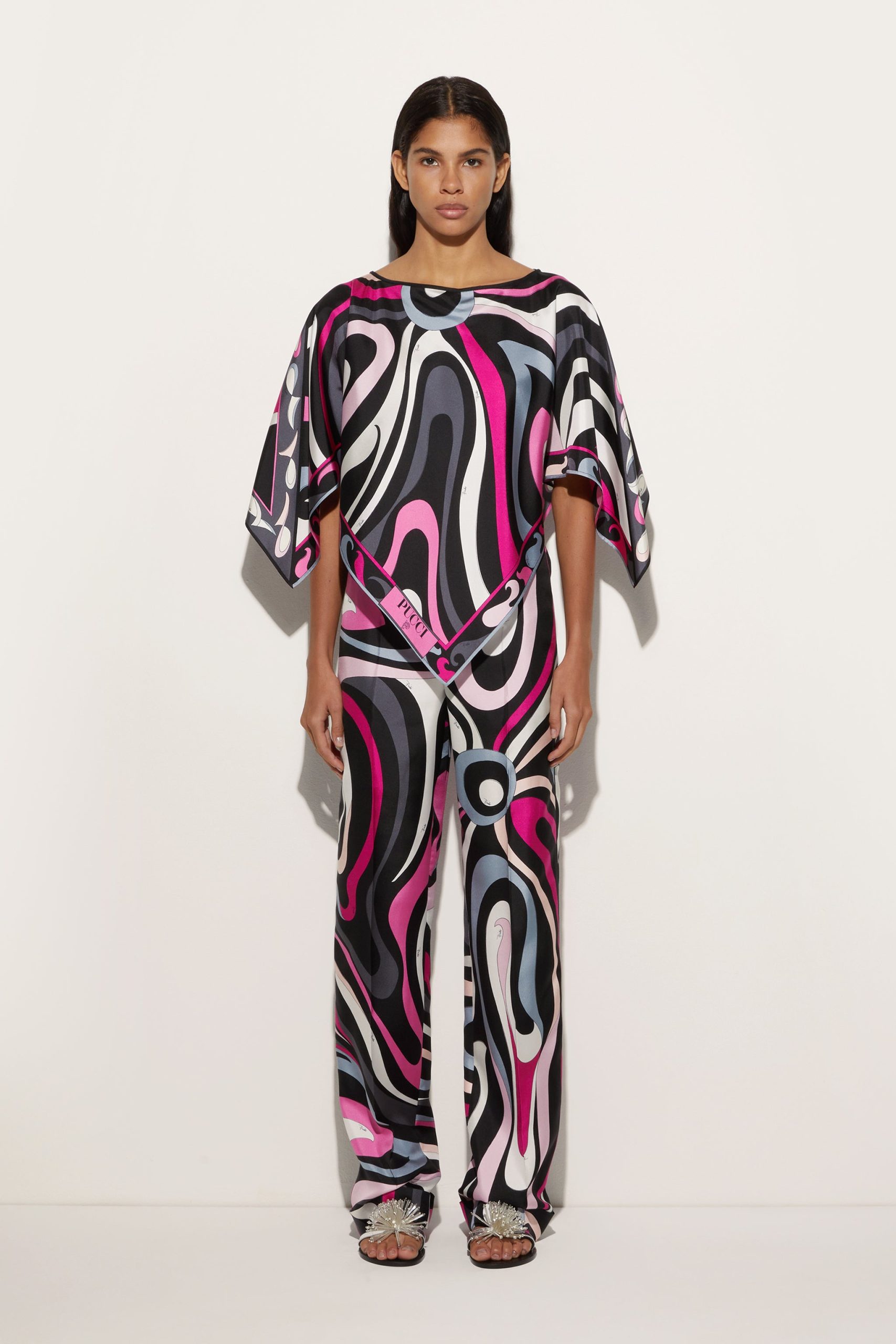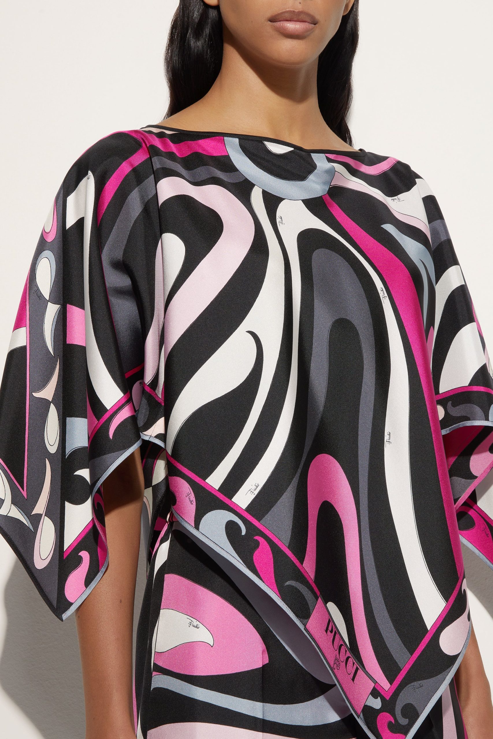 A garment that combines lightness and sophistication, perfect for those who love sophisticated details. This boat-neck cape blouse gently frames the shoulders, while the triangle hem closure at the waist adds a dynamic and feminine touch.A garment distinguished by the Marmo/Pesci print in black and fuchsia, a celebration of Pucci’s timeless craftsmanship and aesthetic.