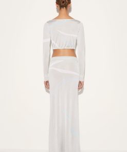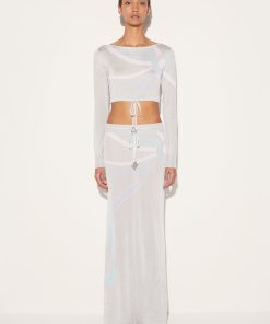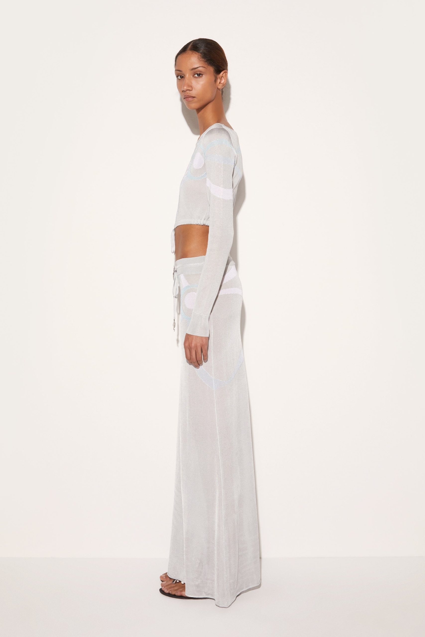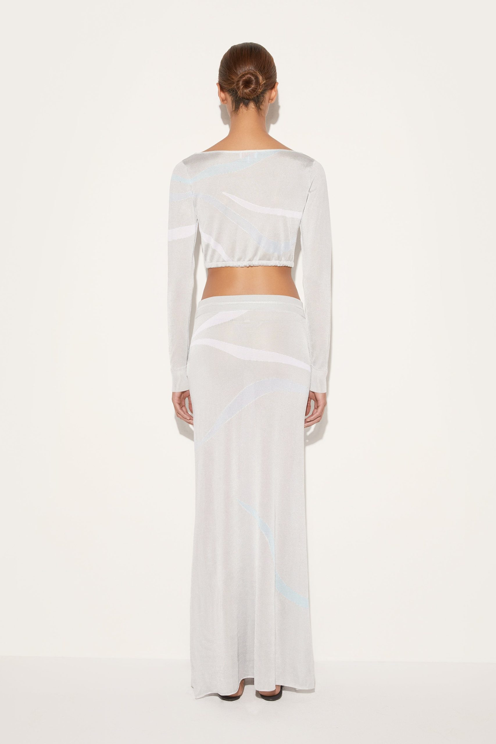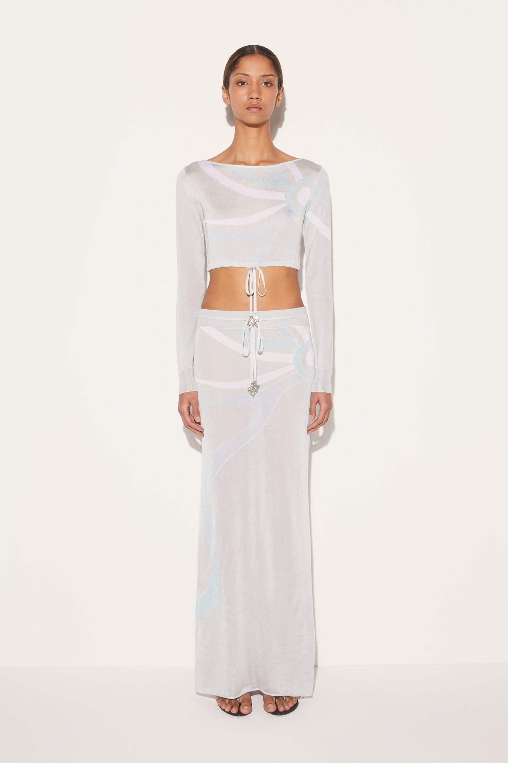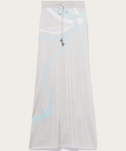 Infused with Pucci’s whimsical charm, this long skirt showcases the Marmo print in undulating strokes. The waistband can be adjusted with drawstrings tipped with intertwining fish charms.
