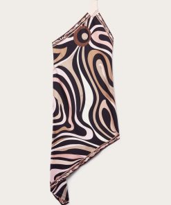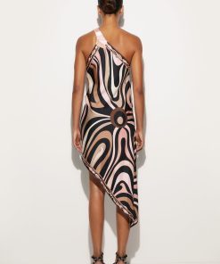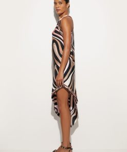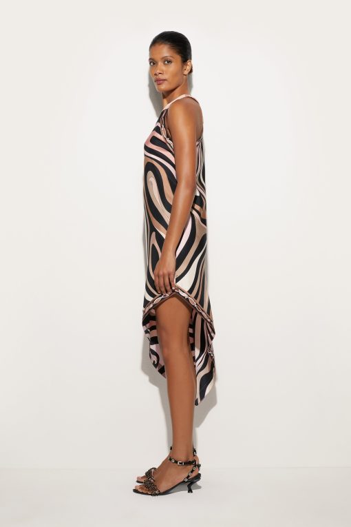 A dress capable of combining elegance and originality. This asymmetrical model creates a harmonious contrast between sensuality and sophistication, thanks to its straight, flowing cut that caresses the figure.The asymmetric length adds movement and character, making it perfect for special occasions or sophisticated daytime looks. The silk twill, with its textured, wrap-around texture, gives the garment a natural sheen, while the Marmo print in black/nude enhances its timeless elegance.