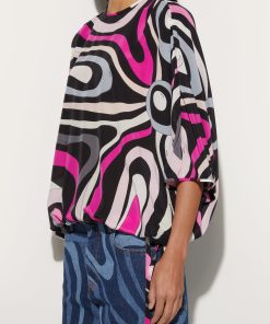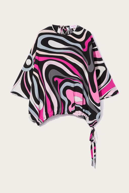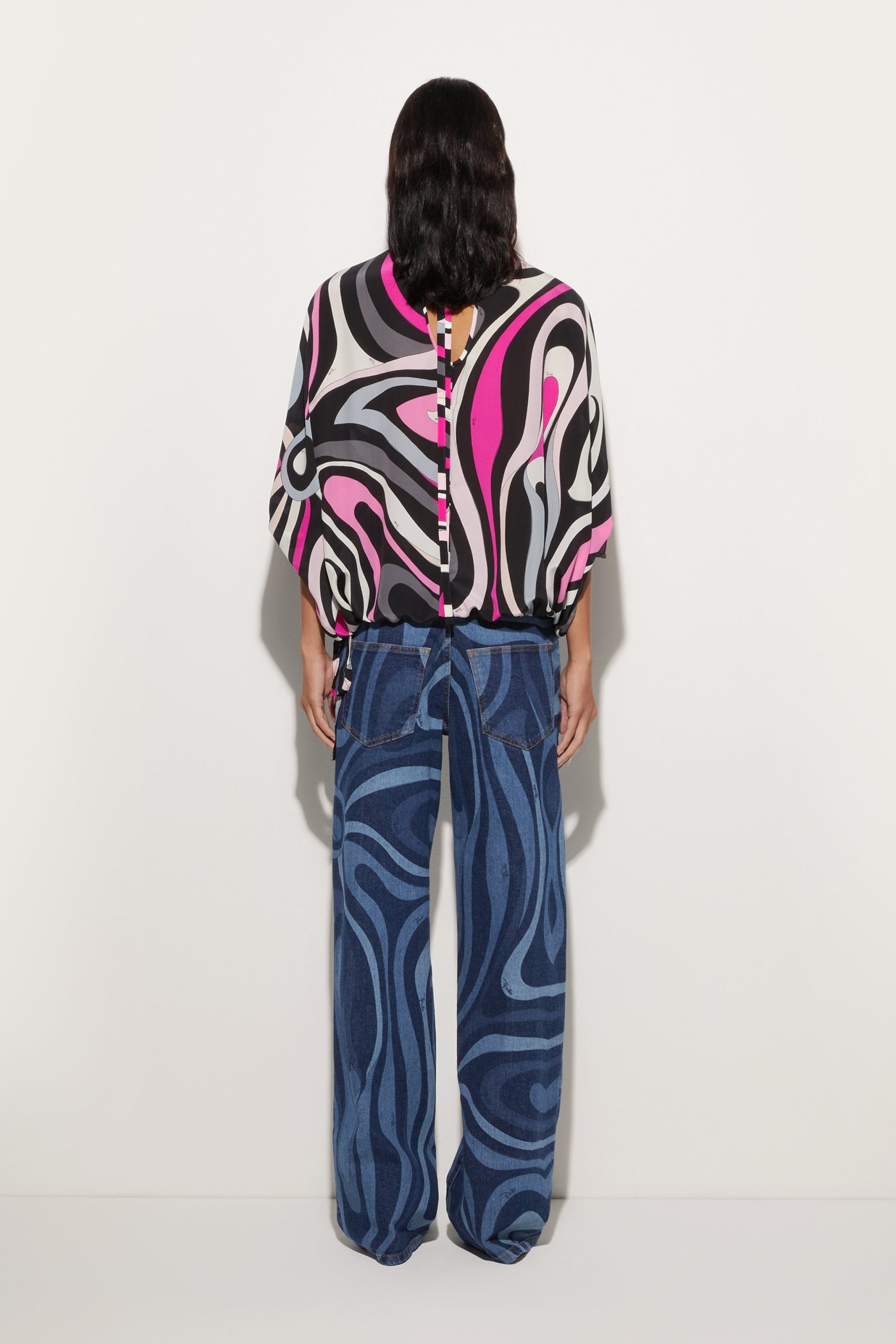 A garment that can transform even the simplest look in an instant: with its high neck and cape cut, this blouse lends a fluid and sophisticated elegance, while the ties at the shoulders and waist allow you to customize the fit with a light touch.Made of silk crepe de chine, it’s a dream on the skin, while the black/fuchsia Marmo print adds that mix of character and femininity that makes every outfit special. Perfect for timeless elegance but with a modern, chic contrast.
