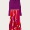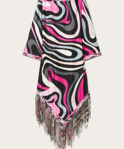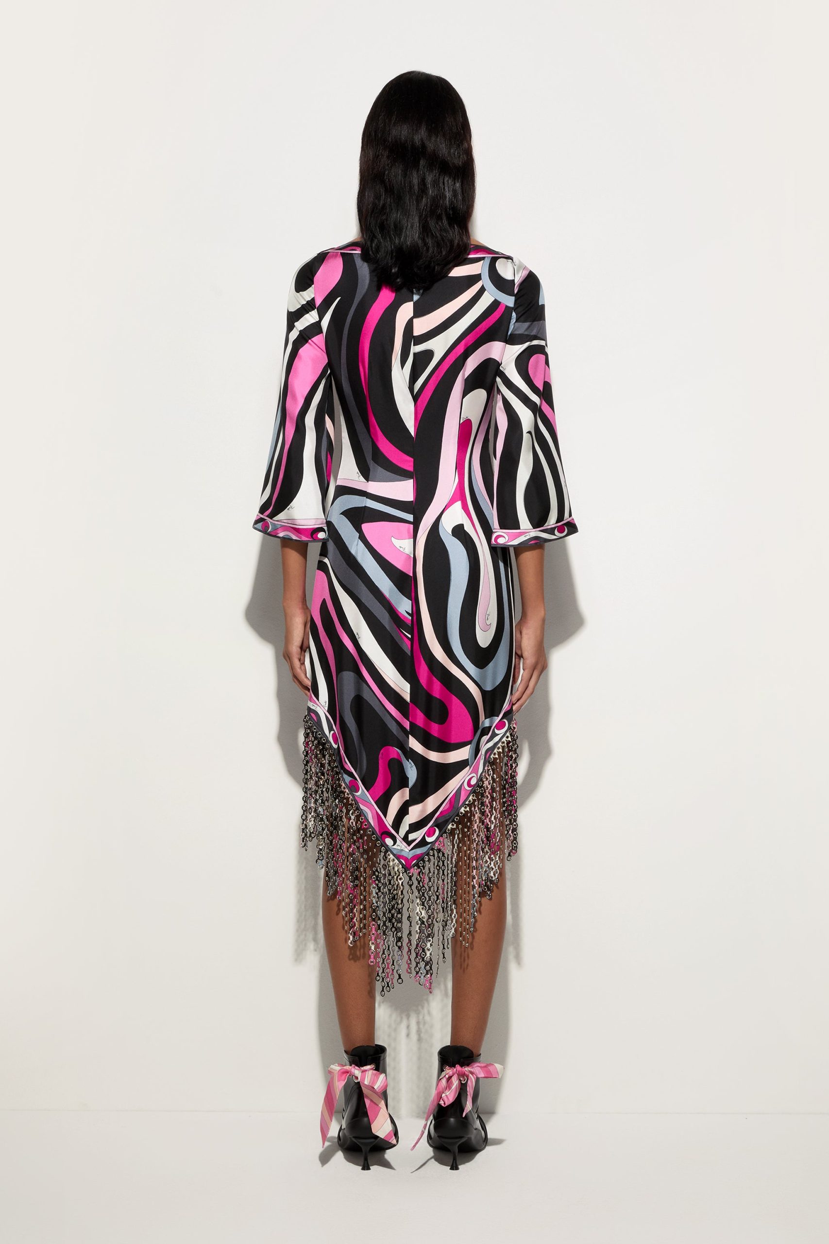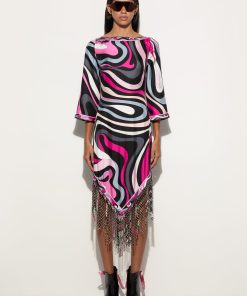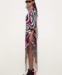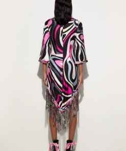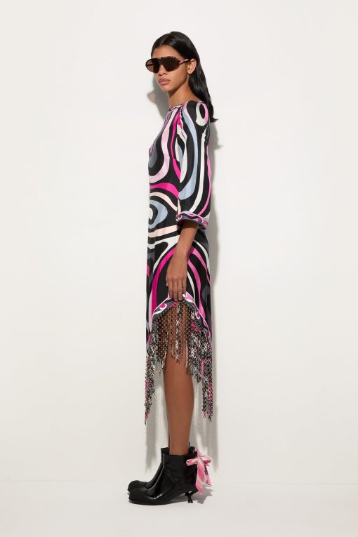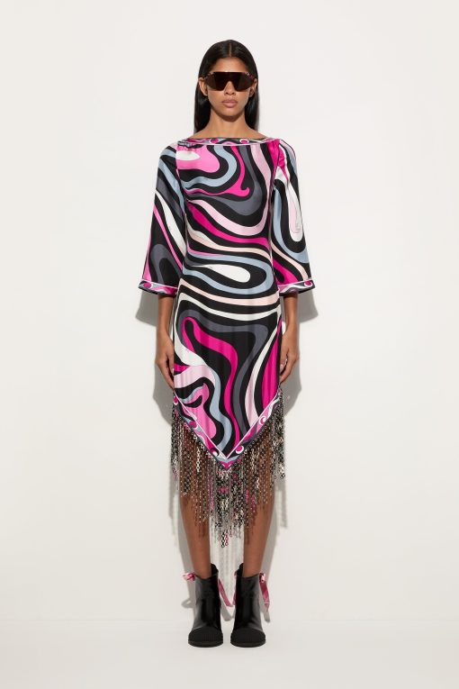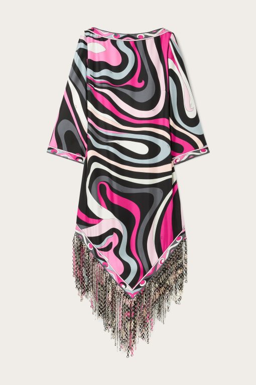 A dress that won’t go unnoticed: the straight silhouette, boat neckline and wide elbow-length sleeves create relaxed elegance, while the asymmetric hemline adds a contemporary accent. Made with an innovative technique, the fringes are created by bonding two layers of Pucci-printed fabric, enriched with decorative eyelets and then lasered to achieve an undulating, fluid movement.The Marmo print in black and fuchsia completes the look with its graphic and vibrant appeal, making this dress perfect for an elegant aperitif or a special evening out.