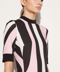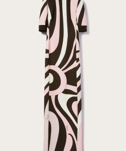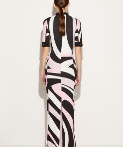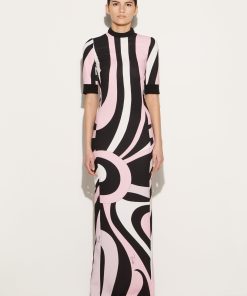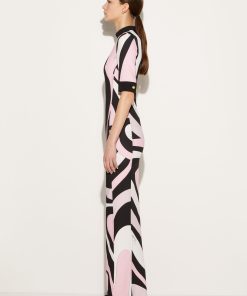 The Marmo print’s hypnotic swirls envelop this dress in pink and white hues that stand in stark contrast against the black accents. It’s cut from cady to a floor-skimming column silhouette.