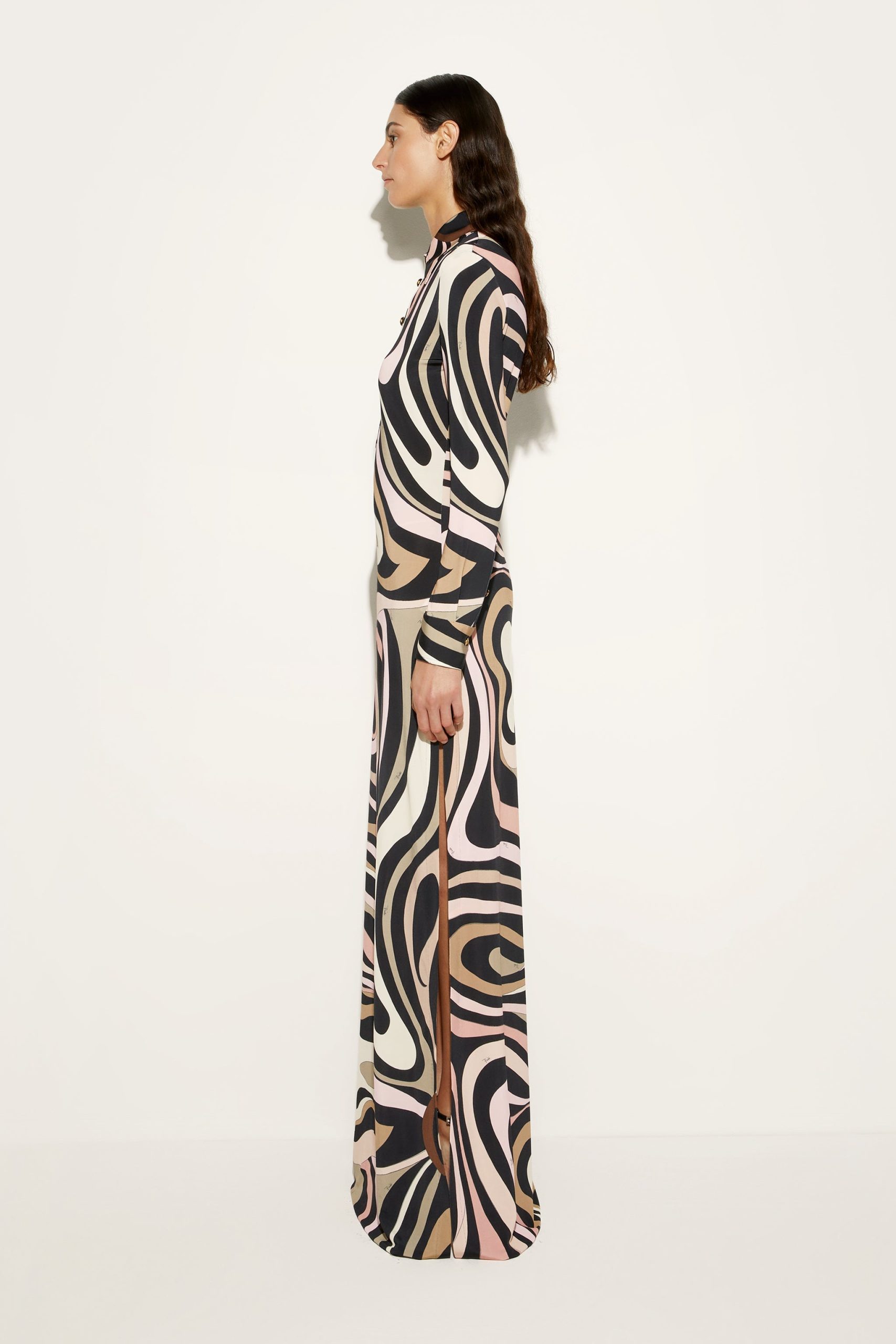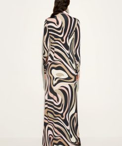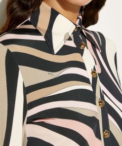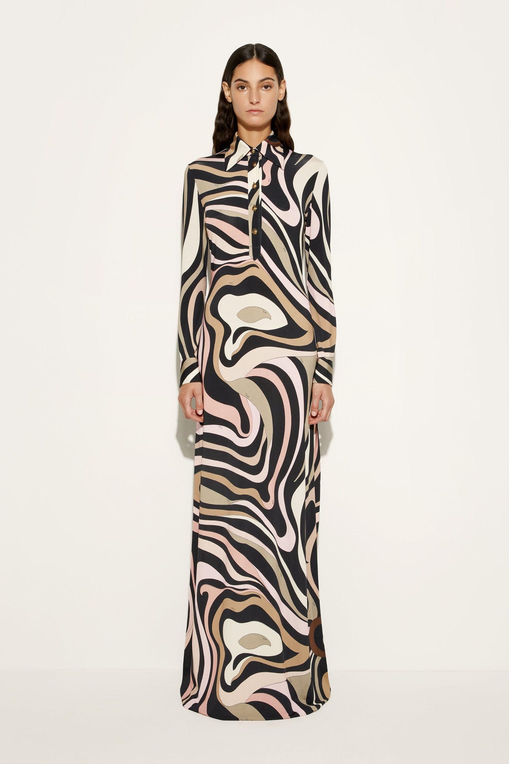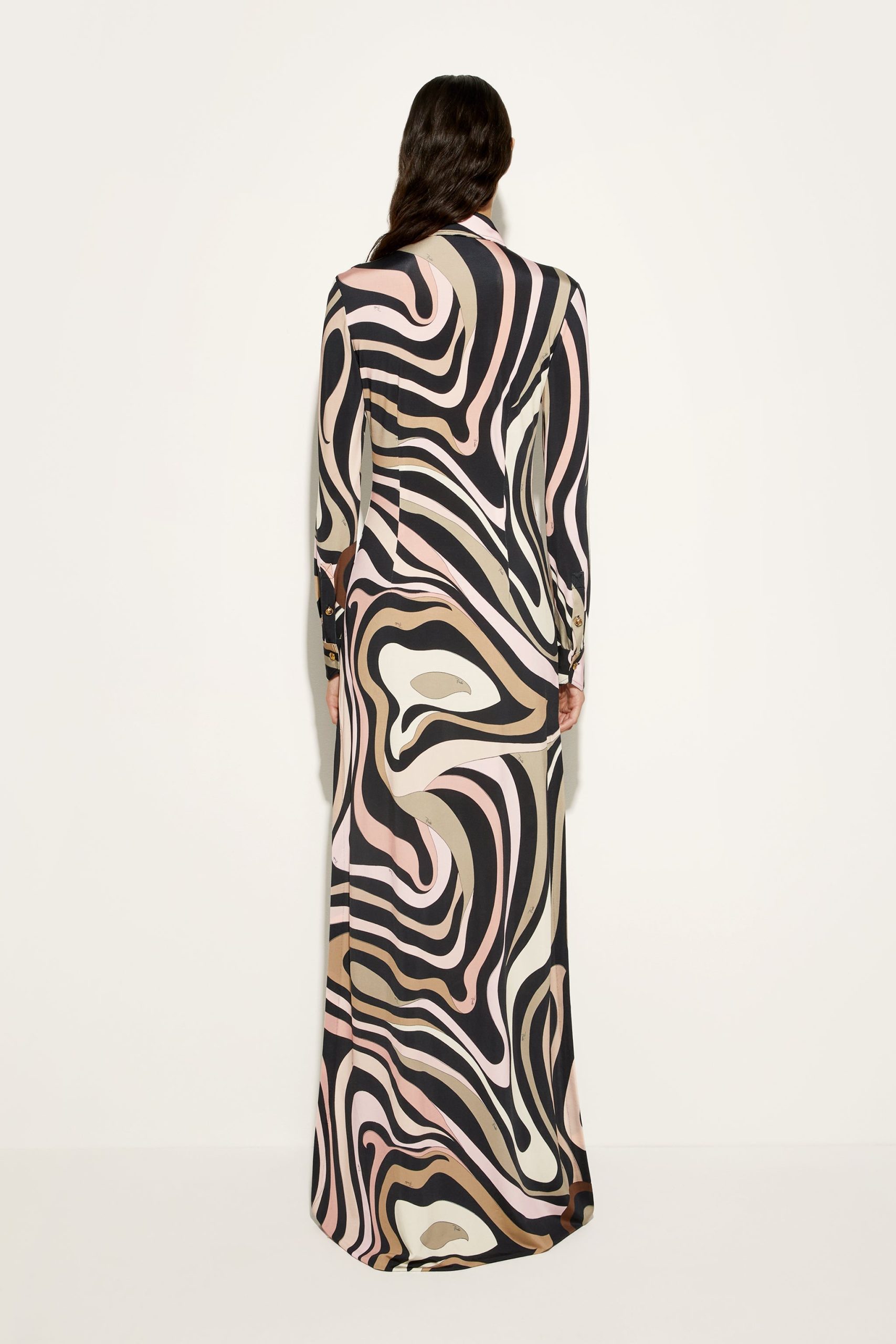 A dress that seems to dance with the light, thanks to its satin fabric that captures every movement. With a straight, fitted silhouette, this garment enhances the figure with simple, straightforward elegance. The button-down collar adds a sophisticated touch, perfect for those seeking a style that combines modernity and sophistication.The iconic stamp of the Marmo print in Black and nude, reinterpreted in a bright and contemporary version, blends with the luster of jersey, a tribute to the maison’s iconic fabric. A dress to wear to leave your mark, whether it’s during an evening event or for a special moment, anywhere.