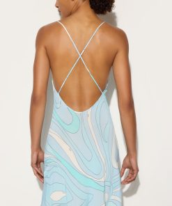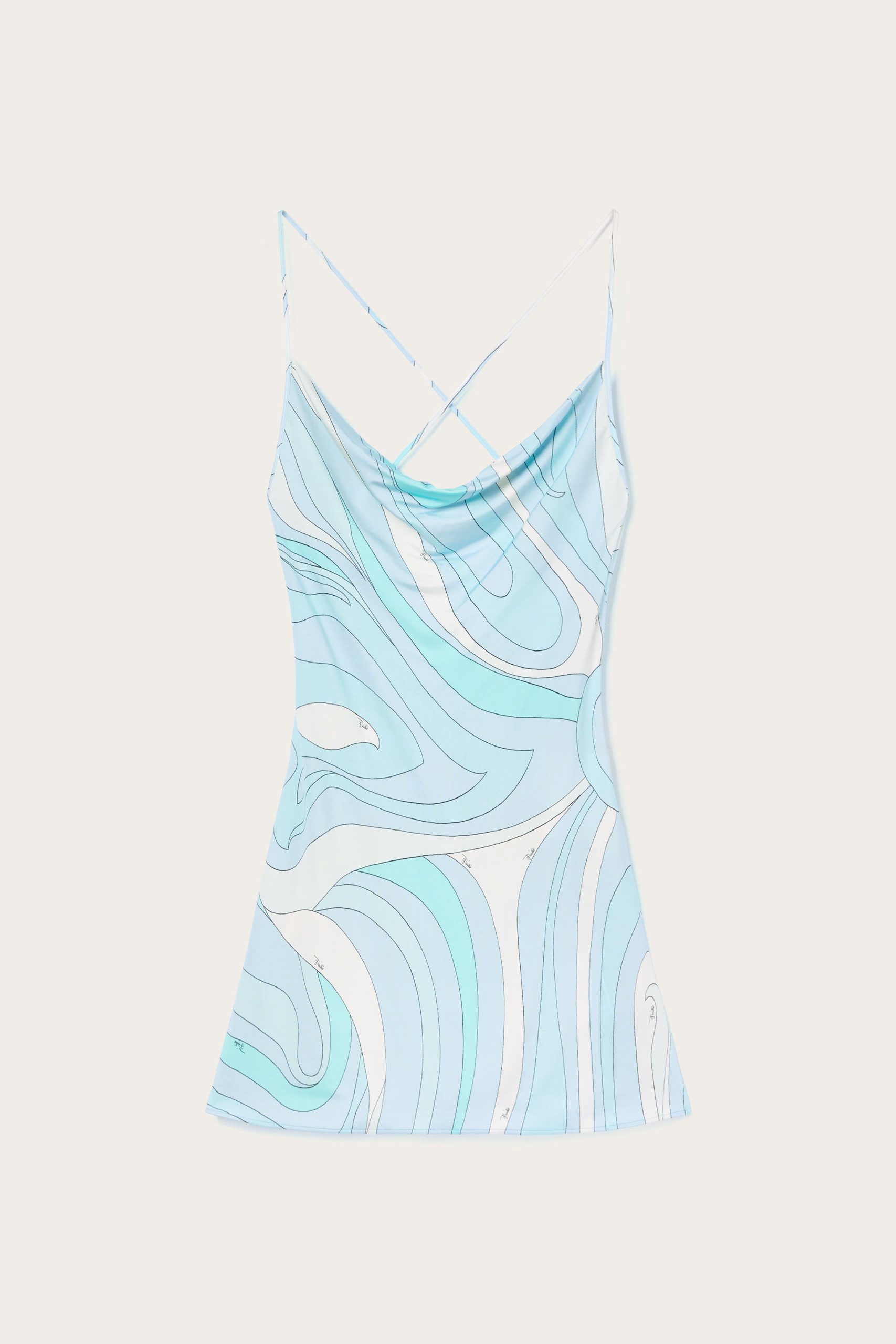 An exclusive selection of Pucci’s iconic garments in an unprecedented version of the Marmo and Orchidee prints in the most delicate shades of aqua. A combination of craftsmanship, color and identity.A short, fitted dress that celebrates femininity, elegance and sensuality. The thin straps and plunging neckline enhance the silhouette, while the jersey gives a refined sheen to the fabric. Perfect for evening events or exclusive cocktails, this dress embodies Pucci’s DNA with incredible modernity.