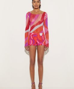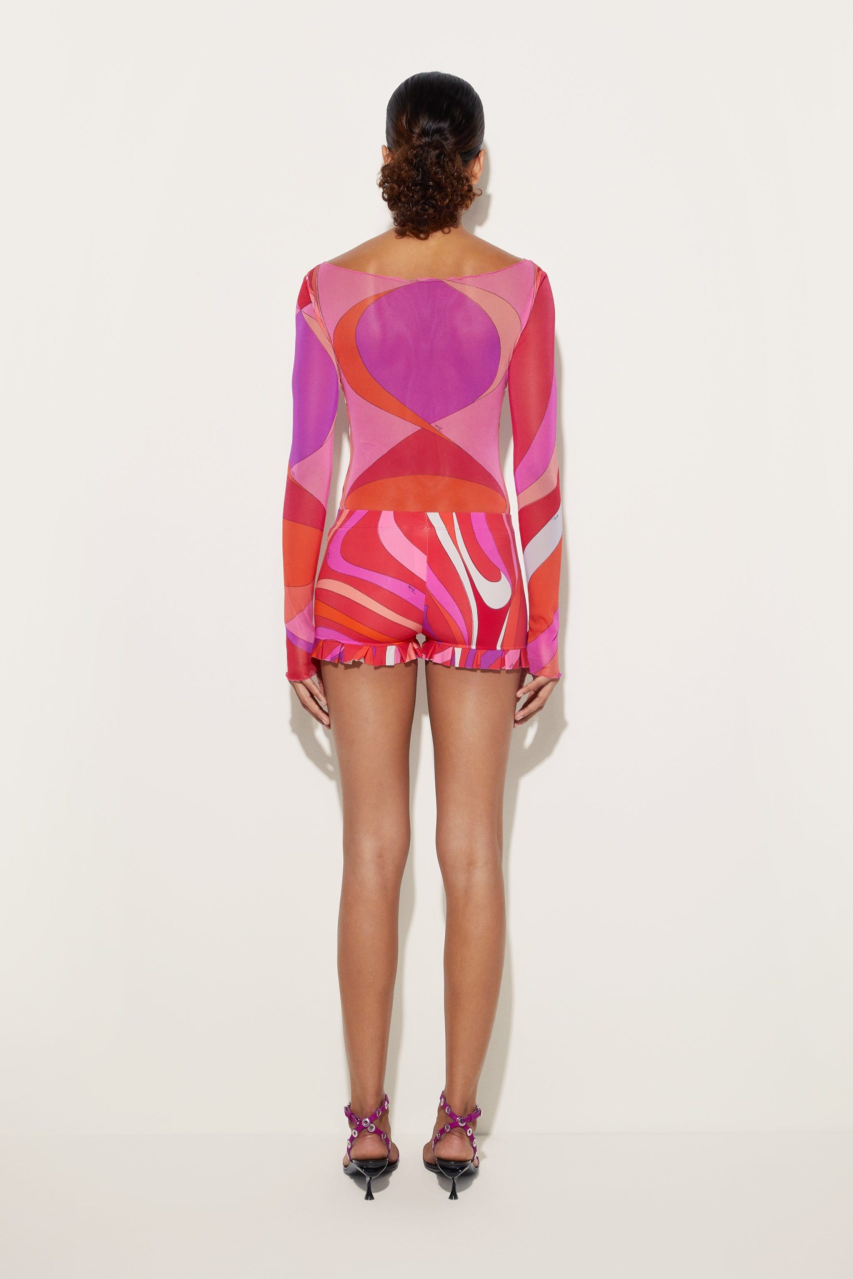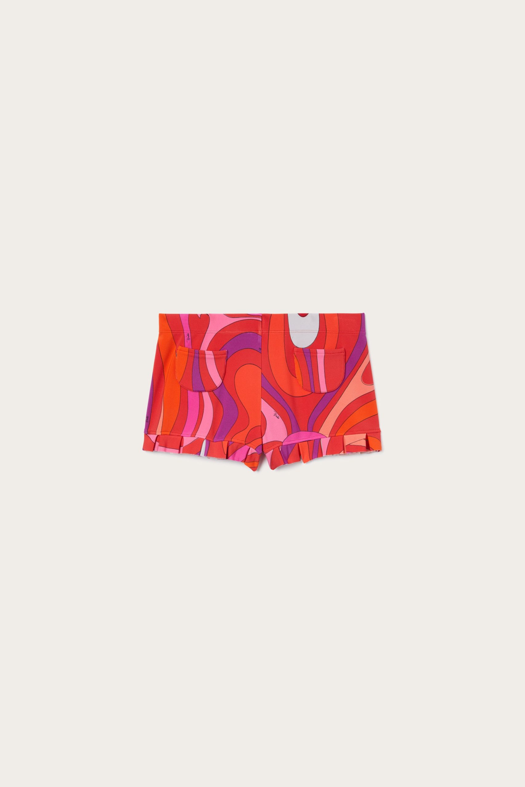 A characterful garment designed for those who love a sculpted, wrap-around fit. These low-rise fitted shorts stand out for their structured and comfortable fit, thanks to the super-stretchy compact viscose knit that offers light compression to enhance the shape. The Marmo print in shades of coral and fuchsia adds a graphic and sophisticated touch, while the ribbed hem emphasizes the fit and design. Perfect for a look that blends grit and elegance, interpreting the unmistakable Pucci aesthetic at its best.