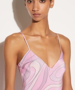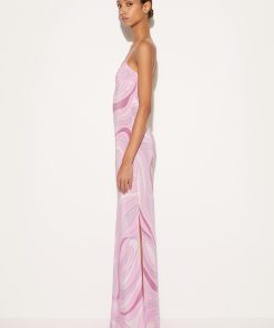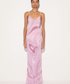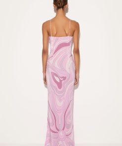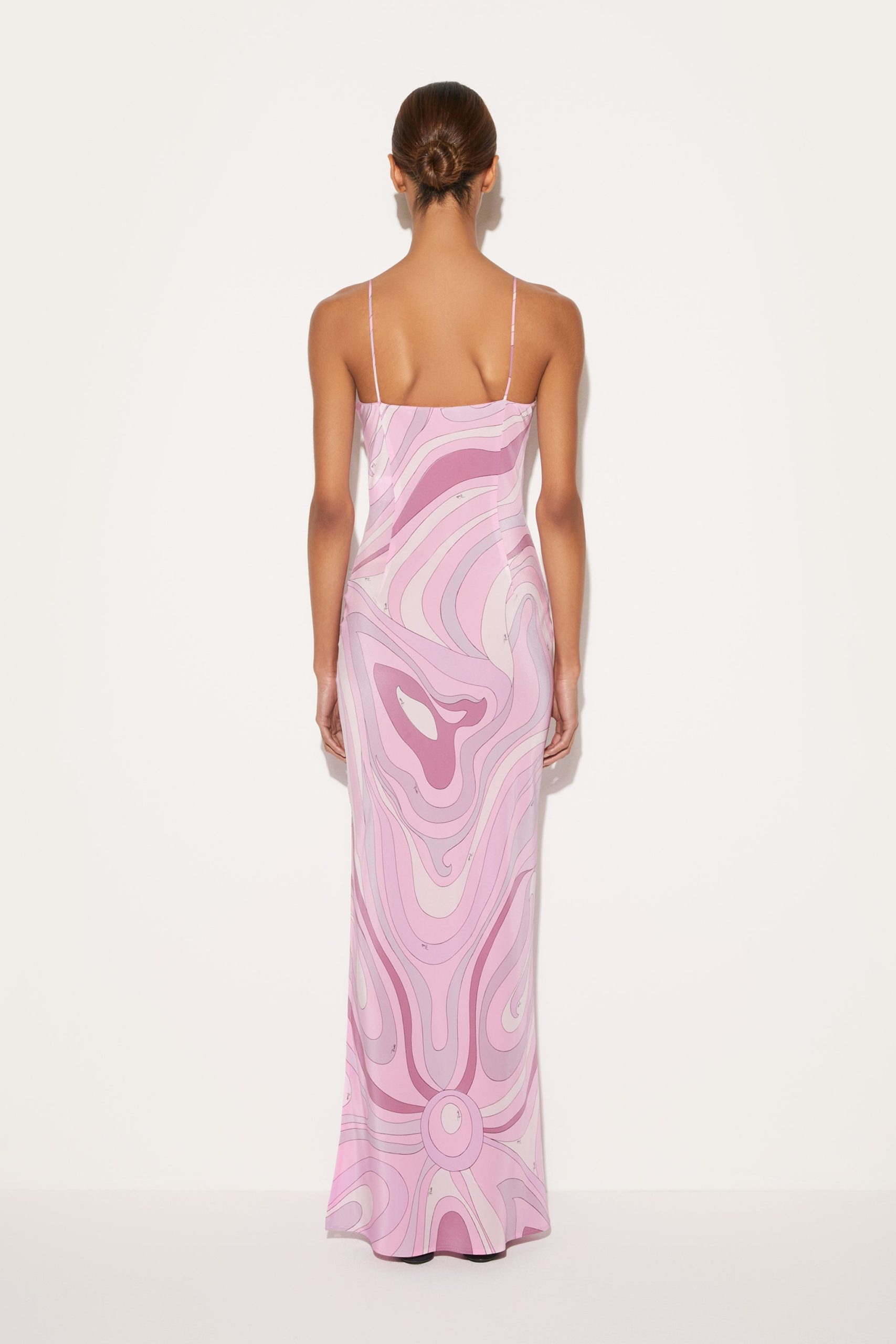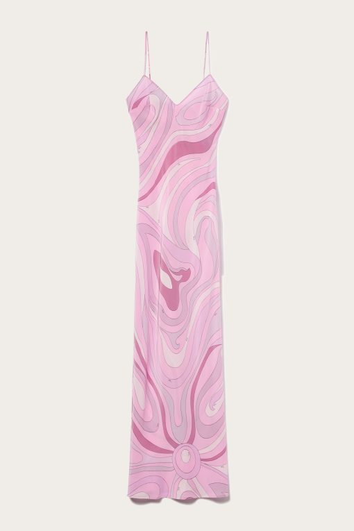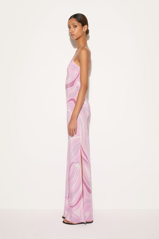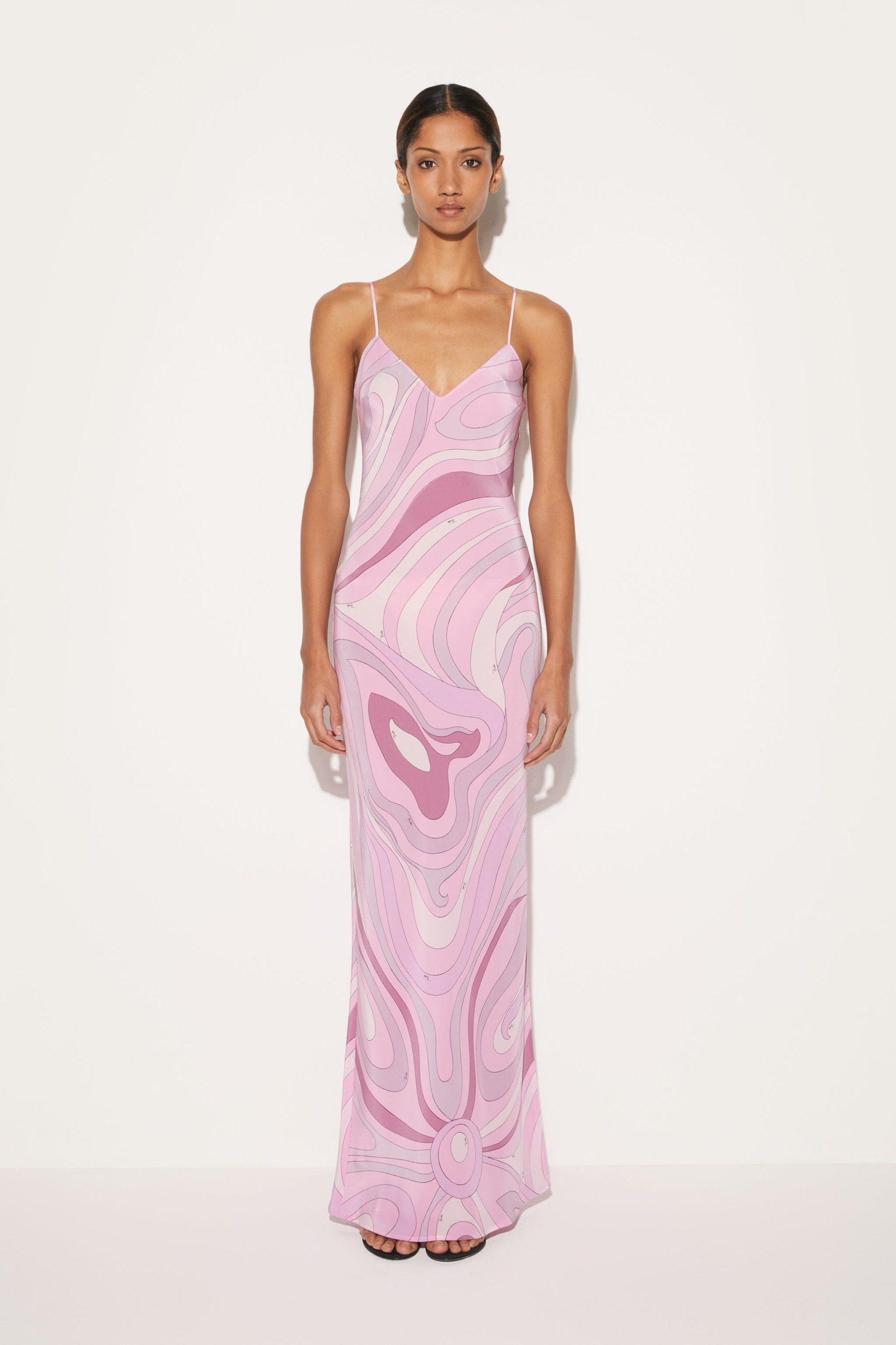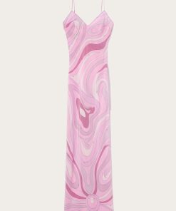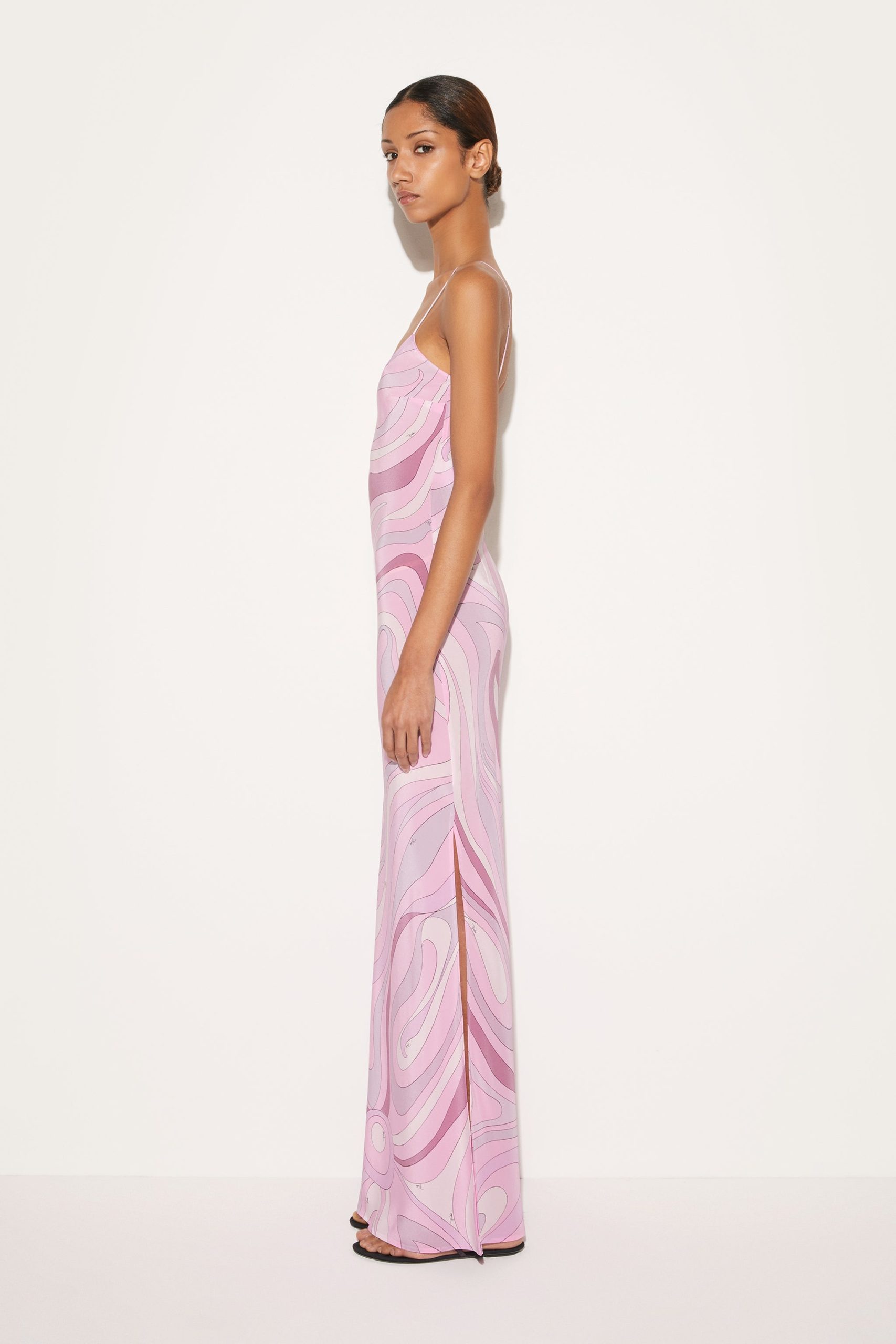 This dress is Pucci’s riff on a classic slip style. It’s cut from fluid silk crepe de chine that’s printed with signature Marmo swirls inspired by veined marble. The high side splits create billowing movement with each step.