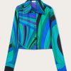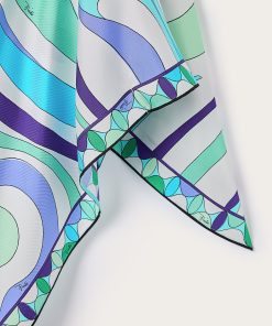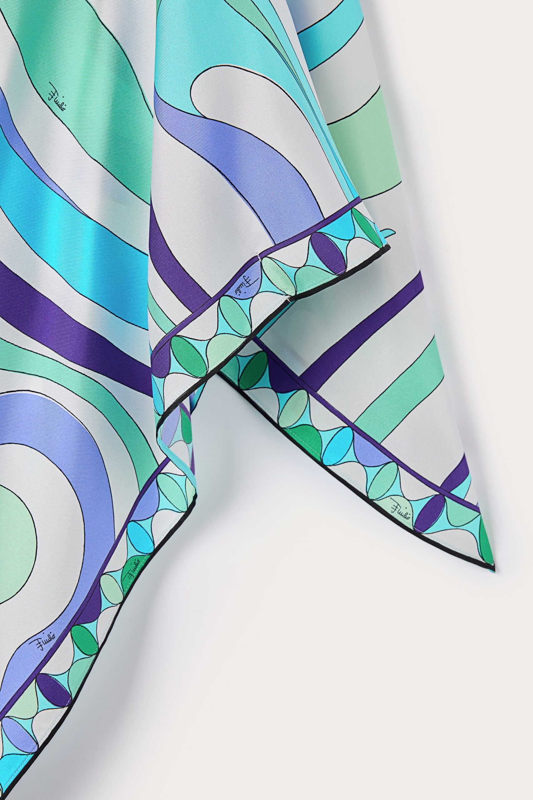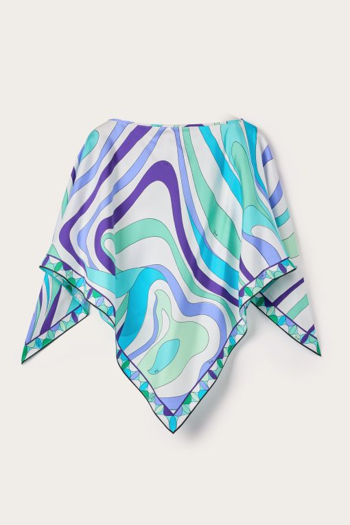 Flowing lines and sculptural elegance define this cape blouse, featuring a boat neckline and a pointed hem that joins at the waist, creating a wraparound, dynamic effect. Made from twill, a fabric with a slightly stiff finish that enhances the sheen and structure of the silk, it is decorated with the Marmo print in green and lilac, an archive pattern from 1968 inspired by the play of light on the sea in the Blue Grotto of Capri.