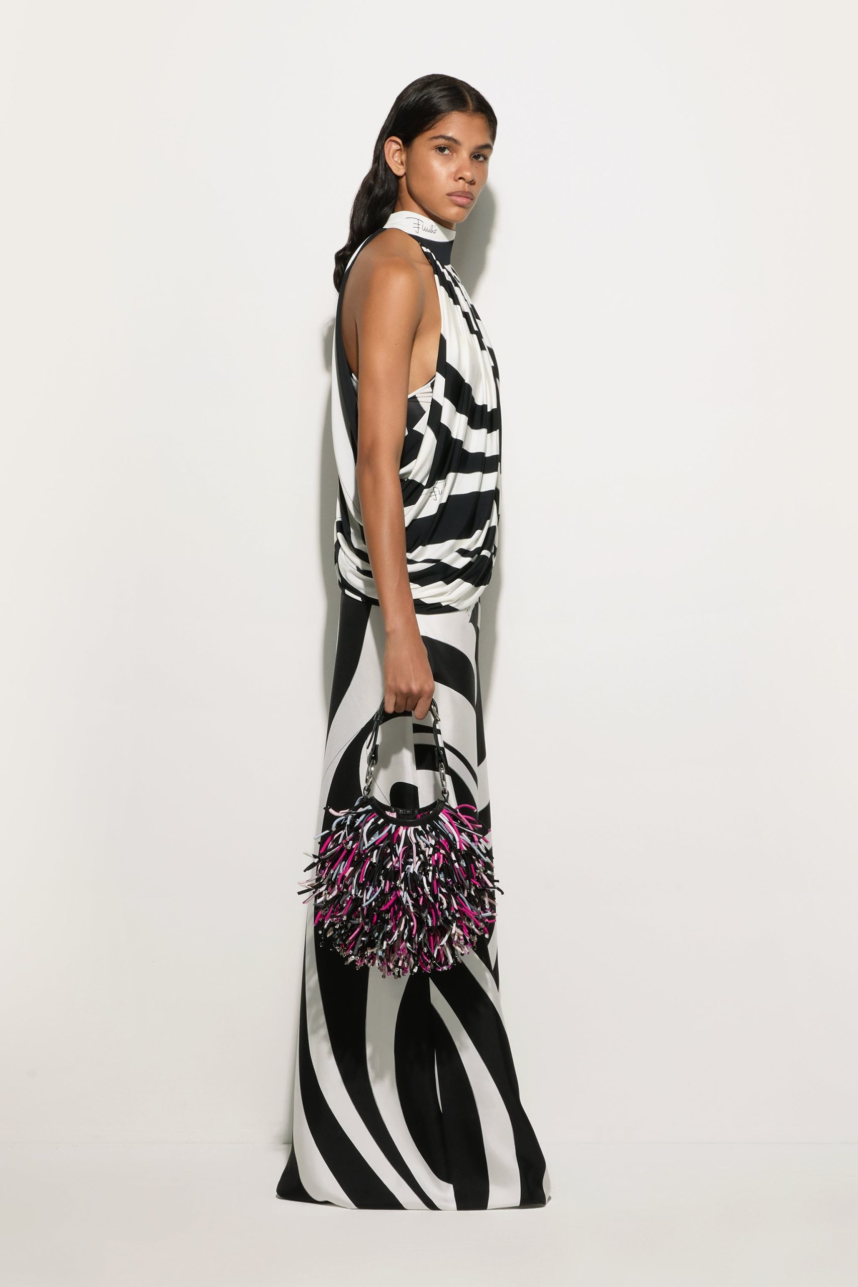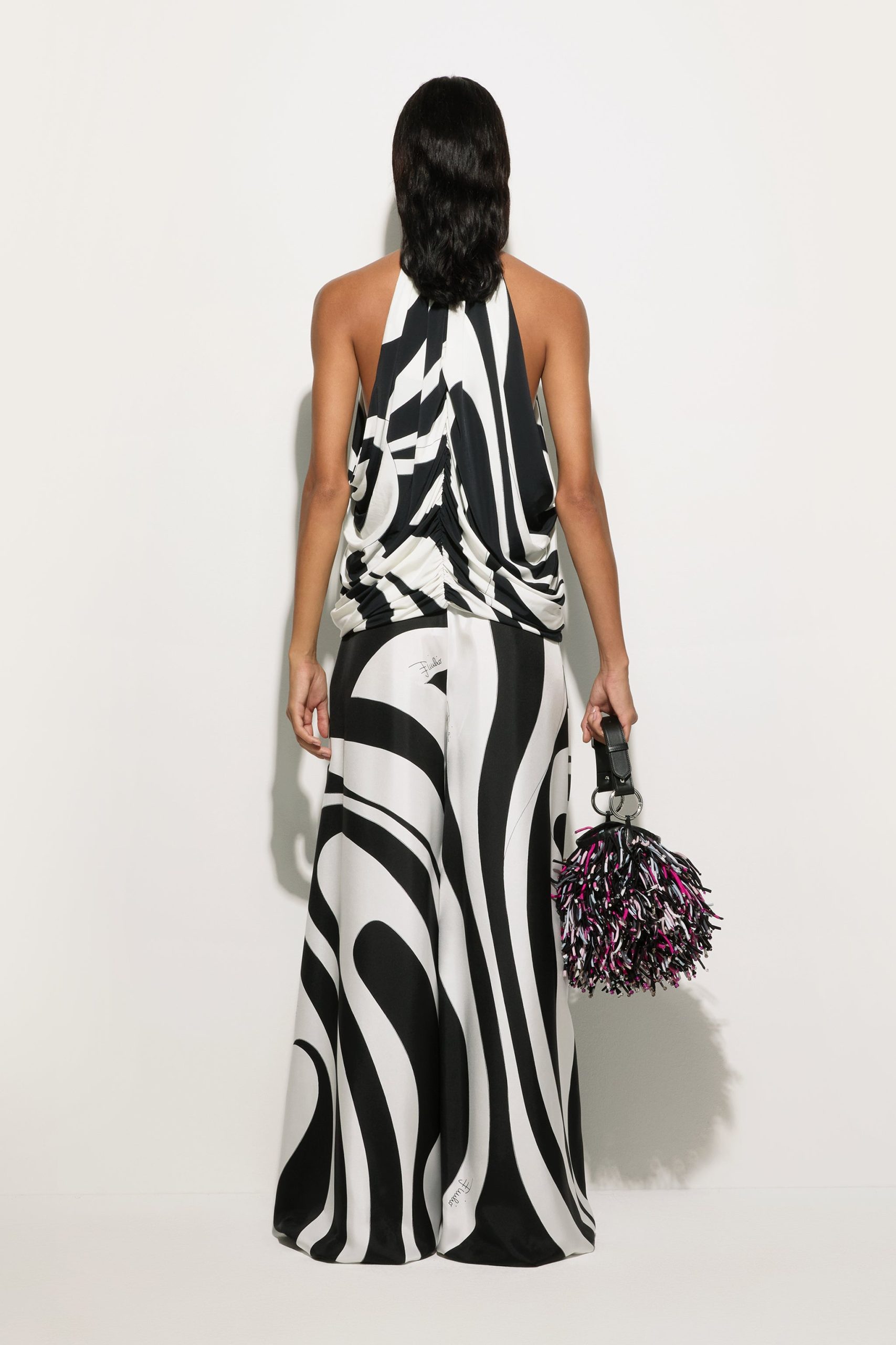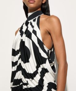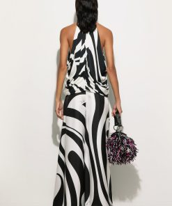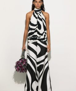 A top that blends minimalism and character into a perfect balance. Sleeveless and with a sophisticated high neck, this garment slips gently over the waistline, enhancing the figure with elegance. Designed for those who love a refined yet bold style, it is the ideal complement for looks that know how to get noticed with style.The Marmo Big print, an enlarged version of the historic Marmo, lives again in all its graphic power on the black and white satin jersey, adding depth and dynamism to the design. Perfect for pairing with tailored pants or flowing skirts for both daytime and evening wear.