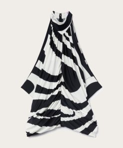 A top that blends minimalism and character into a perfect balance. Sleeveless and with a sophisticated high neck, this garment slips gently over the waistline, enhancing the figure with elegance. Designed for those who love a refined yet bold style, it is the ideal complement for looks that know how to get noticed with style.The Marmo Big print, an enlarged version of the historic Marmo, lives again in all its graphic power on the black and white satin jersey, adding depth and dynamism to the design. Perfect for pairing with tailored pants or flowing skirts for both daytime and evening wear.