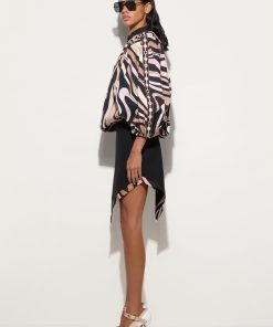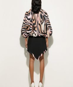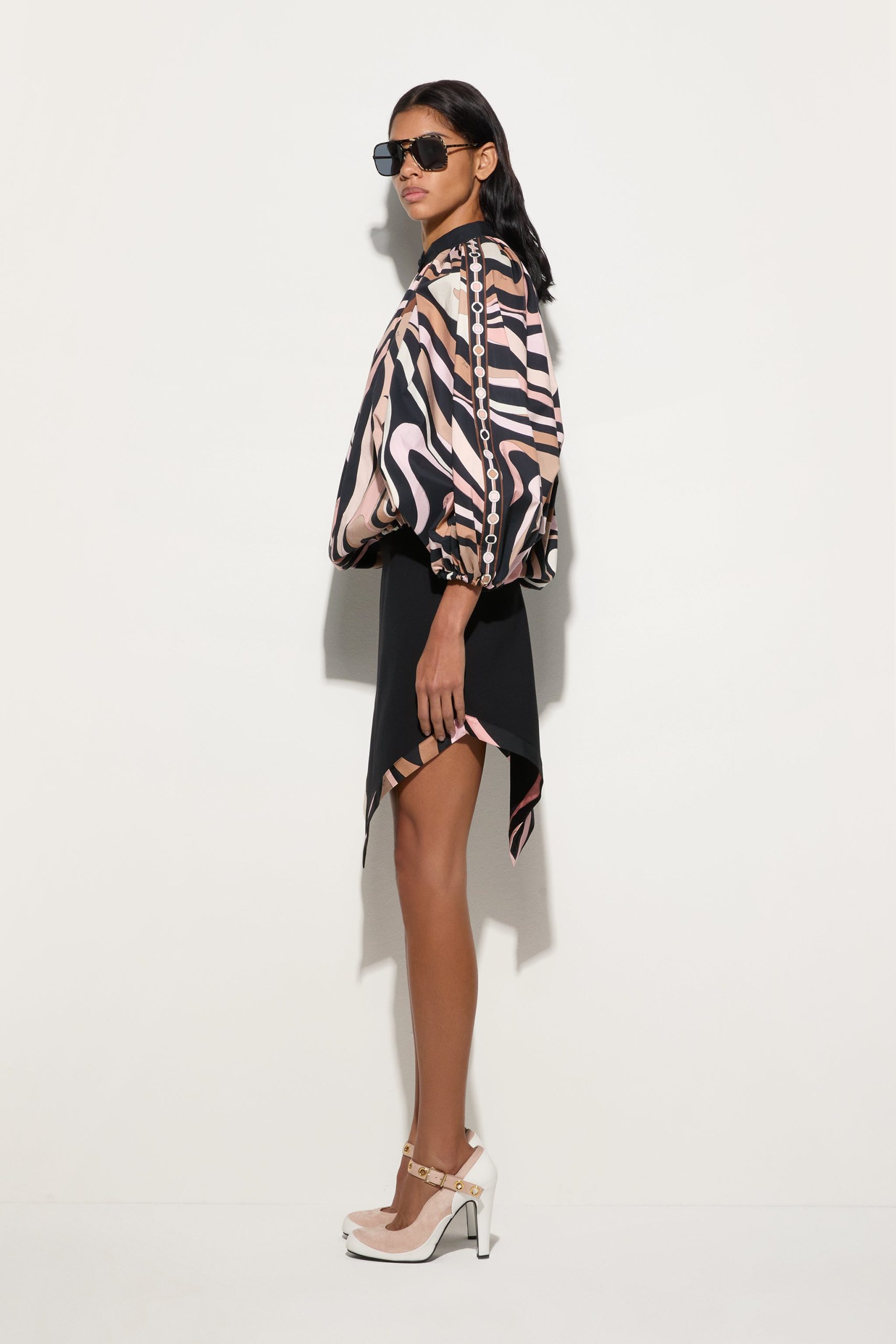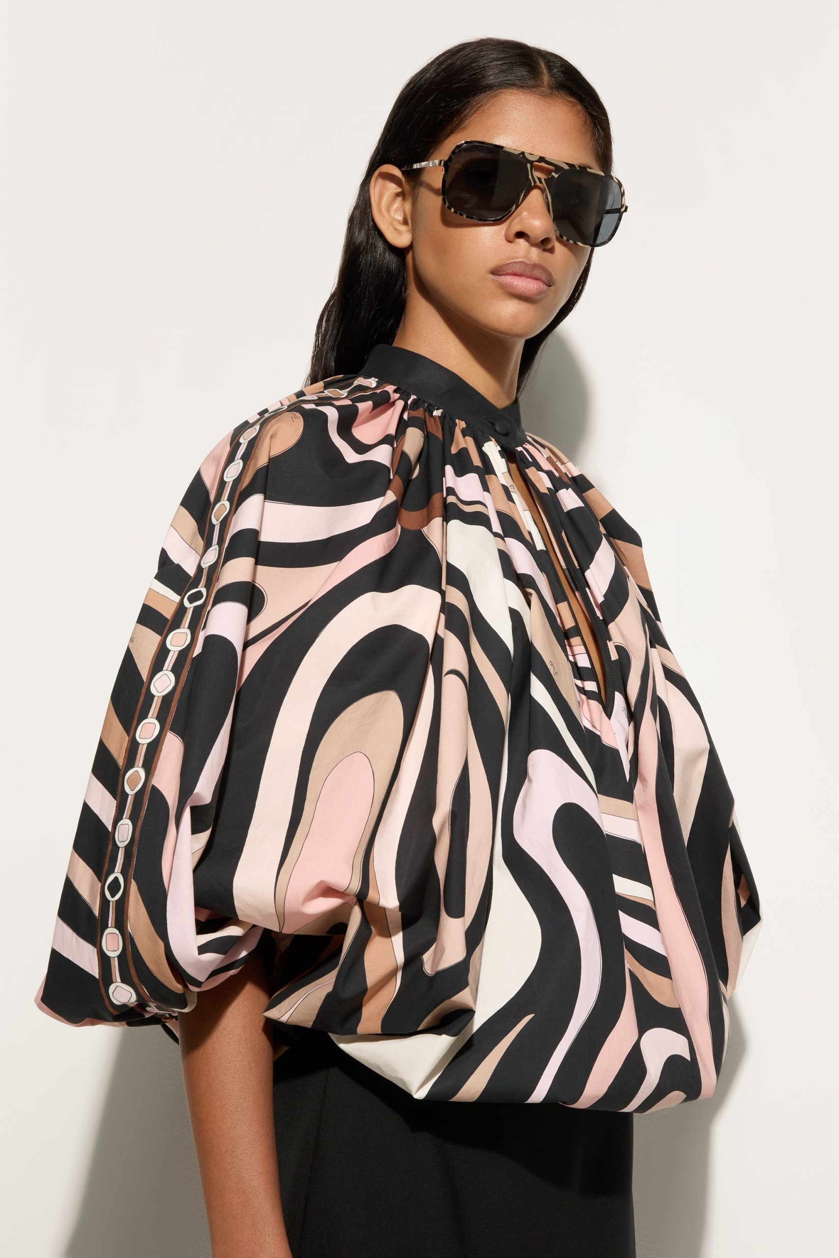 A garment that combines lightness and character, perfect for those who love a refined yet effortless style. This voluminous blouse, with its mandarin neckline and teardrop-shaped eyelet opening, adds a feminine and sophisticated touch to any outfit. The rounded sleeves, which elegantly cinch in at the forearm, create an interplay of proportions that enhances the garment’s unique design.Made of lightweight cotton poplin with a soft-touch finish, it is decorated with the iconic Marmo print in Black/Nude, a symbol of Pucci’s distinctive aesthetic.