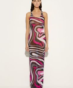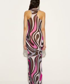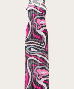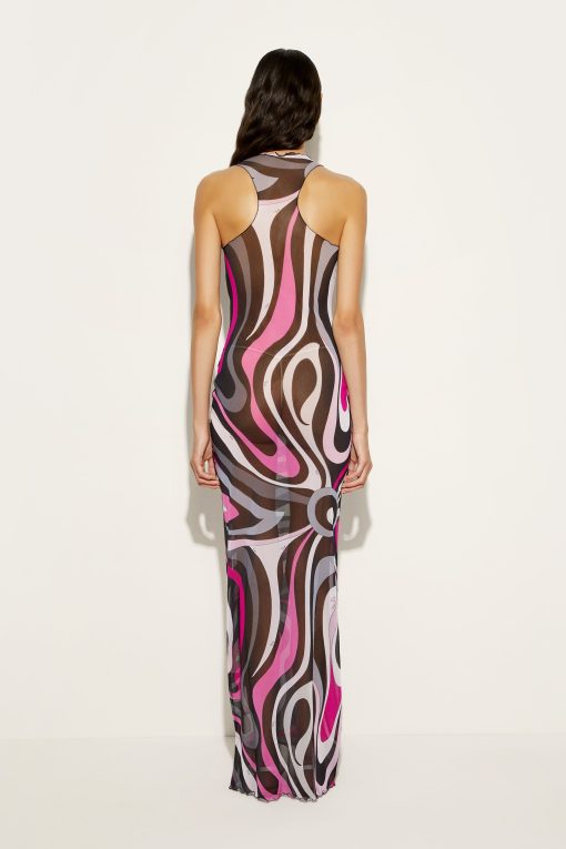 A long dress that blends simplicity and elegance, a sensual contemporary mermaid costume. With its round neckline, straight cut and sleevelessness, this garment fits naturally to the silhouette, enveloping the body like a second skin. Made of a lightweight stretch tulle that combines comfort and style, it is further enhanced by the iconic Marmo print, which adds movement and vibrancy to the design, making this dress ideal for special occasions or elegant evenings.