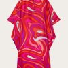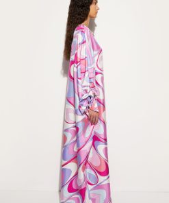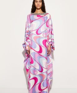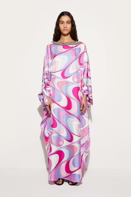 This kaftan is a playful take on Pucci’s signature billowing silhouettes. It’s decorated with the Onde print and fitted with self-tie cuffs that can be styled into bows. The crystal-embellished collar creates the illusion of a necklace and adds a characteristically playful spin.
