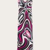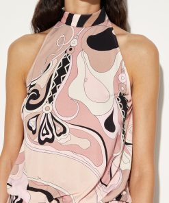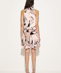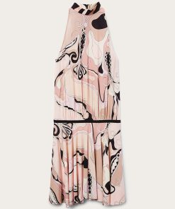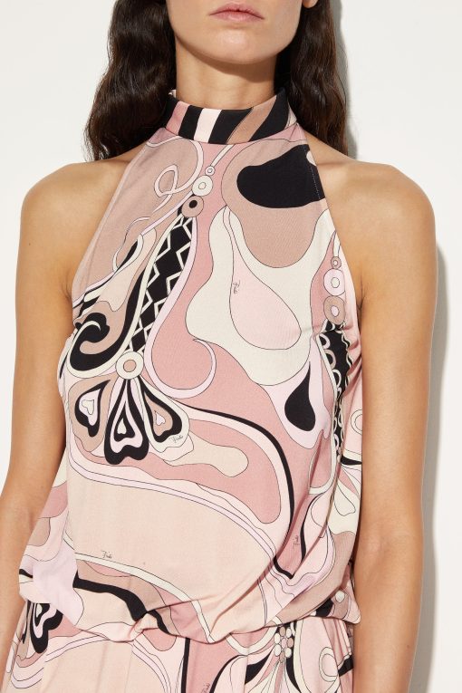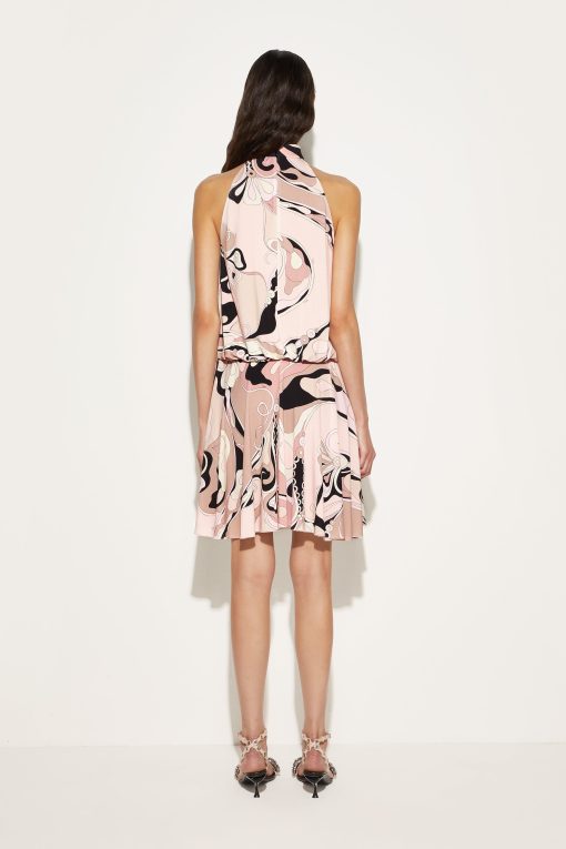 This fluid sleeveless dress features an American neckline that flatters the silhouette, while the defined waistline and short rounded pleated skirt add a fresh, romantic touch. Made of lightweight viscose jersey that is super soft to the touch, it is embellished with the 1966 Orchidees archival print, in which floral motifs move sinuously across the fabric, giving the garment a timeless appeal. Ideal for daytime events or elegant evenings, it is a tribute to Pucci tradition and innovation.
