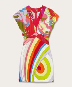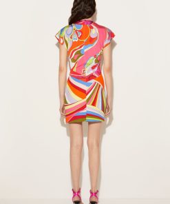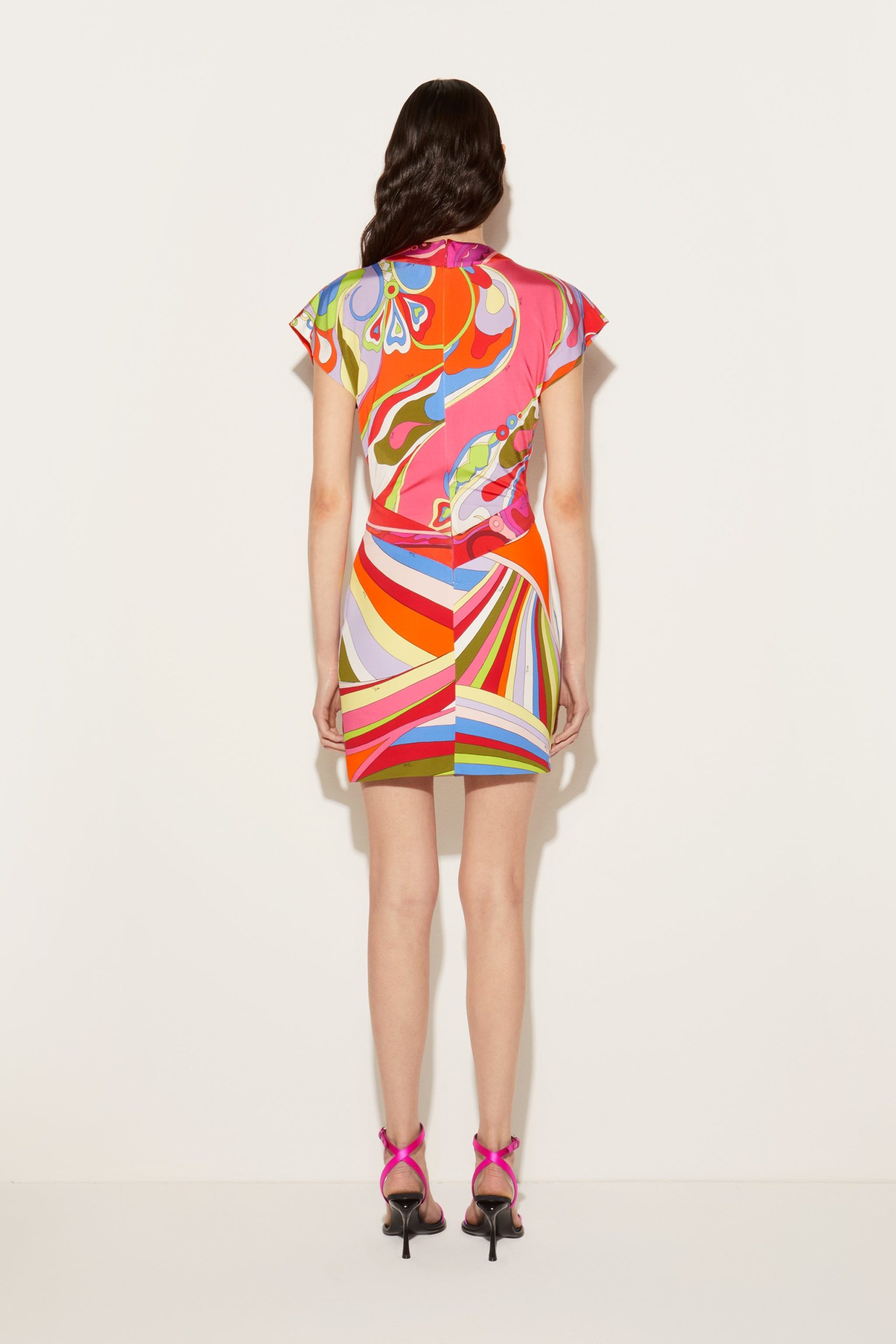 Pucci showcases its pattern mastery with this dress, which fuses the Orchidee and Iride prints in exuberant colour. The sleek V-neck silhouette is cut from jersey satin with short sleeves and a contoured waist panel.