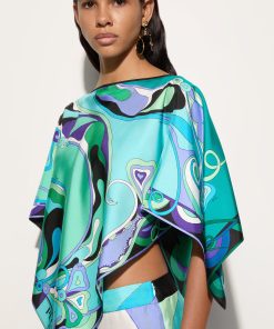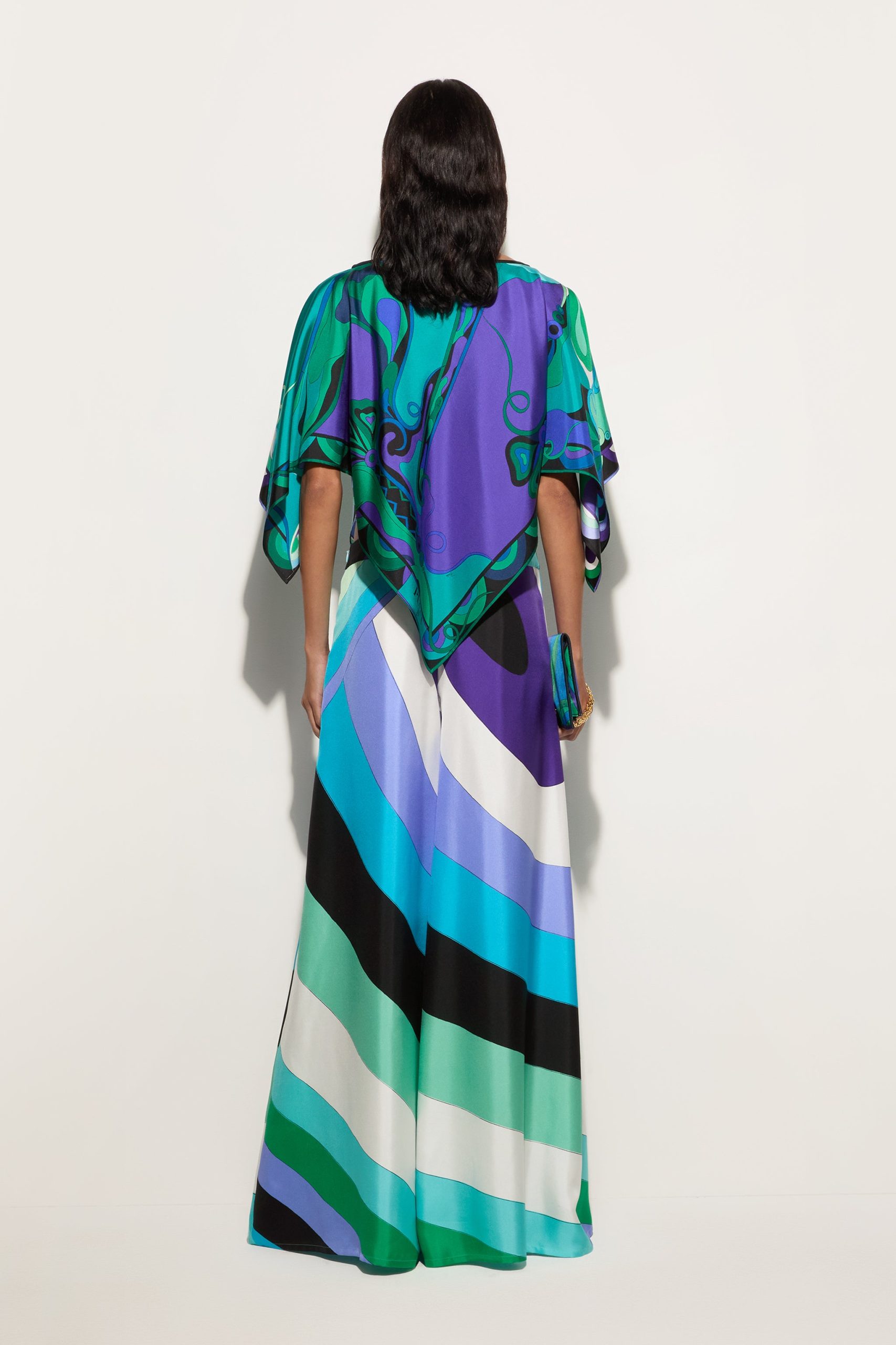 If you’re looking for a refined garment with a modern allure, this blouse is the perfect choice. Its boat neckline lends a natural elegance, while the cape design creates a fluid and sophisticated movement. The waist closure with triangle hem adds a structured detail that lightly enhances the silhouette.This is enhanced by the Orchidee print in green and emerald hues, an iconic design with timeless appeal.