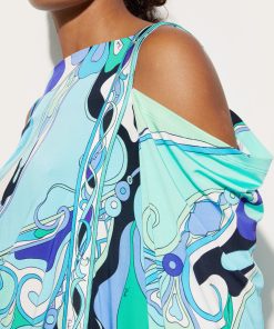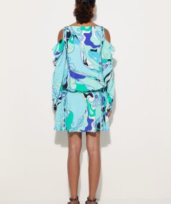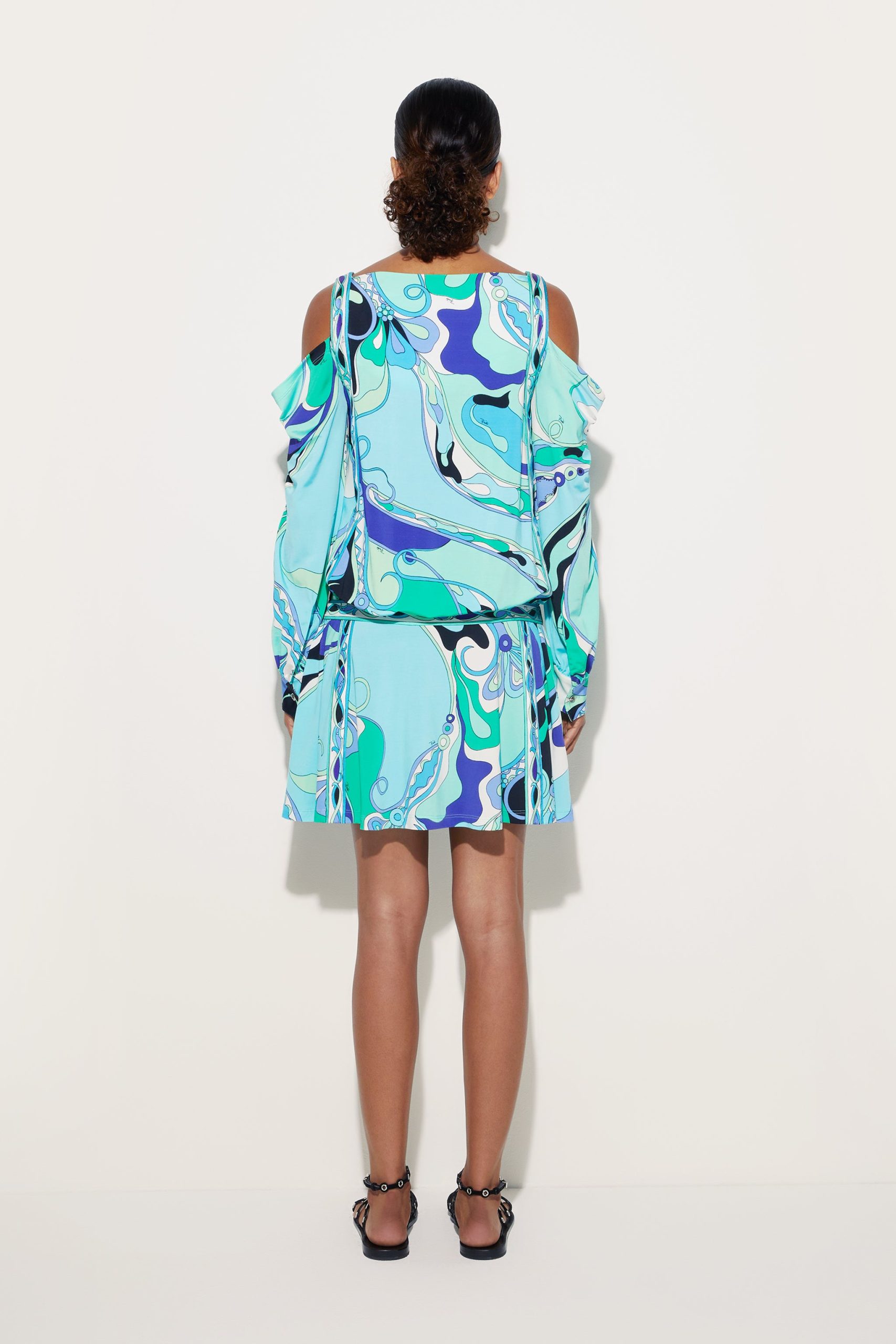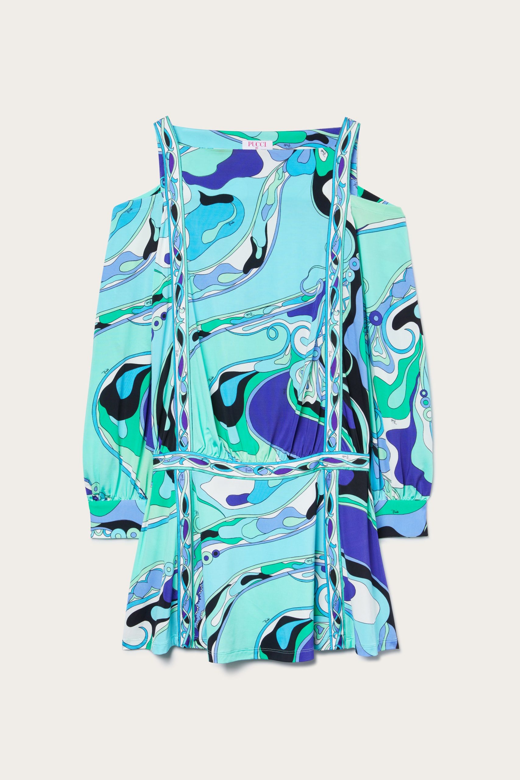 This flared mini dress is a masterpiece of elegance and femininity, designed to catch the eye with every step. With its flowing sleeves, exposed shoulders and well-defined waist, it offers a silhouette that pleasingly flatters the figure. Made of an innovative jersey, reinterpreted by the fashion house with Lycra yarns for a unique shine, the fabric takes center stage with an archival print from 1966. Floral motifs of stylized Orchidees dance harmoniously, creating a fluid, sinuous effect that recalls Pucci’s timeless sophistication. Perfect for elegant evenings or special events, this dress celebrates the fusion of tradition and contemporaneity.