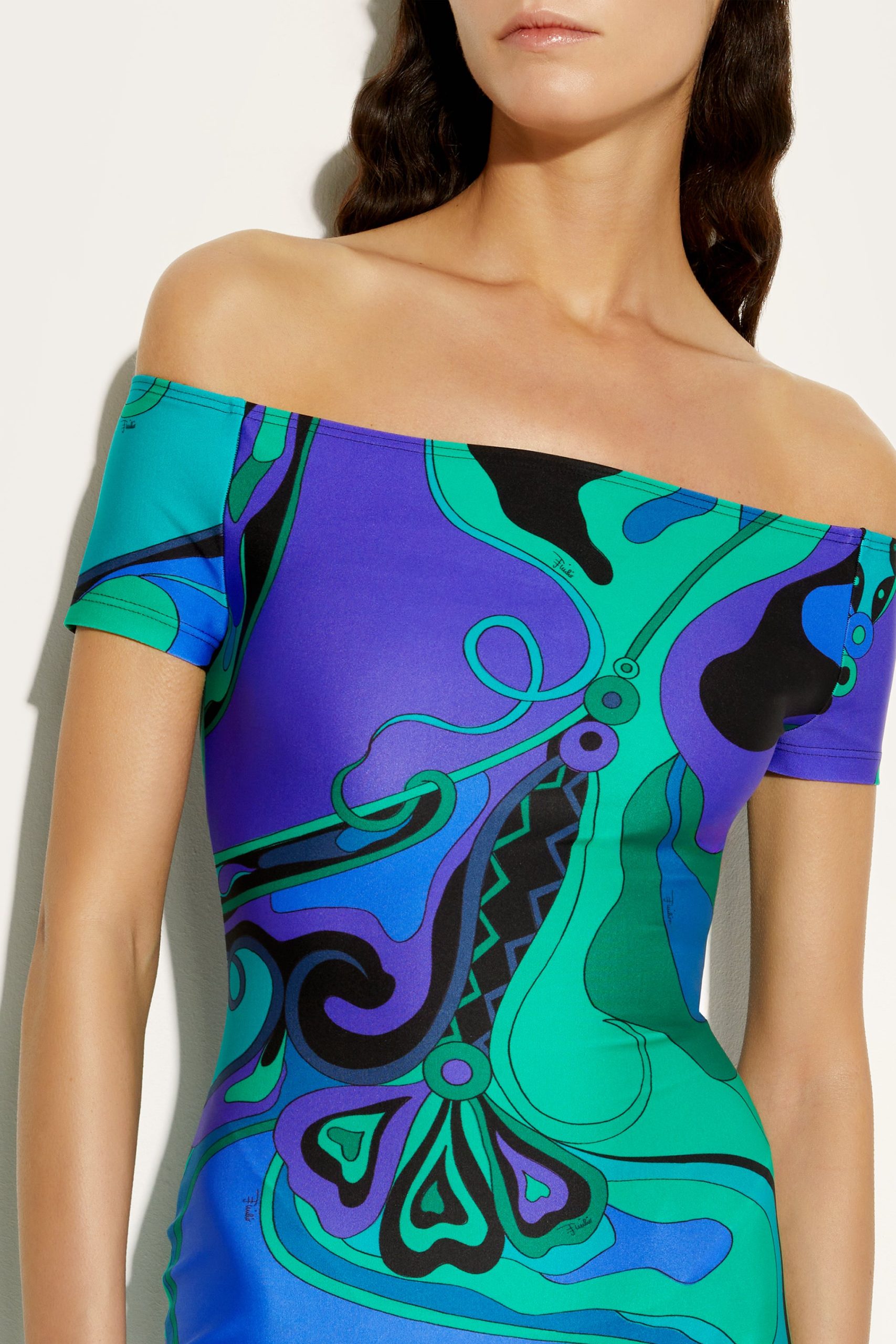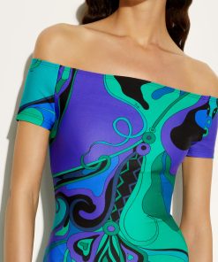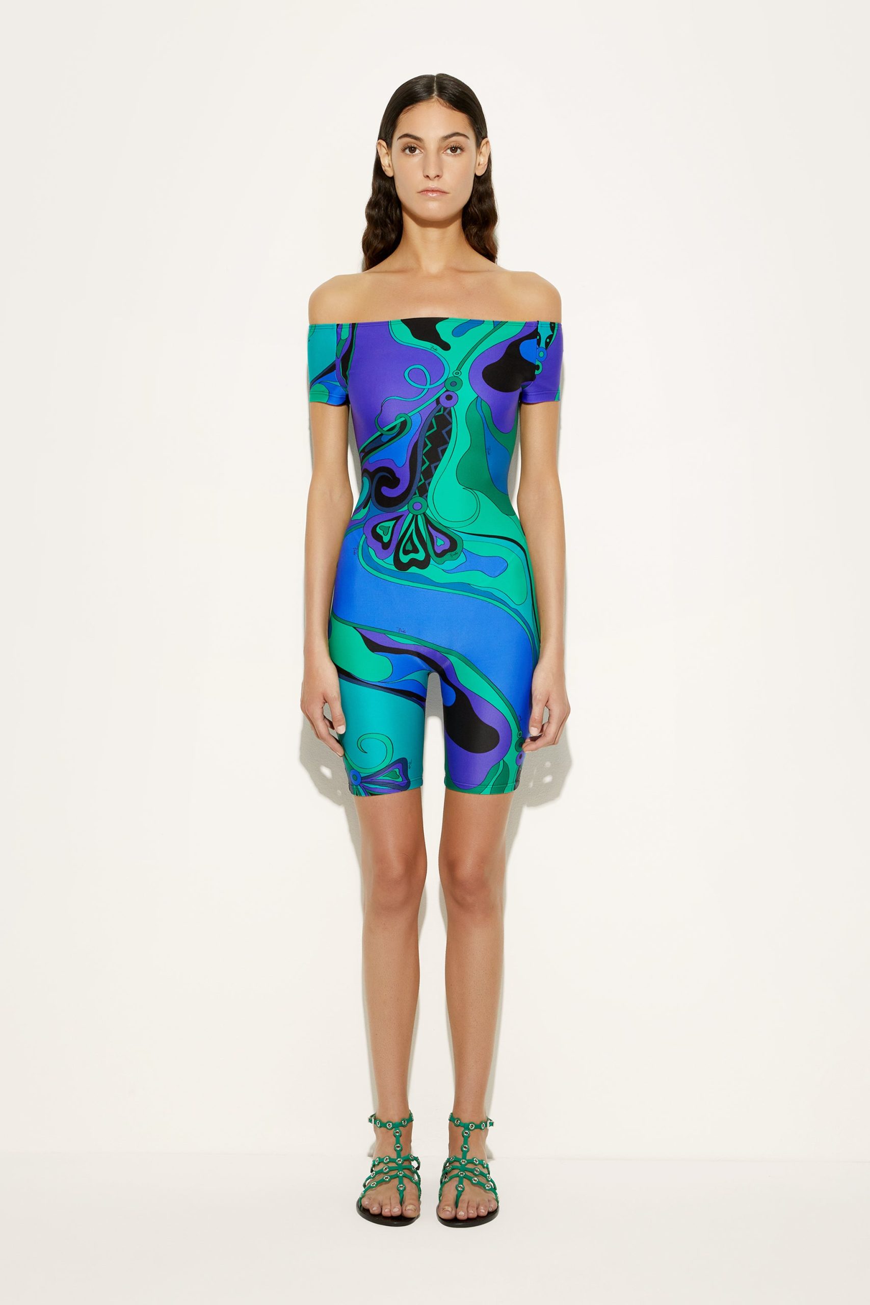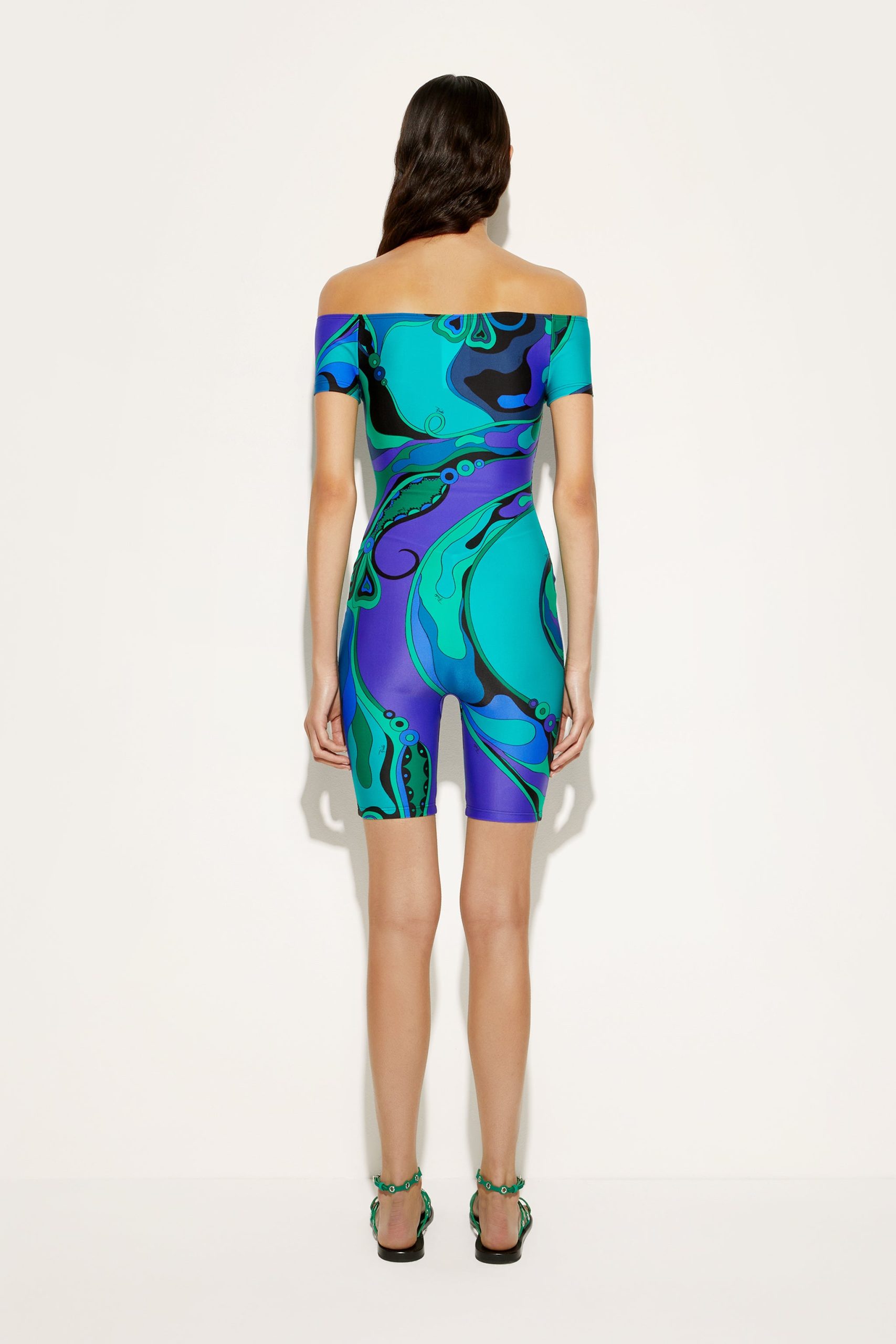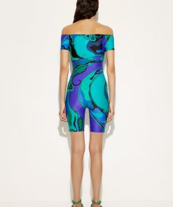 This jumpsuit with cycling shorts is ideal for those who love a sporty yet sophisticated look, whether for training or for tackling a day of relaxation with a glamorous twist. The Orchideeee print, an iconic archival pattern from 1966, transforms the fabric into a true work of art in which stylized flowers move fluidly across the stretchy lycra, evoking energy and lightness.Strapless and with short sleeves, it is designed for a snug and comfortable fit. The UV treatment adds extra protection, making it perfect for outdoor activities as well. Wear it with a pair of sneakers for a sport-chic look or with high-heeled sandals to launch you straight into the Olympus of Pucci gods.