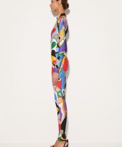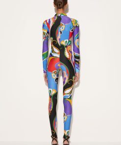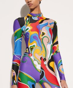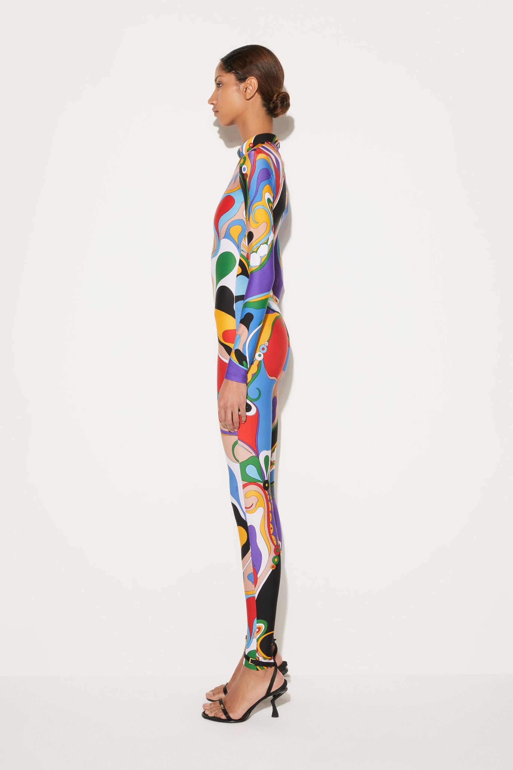 This jumpsuit marries vibrant hues with the Orchidee print’s flourishing forms. It’s cut from glossy Lycra to a sleek, bodycon silhouette with a subtly padded mock neck.