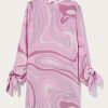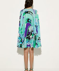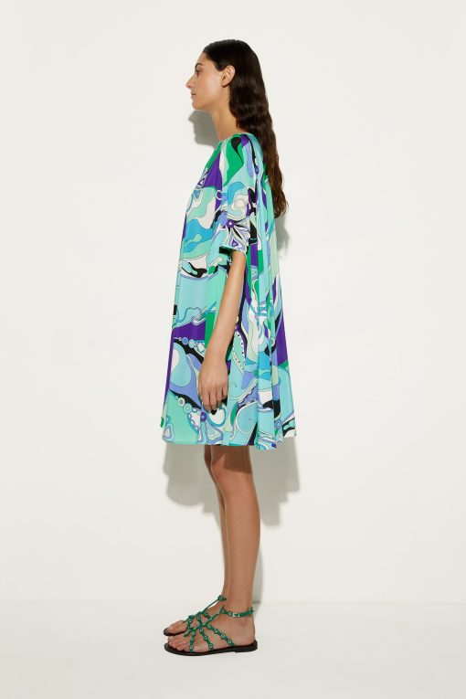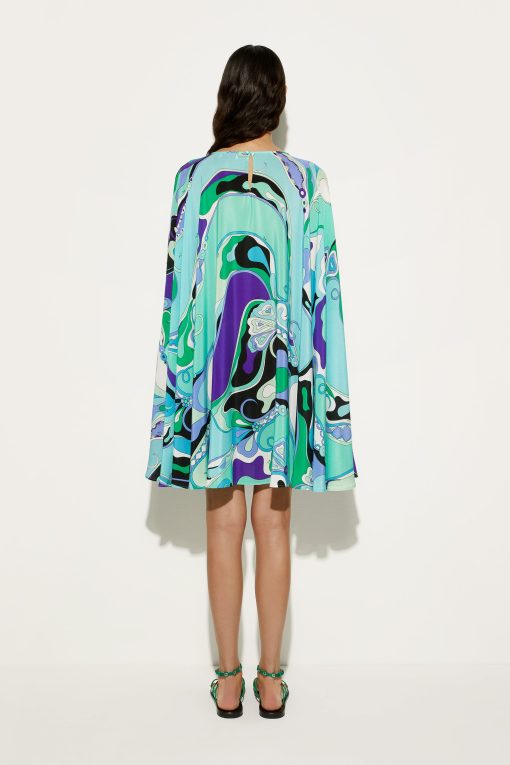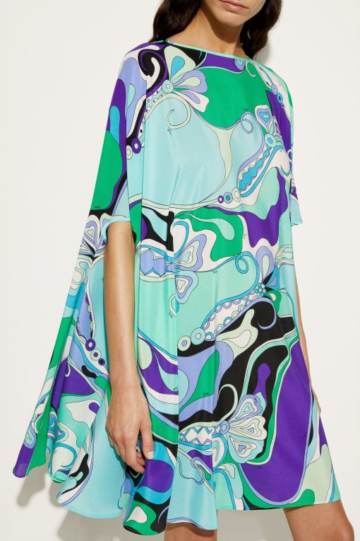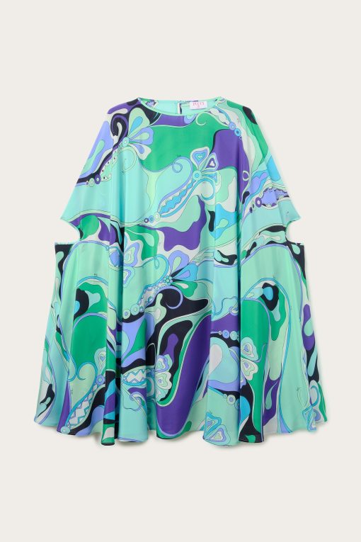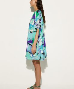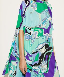 The contemporary interpretation of a style icon. This mini kaftan enhances lightness and elegance with a fluid silhouette and printed details that accentuate its fresh and feminine character. Made of silk crepe de chine with the Orchidee print in green and lilac, this garment is able to brighten up the look with its graphic dynamism, making it perfect for those seeking a sophisticated and assertive style.