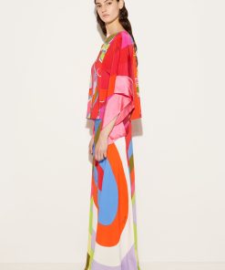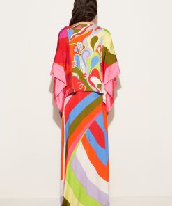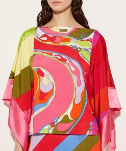 This kaftan top embodies Pucci’s celebration of fluid fabric and languid shapes, showcased through its gracefully draped sleeves. It’s cut with a signature boat neck and adorned with a striking rendition of the archival Orchidee print in vivid red and green tones.