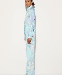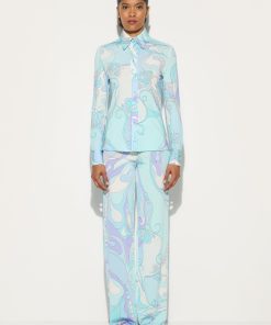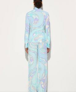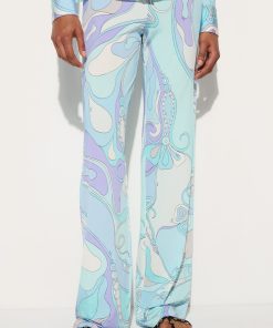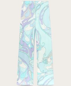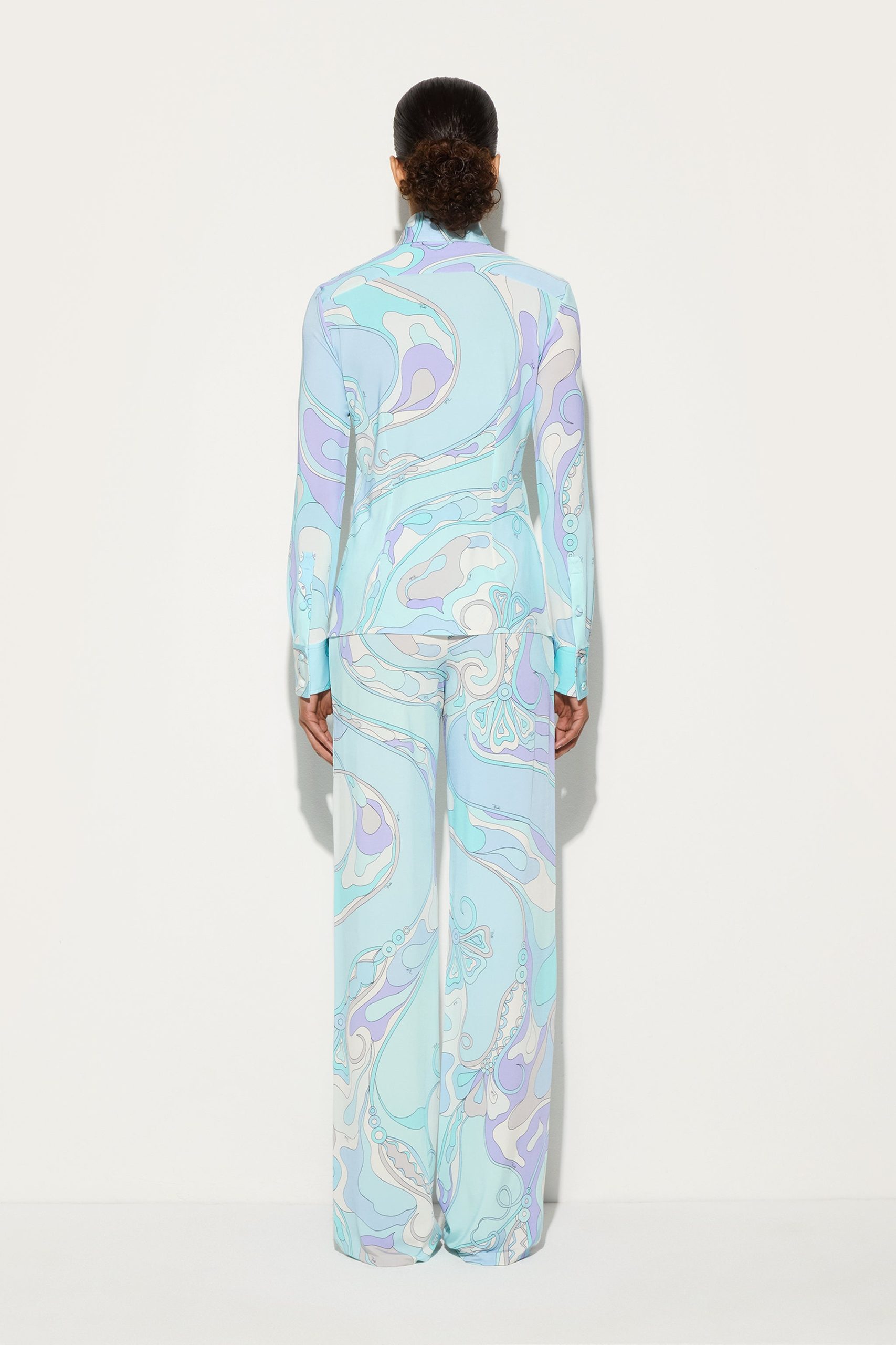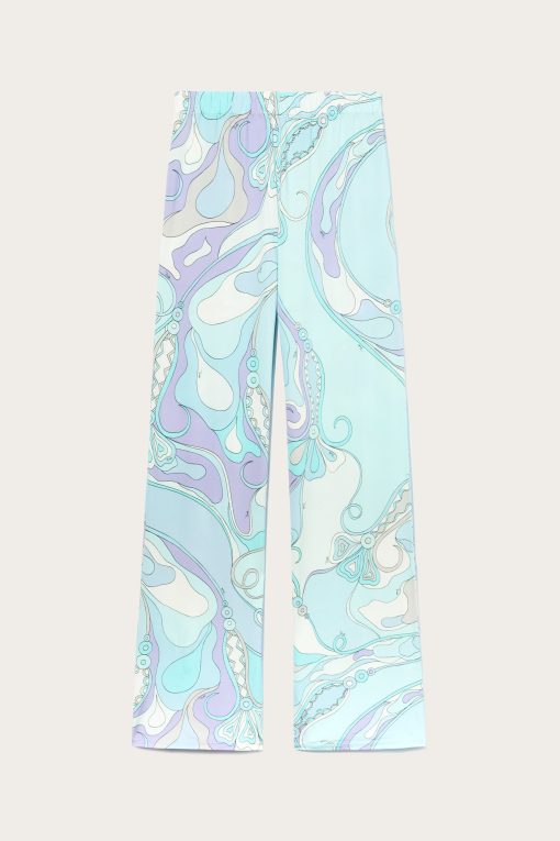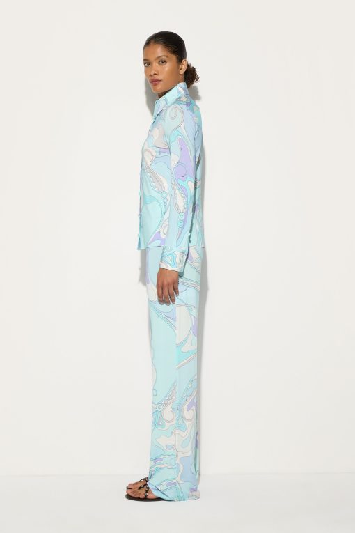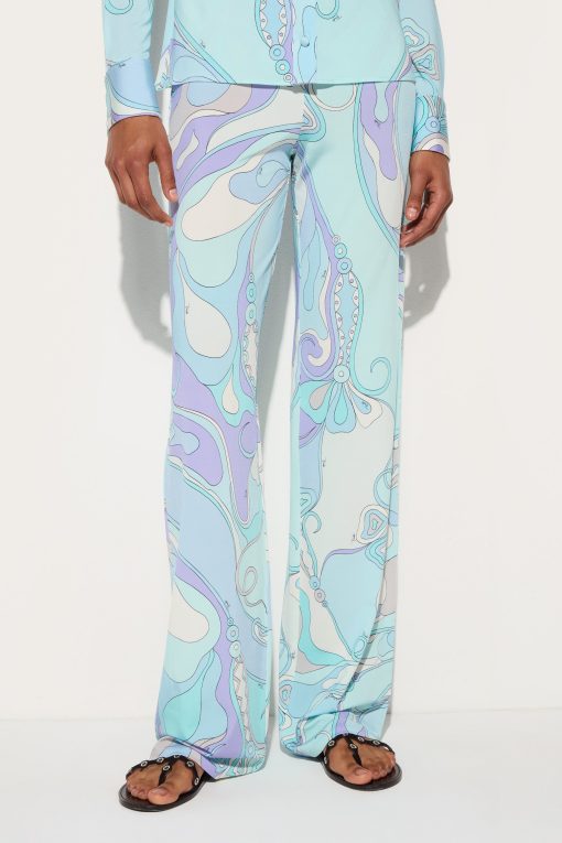 An exclusive selection of Pucci’s iconic garments in an unprecedented version of the Marmo and Orchidee prints in the most delicate shades of aqua. A combination of craftsmanship, color and identity.An essential garment that combines simplicity and sophistication, perfect for any occasion. These straight-cut, mid-rise pants enhance the figure with elegance, while the jersey fabric, reinterpreted with the iconic Pucci touch, gives a unique sheen.