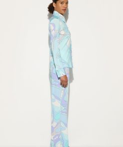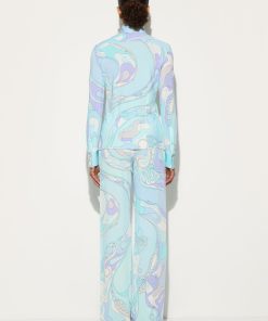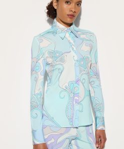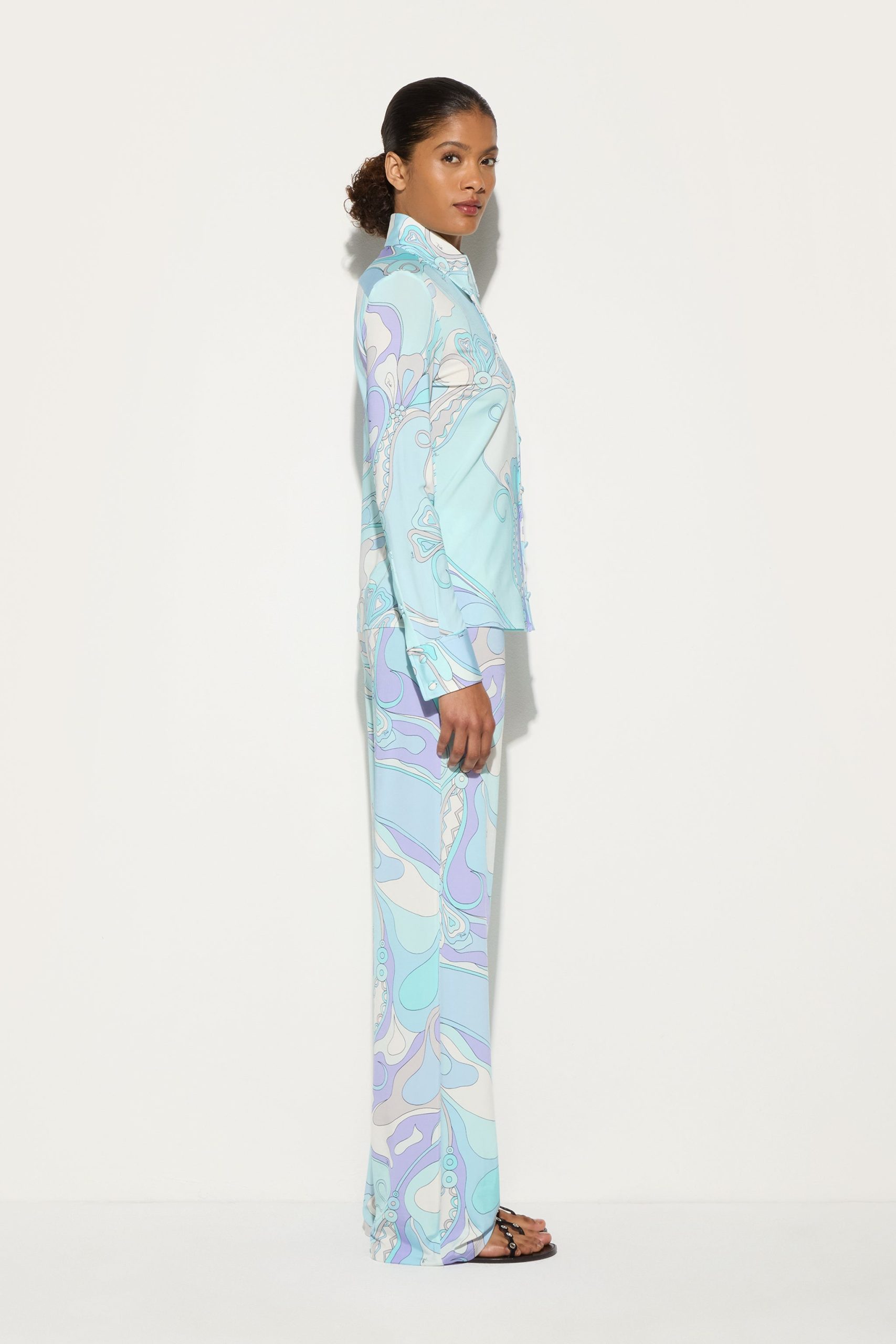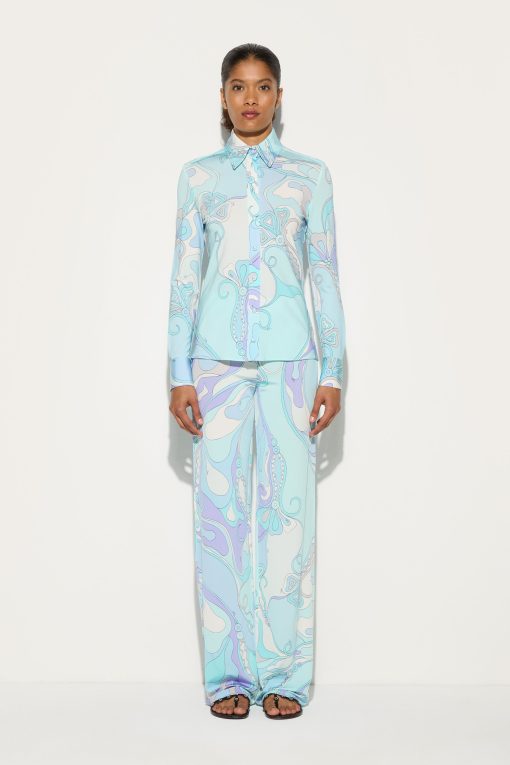An exclusive selection of Pucci’s iconic garments in an unprecedented version of the Marmo and Orchidee prints in the most delicate shades of aqua. A combination of craftsmanship, color and identity.A timeless classic revisited with a modern twist. This button-down shirt, with its fitted fit and structured collar, is designed for those who love a refined yet contemporary style. The long sleeves and satin jersey enhance every movement, while the Orchidee print adds delicate, feminine elegance.