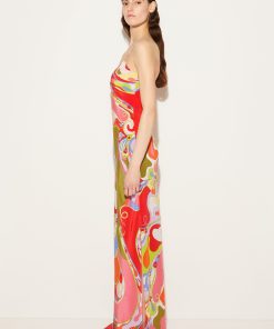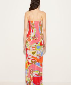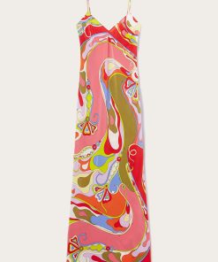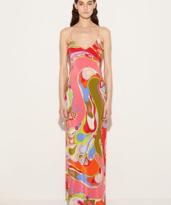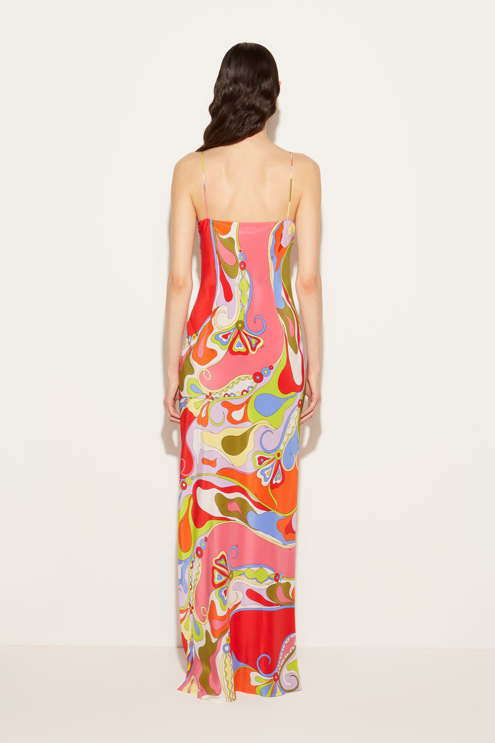 This dress is Pucci’s riff on a classic slip style. It’s cut from fluid silk crepe de chine that’s decorated with the Orchidee print’s sweeping swirls and flowers. The high side splits create billowing movement with each step.