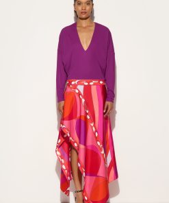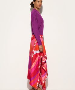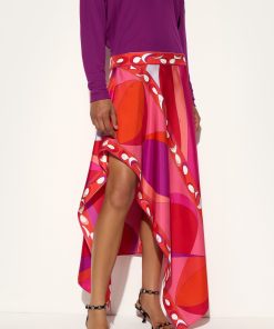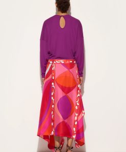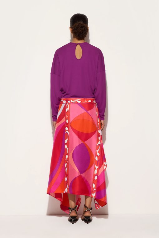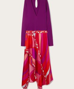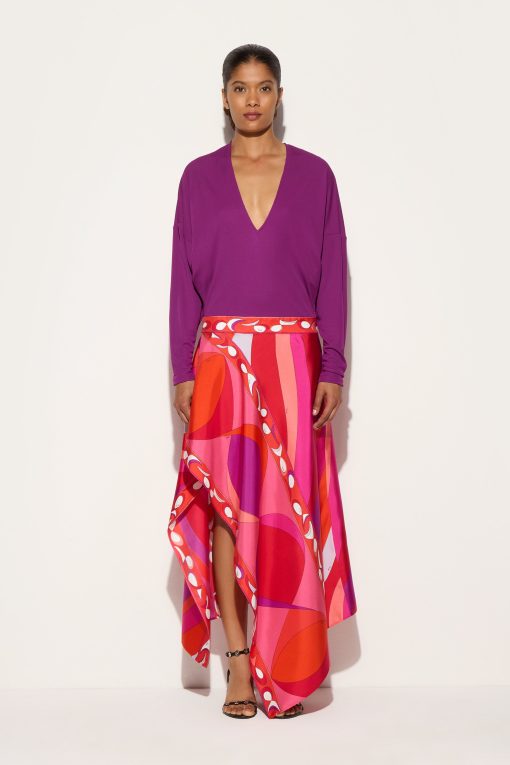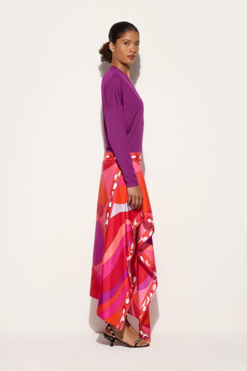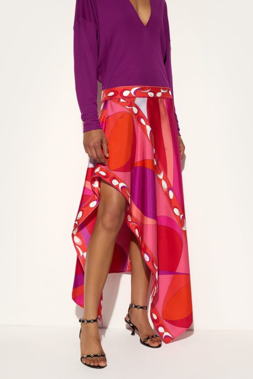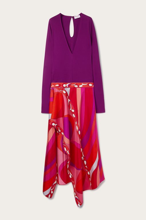 A dress that captures timeless elegance with a dynamic twist. The cape sleeves add movement and give an extremely refined effect to the outfit, which becomes perfect for special occasions or elegant evenings. The iconic Pesci print, declined in brilliant Ibiscus Fané nuances, along with the asymmetric hemline complete the look, making this dress a true masterpiece of Pucci style and craftsmanship.