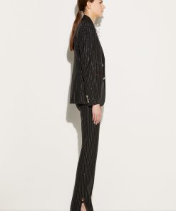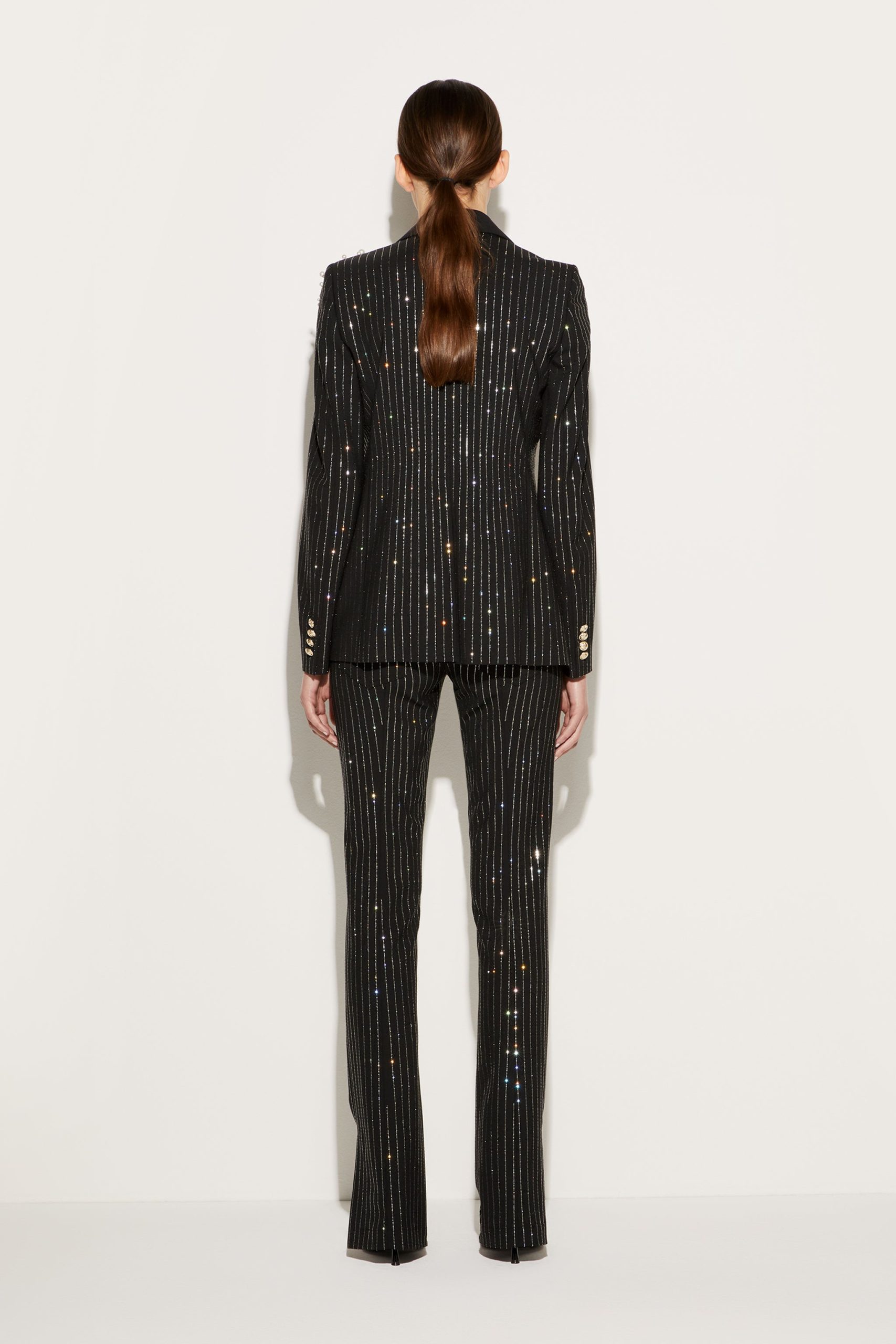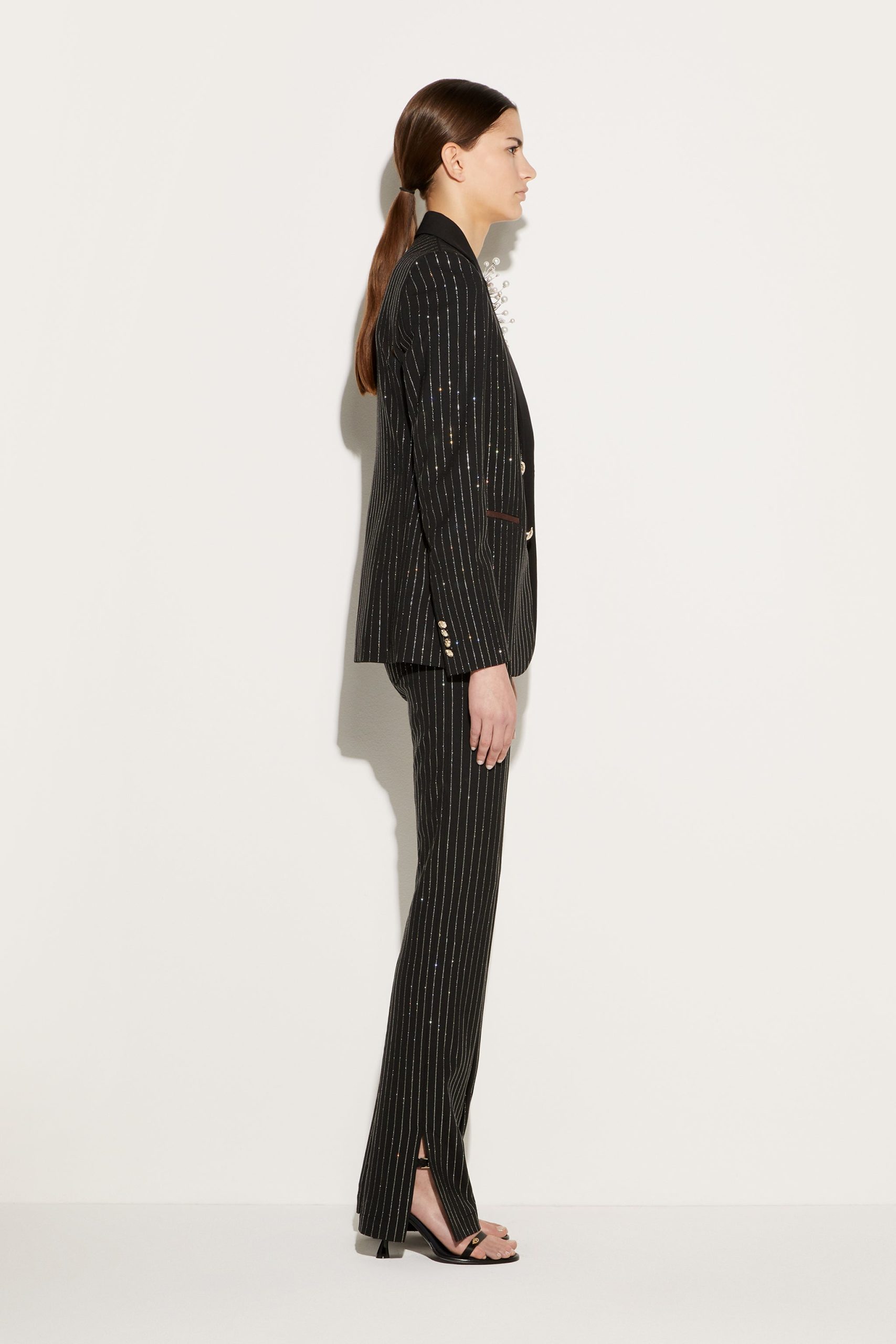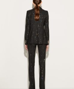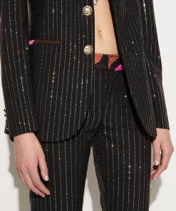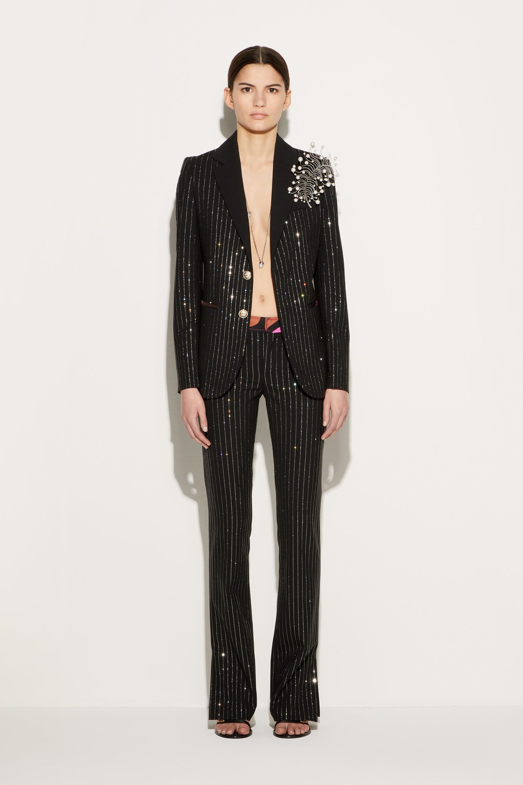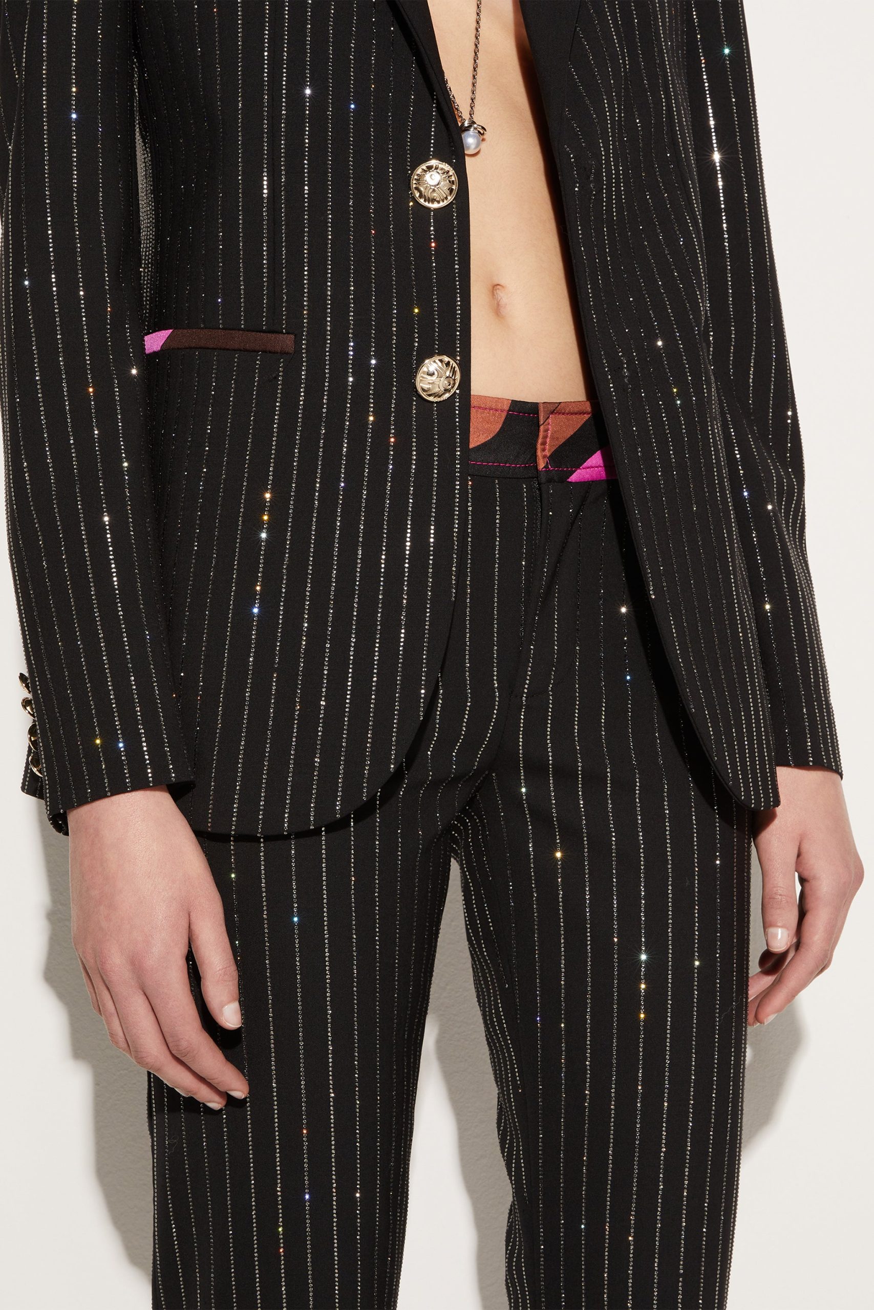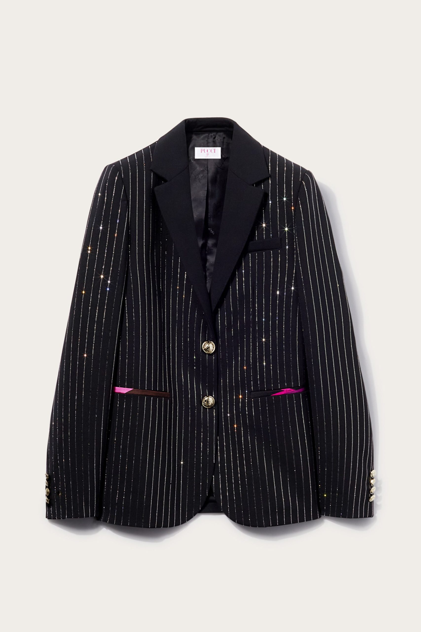 Camille Miceli covers this single-breasted blazer with glimmering pinstripes in a playful Pucci twist on traditional tailoring. The side pockets are trimmed with the storied Iride print, and Marmo-engraved gold-tone buttons complete the high-octane design.